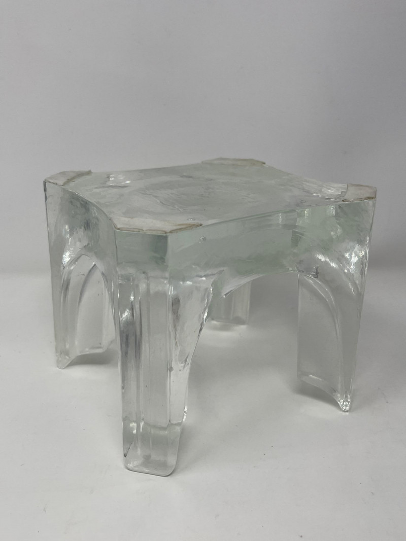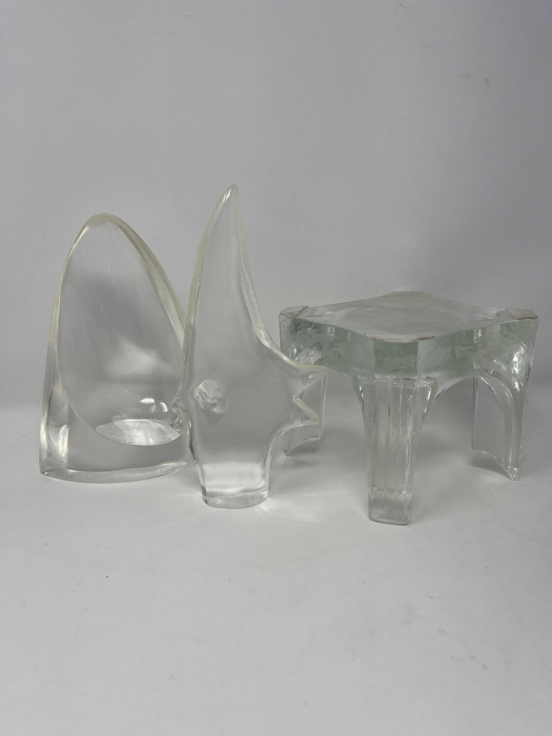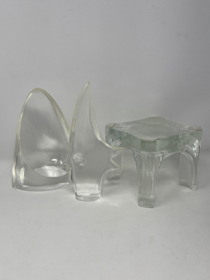 Exquisite Collection of Acrylic & Glass Art Pieces, 4.75 - 7.5” H Discover the understated elegance of this curated set of acrylic and glass sculptures, each piece a testament to modern design. This collection spans approximately 4.75 to 7.5 inches in height and features an array of designs including a sharp, angular acrylic sculpture evocative of an iceberg, a smooth acrylic teardrop, and a sturdy acrylic glass stool. Each piece exhibits unique clouding and cracks, contributing to its distinctive character. Ideal for collectors and decorators seeking art pieces that merge form with function, this set offers a remarkable opportunity to enhance any living space with modern artistry and a hint of imperfection.