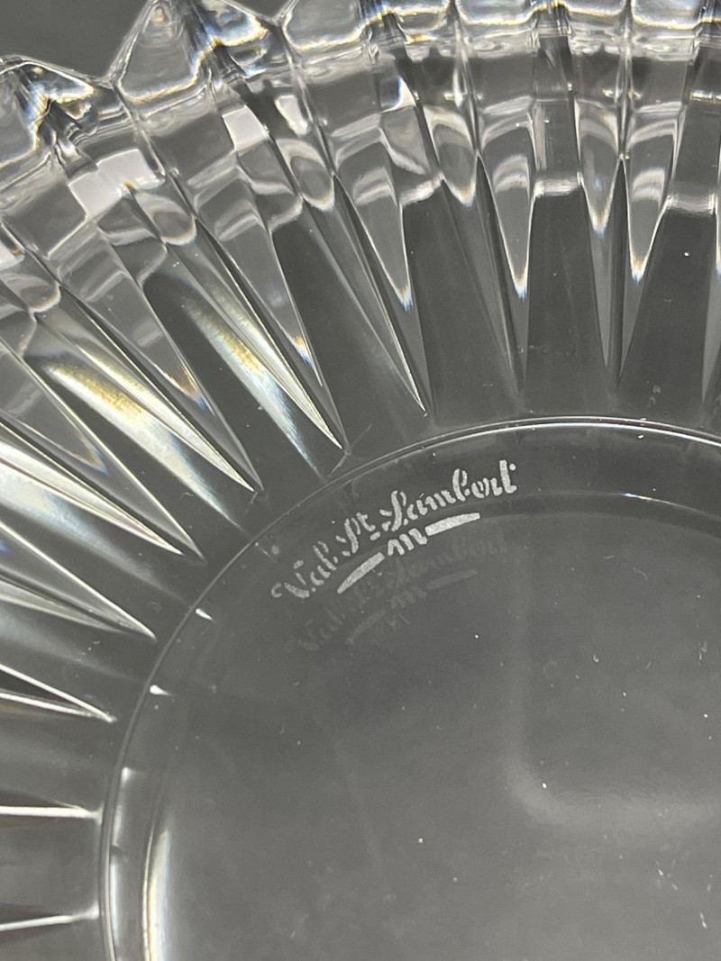 Exquisite Val Saint Lambert & Waterford Crystal Bowls Enhance your collection with these luxurious crystal bowls from two of the world's renowned makers: Val Saint Lambert and Waterford. This set includes a large Val Saint Lambert crystal bowl measuring 9.75 inches in diameter by 4 inches in height, featuring a deep cut design that radiates brilliance and depth. Accompanying it is a Waterford crystal bowl, sized at 6.25 inches by 3.5 inches, showcasing intricate patterns that capture and reflect light beautifully. Both pieces are marked with their respective makers, confirming their authenticity and esteemed heritage. Ideal for discerning collectors or as a gift to elevate any home's decor, these bowls are treasures of craftsmanship and elegance.