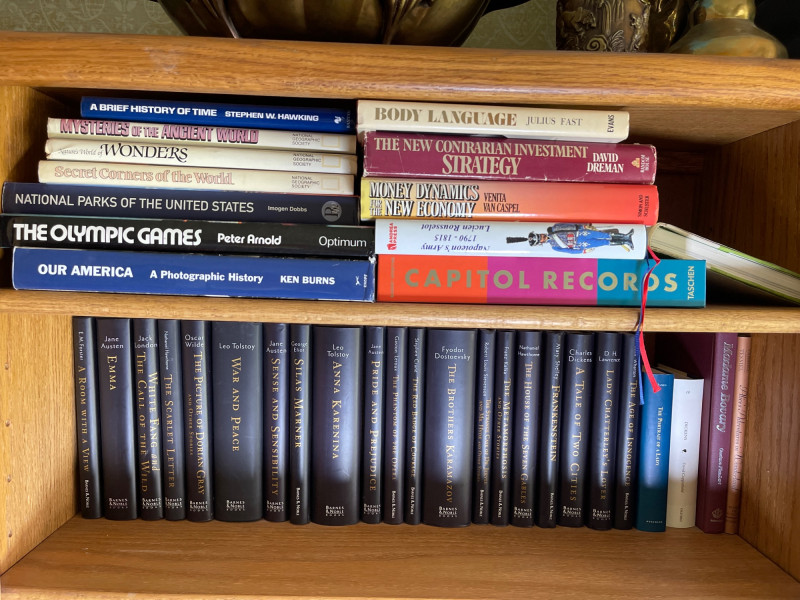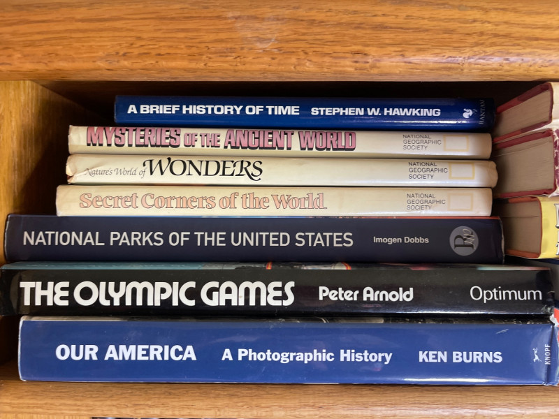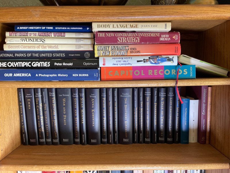 Classics, History, Science & More - Diverse Literary Treasure Trove Dive into this expansive collection of books, a treasure trove for any reader or collector. This diverse selection spans classic literature, intriguing science, captivating history, and essential reference works. Highlights include timeless classics from Barnes & Noble like 'War and Peace,' 'Pride and Prejudice,' and 'The Scarlet Letter,' alongside stimulating reads such as Stephen Hawking's 'A Brief History of Time' and Ken Burns' 'Our America.' This set also features fascinating explorations into the Olympic Games, National Parks of the United States, and 'Mysteries of the Ancient World.' Whether you're looking to expand your knowledge or escape into new worlds, this collection has something for everyone. Perfect for enriching any personal library or gifting to a passionate bibliophile.