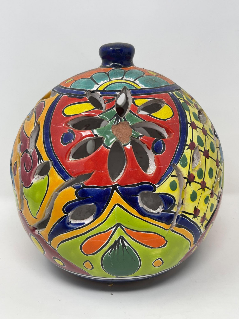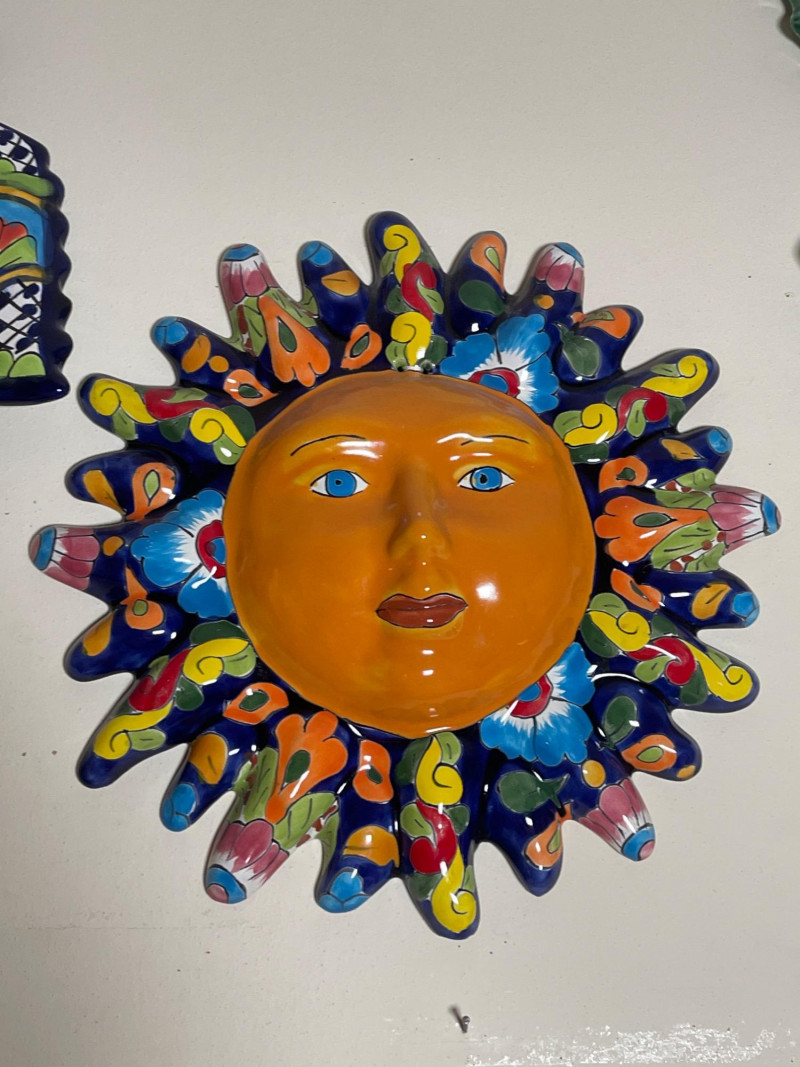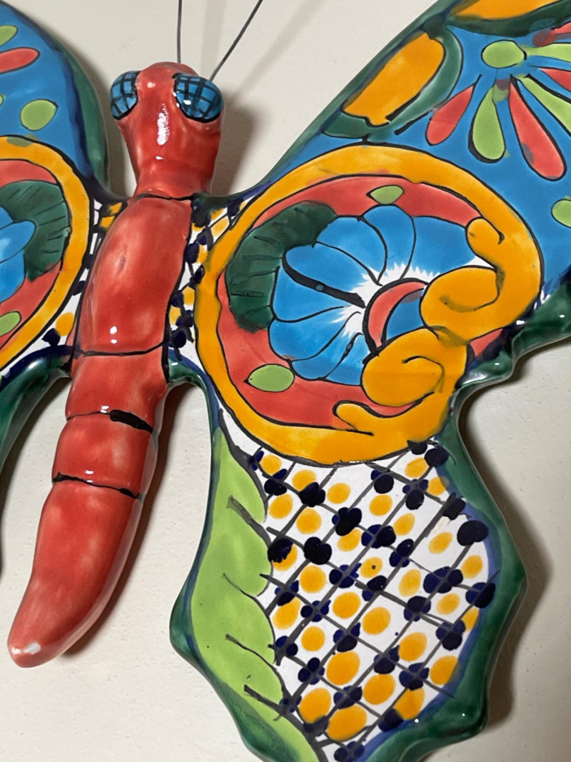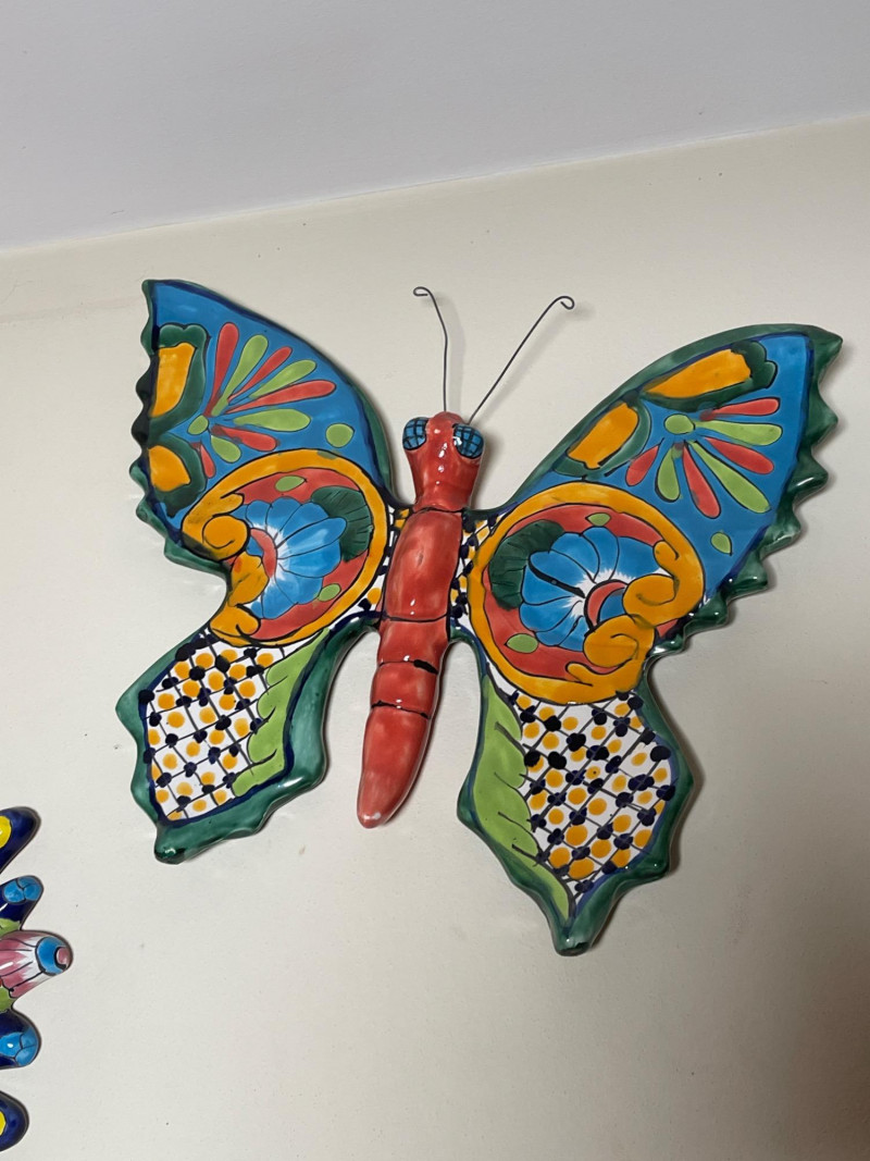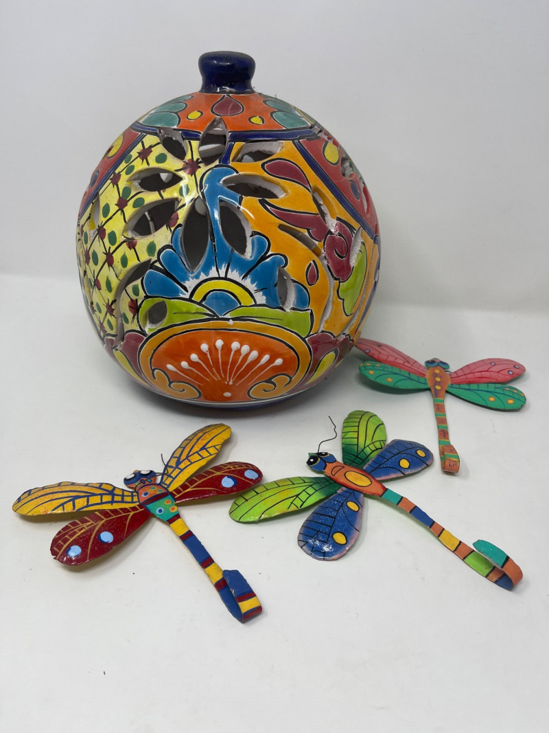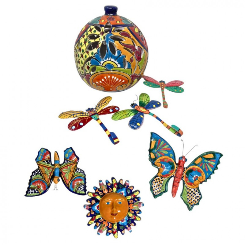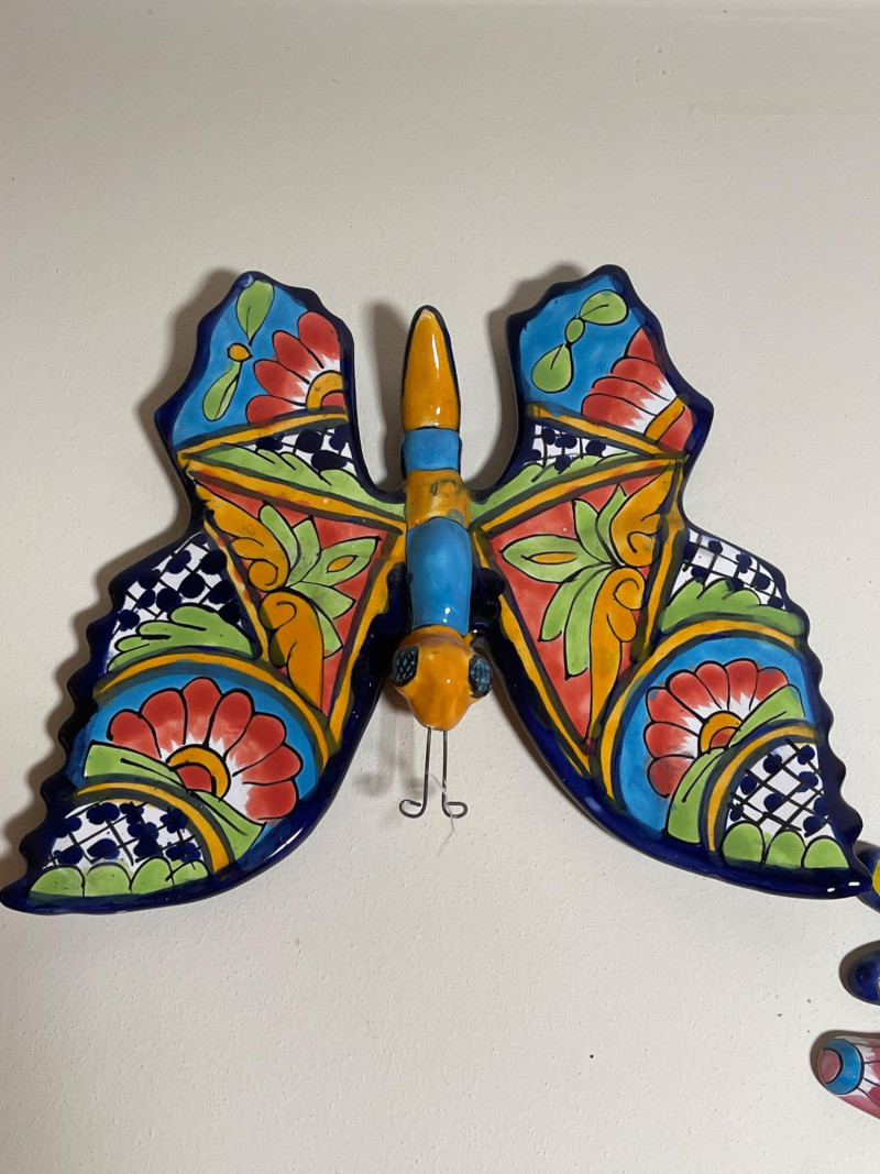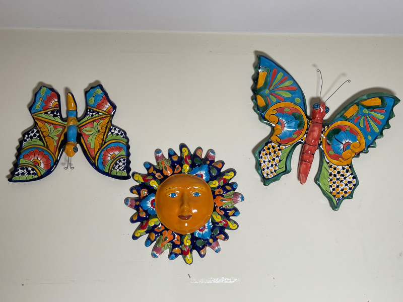 Hand-Painted Mexican Porcelain Collage Assorted Decor - Sun, Butterflies & Dragonflies This vibrant set features three hand-painted porcelain pieces from Mexico, creating a unique "collage" effect with their diverse patterns and colors. The set includes a whimsical sun with a human-like face and two uniquely designed butterflies, each showcasing a rich tapestry of hand-painted details. Sphere has some chips from use. See photos. Ranging in height from approximately 10 to 15 inches, these pieces are ready to hang and will bring a cheerful and artistic flair to any space with their striking collage aesthetic.
