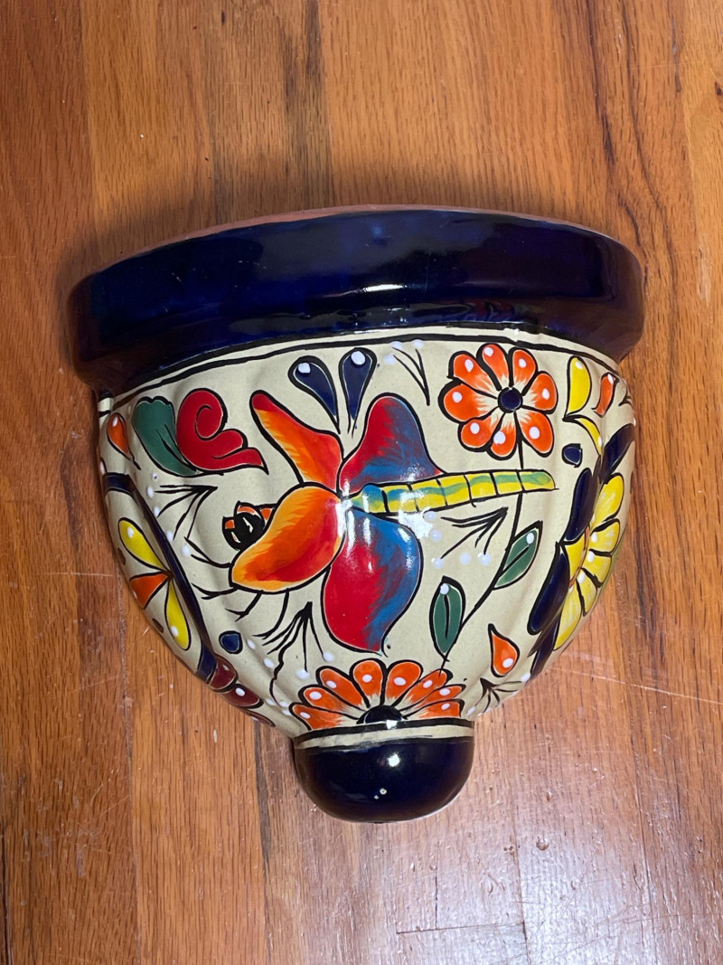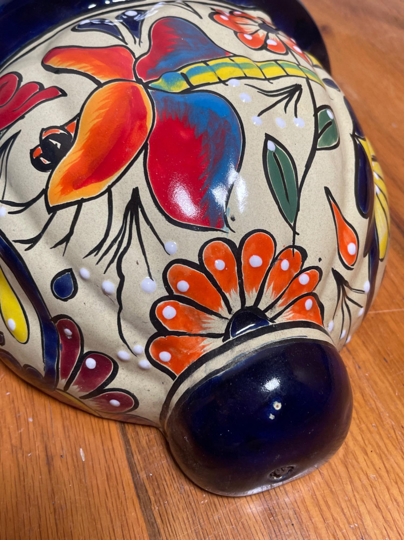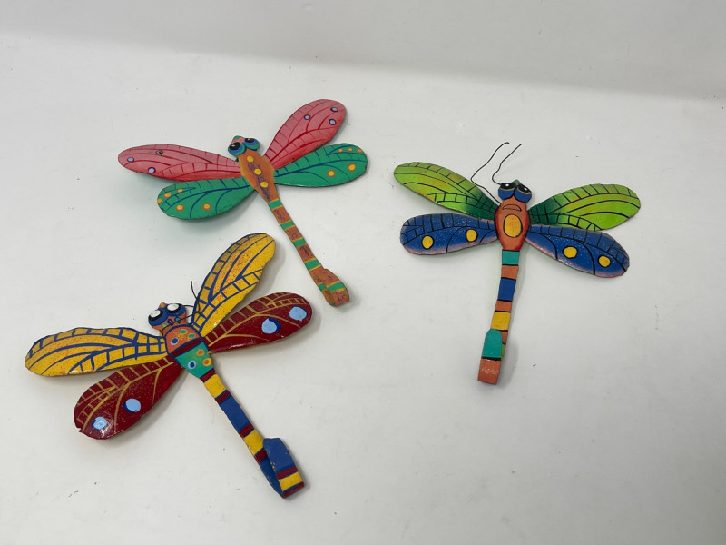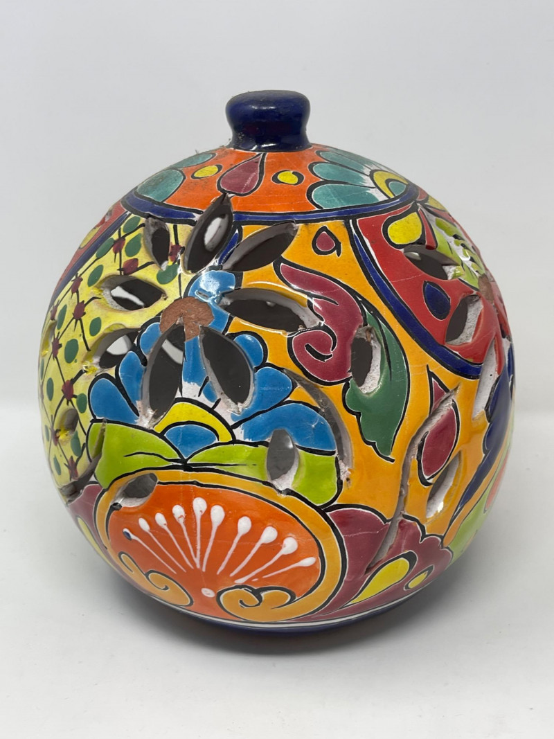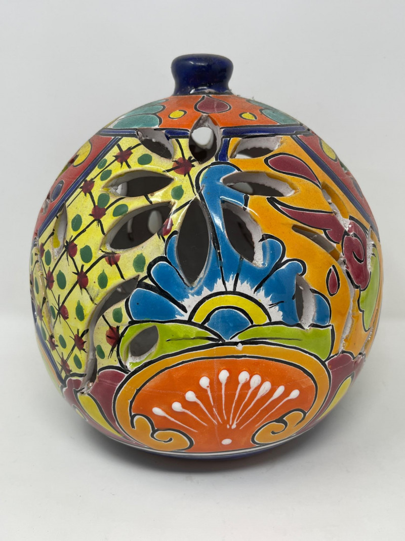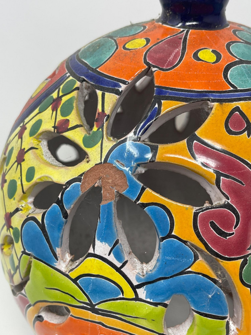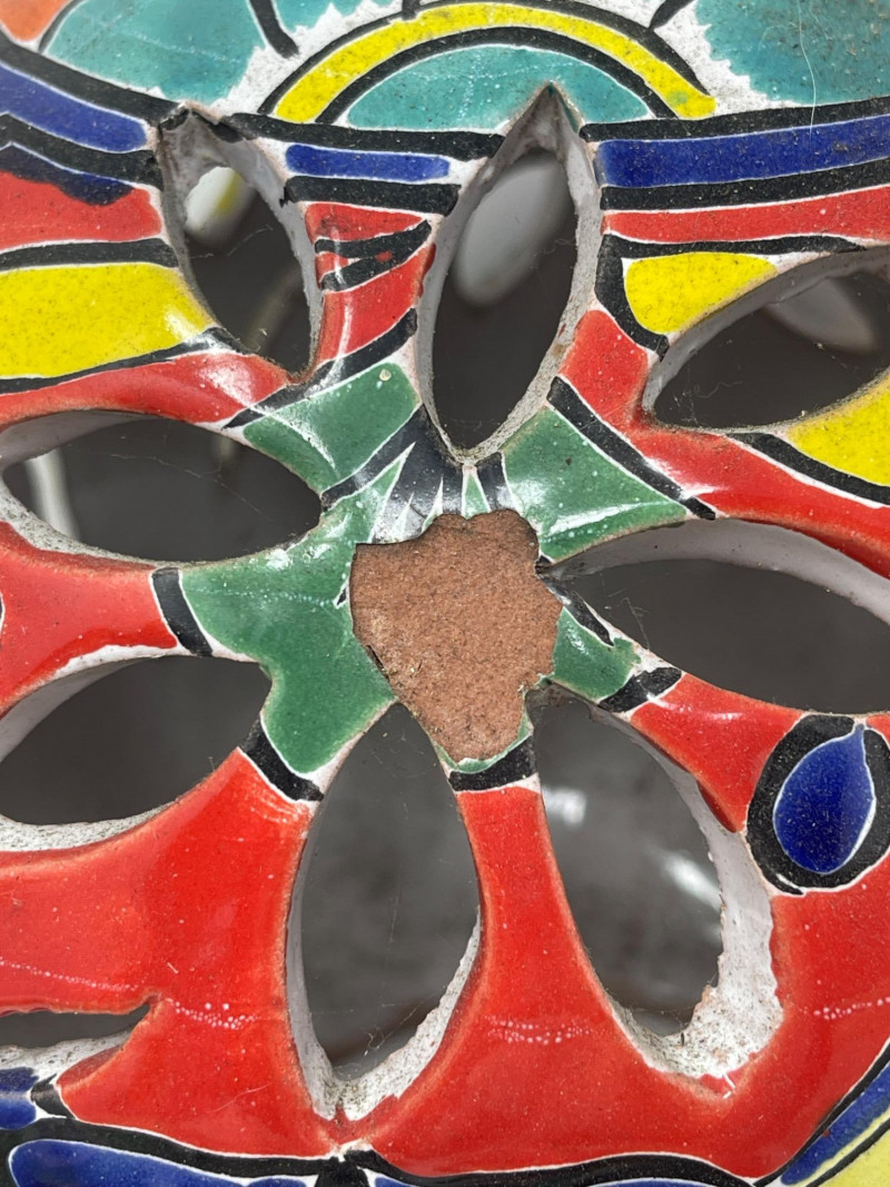 Hand-Painted Mexican Porcelain Collage Assorted Decor - Sun, Butterflies & Dragonflies This vibrant set features three hand-painted porcelain pieces from Mexico, creating a unique "collage" effect with their diverse patterns and colors. The set includes a whimsical sun with a human-like face and two uniquely designed butterflies, each showcasing a rich tapestry of hand-painted details. Sphere has some chips from use. See photos. Ranging in height from approximately 10 to 15 inches, these pieces are ready to hang and will bring a cheerful and artistic flair to any space with their striking collage aesthetic.