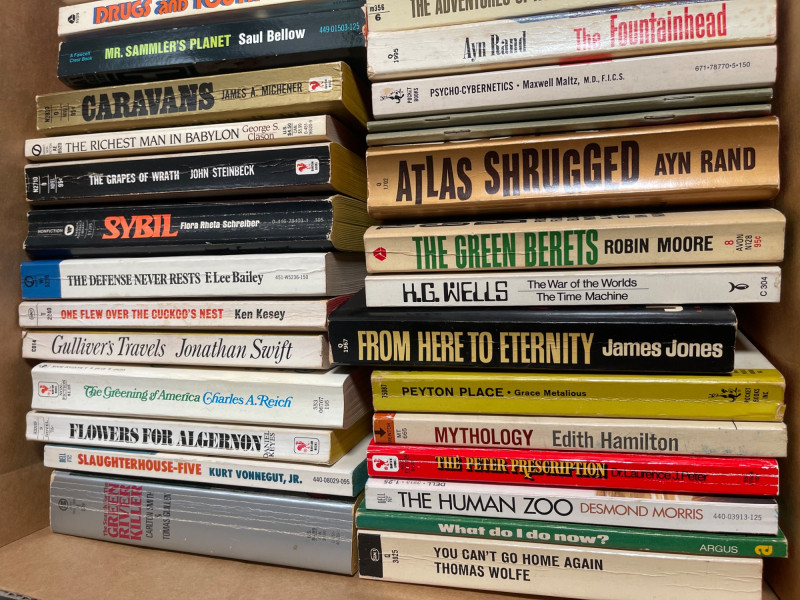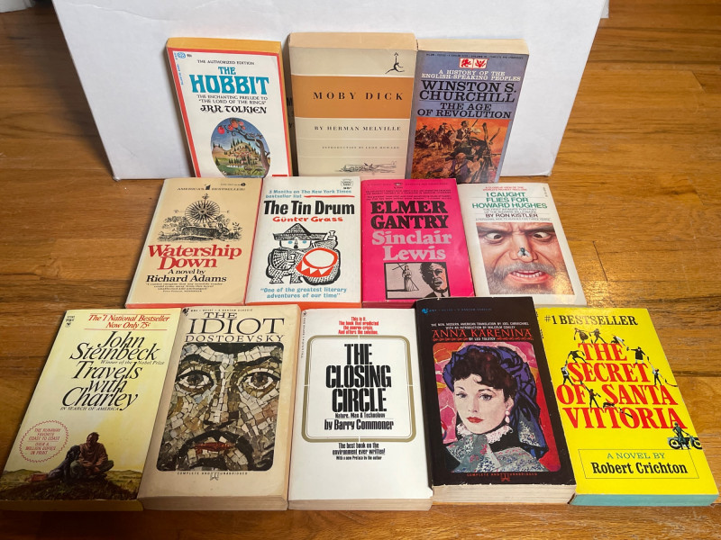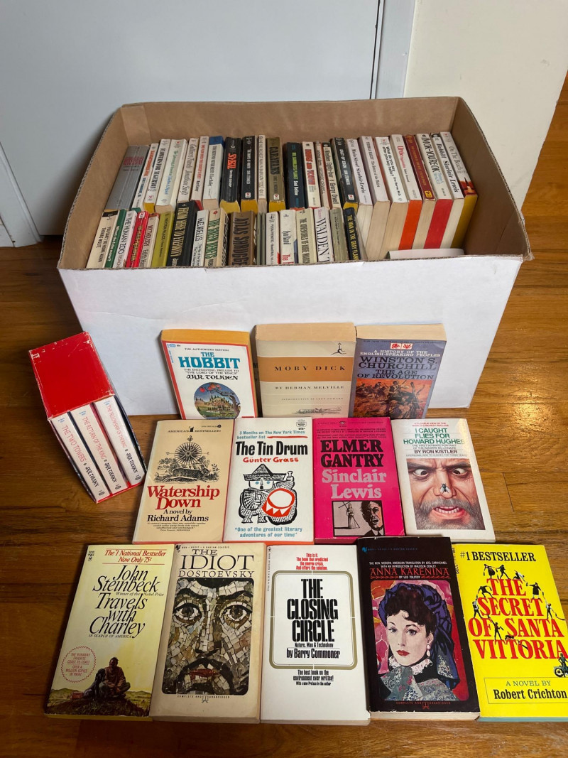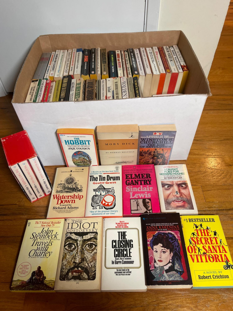 Large Box w/ Mixed Collection of Used Books - Literature, Classics + This is a substantial collection of used books, featuring a diverse range of genres including literature, classics, fiction, and potentially more waiting to be discovered! The books are stacked in a box that is nearly full (approximately 2 inches from the top when all are included). Please note that not all books are photographed or individually inspected, so there's likely a wider variety of titles and authors than what is immediately visible. This is a great opportunity for avid readers, collectors, or those looking to build a home library. Explore the possibilities within this eclectic mix!
