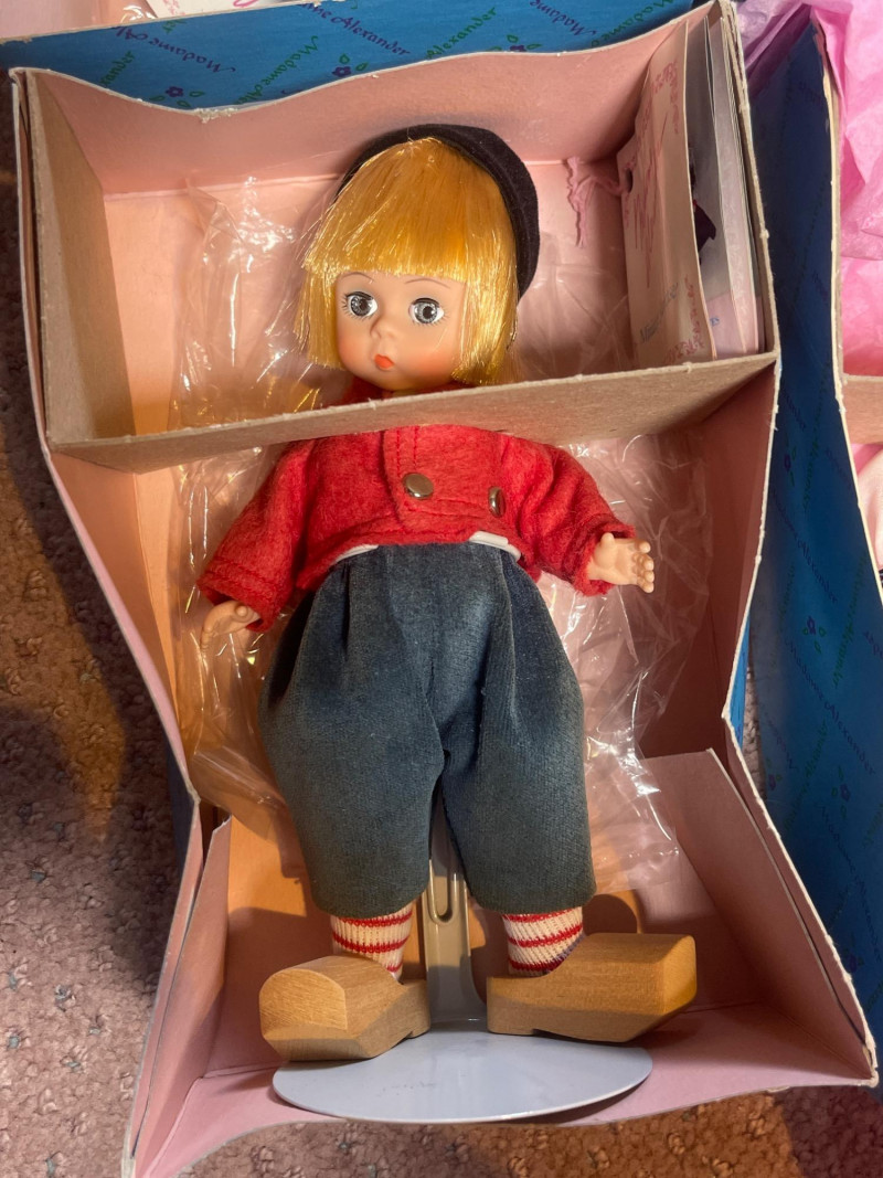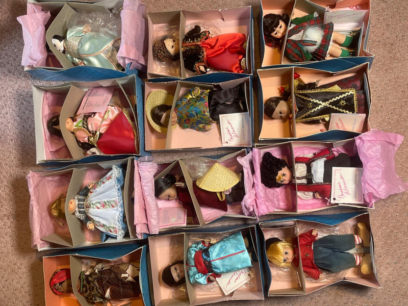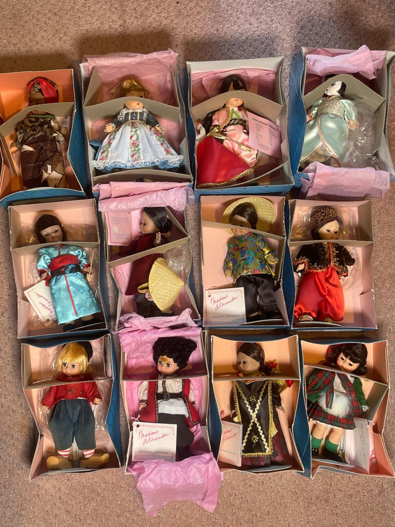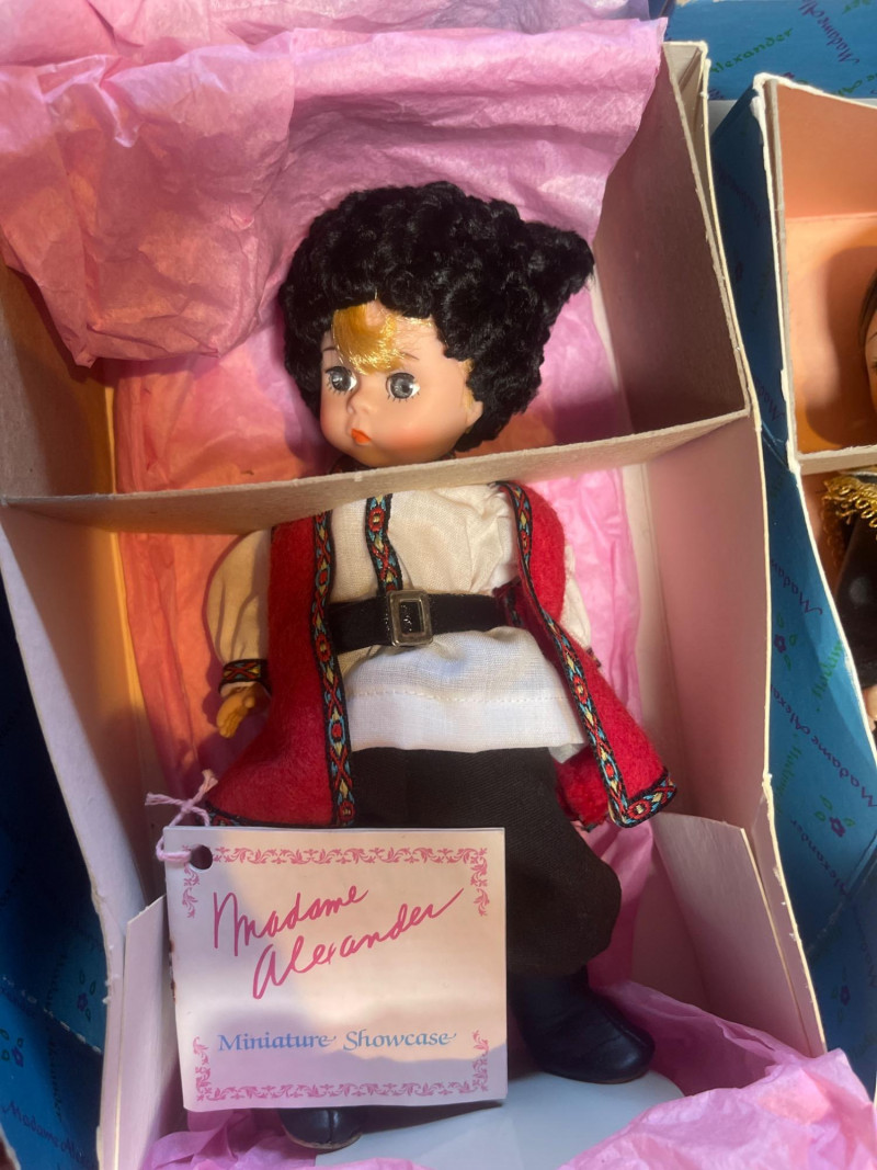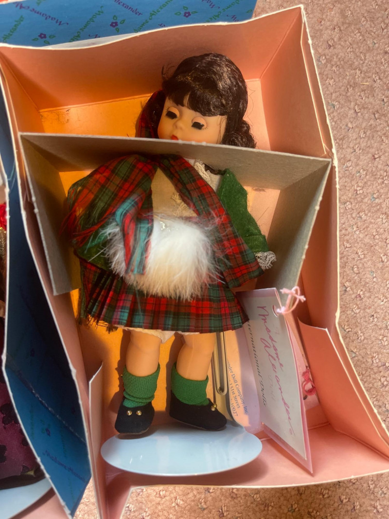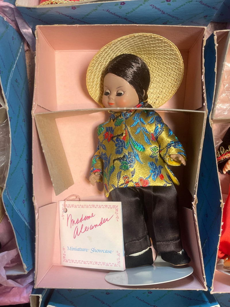 Collection of Madame Alexander International Dolls w/ Box This is a delightful collection of Madame Alexander dolls, each approximately 7 inches tall and presented in its original box. The collection represents a variety of nationalities and cultures, including dolls from Japan, China, Algeria, Netherlands, Scotland, and more! These charming dolls are a wonderful representation of Madame Alexander's attention to detail and cultural diversity. A great opportunity for collectors of Madame Alexander or international dolls.