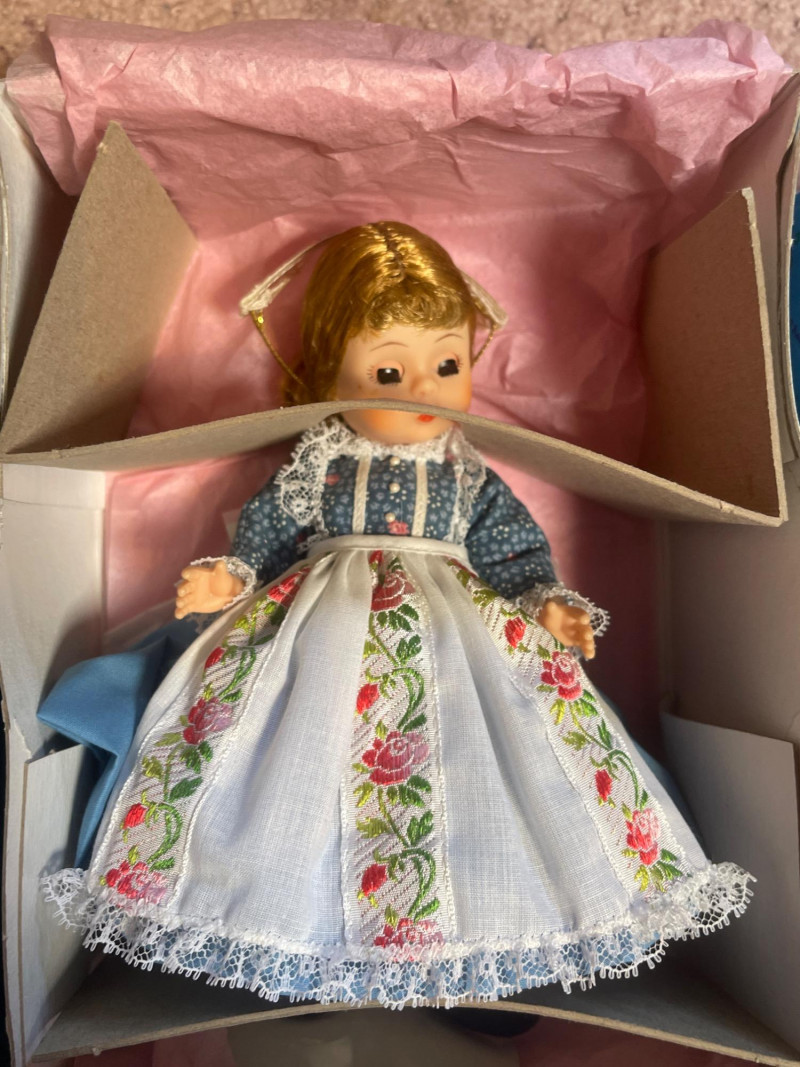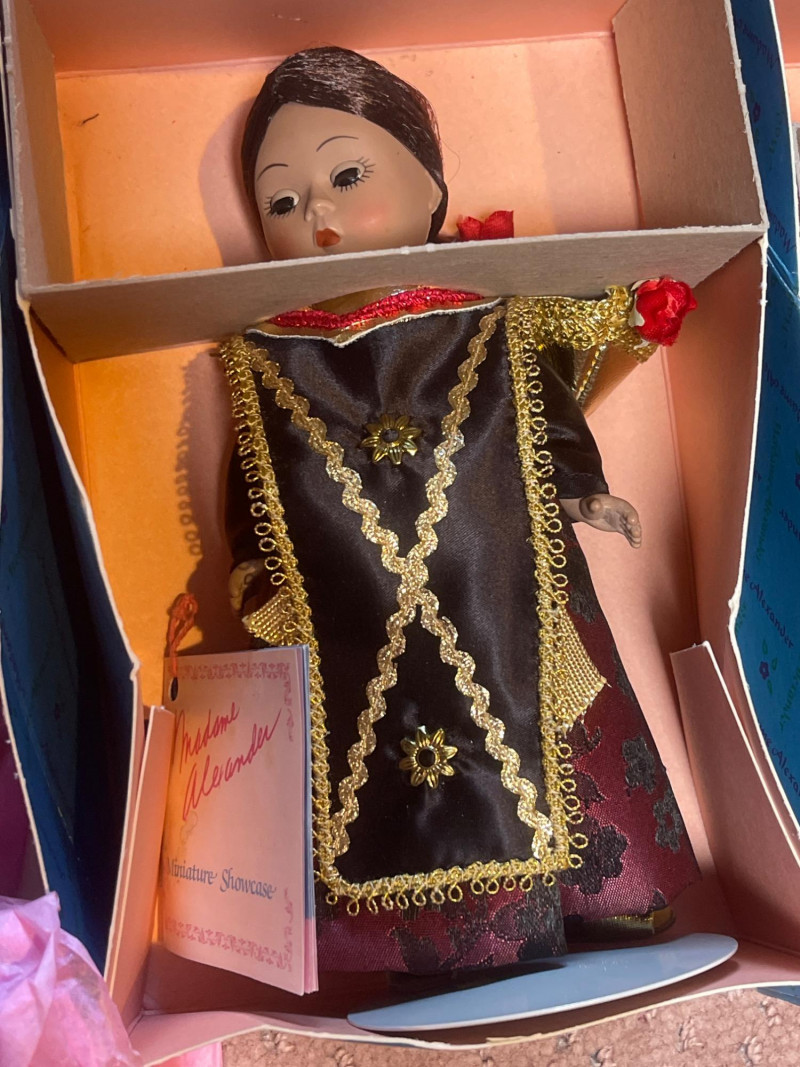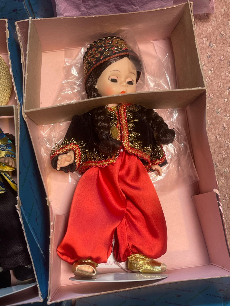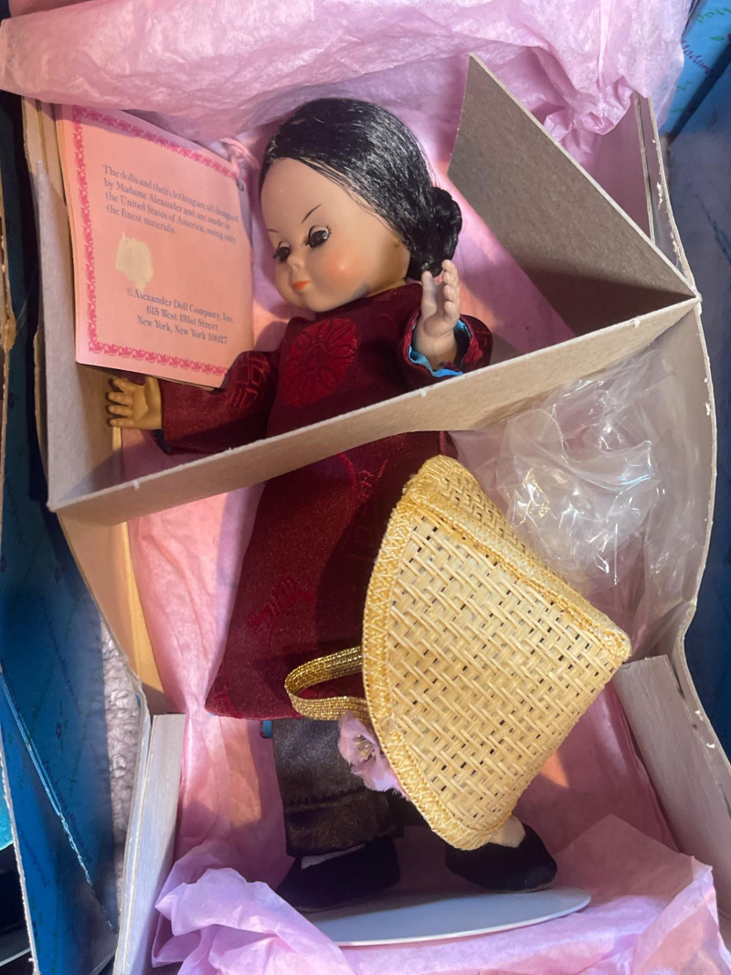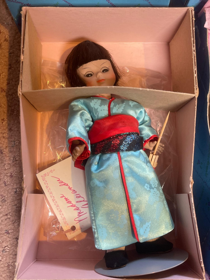Collection of Madame Alexander International Dolls w/ Box This is a delightful collection of Madame Alexander dolls, each approximately 7 inches tall and presented in its original box. The collection represents a variety of nationalities and cultures, including dolls from Japan, China, Algeria, Netherlands, Scotland, and more! These charming dolls are a wonderful representation of Madame Alexander's attention to detail and cultural diversity. A great opportunity for collectors of Madame Alexander or international dolls.