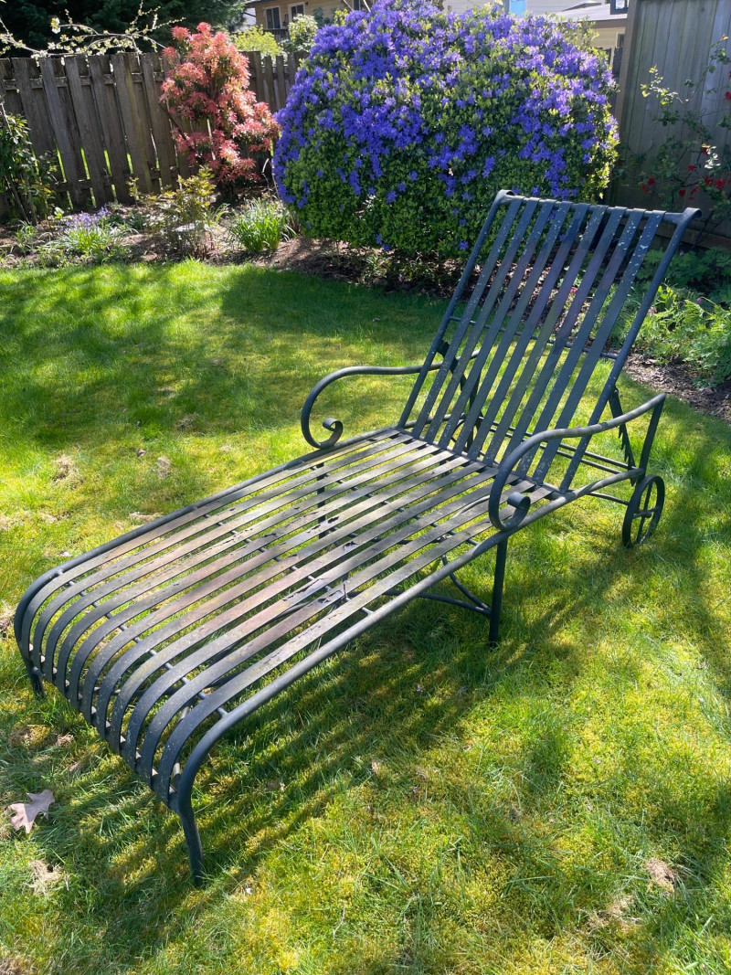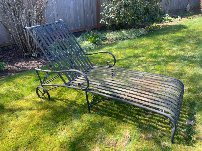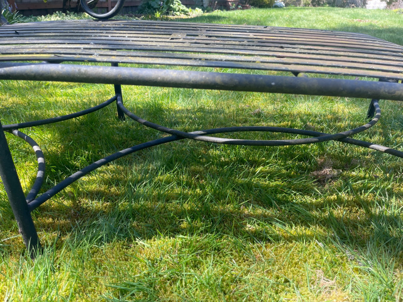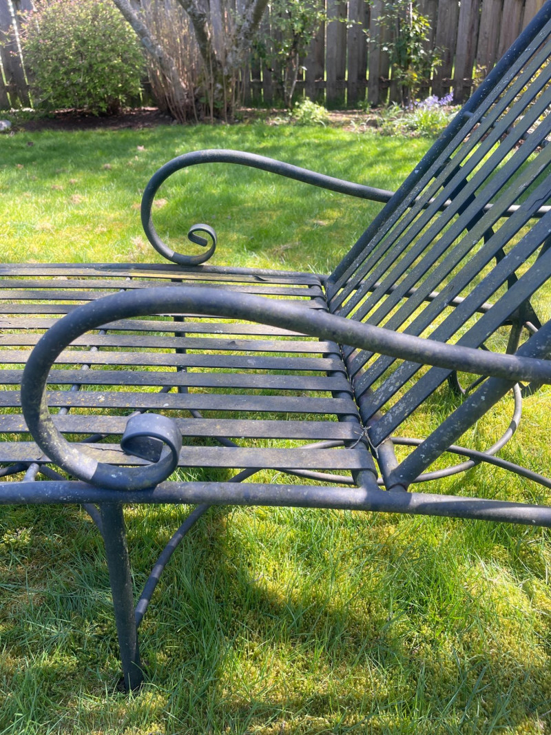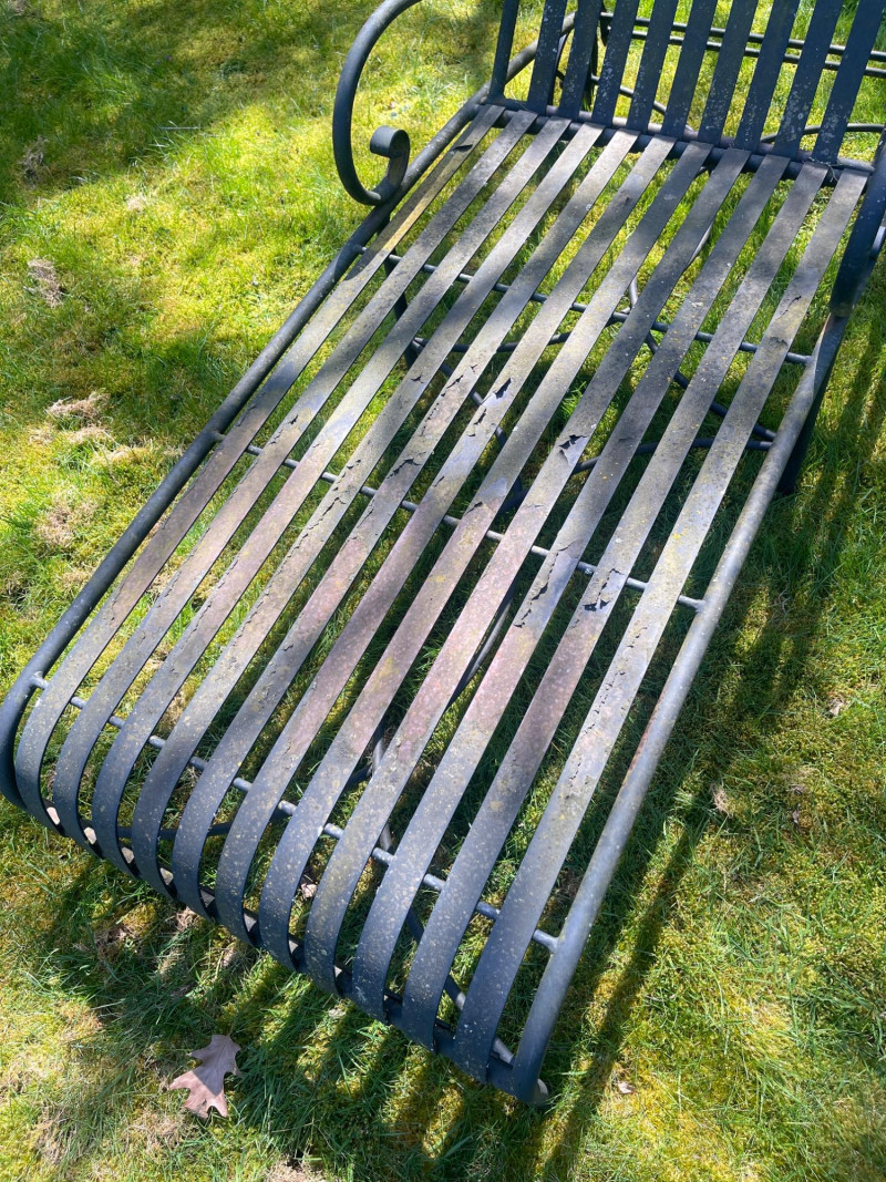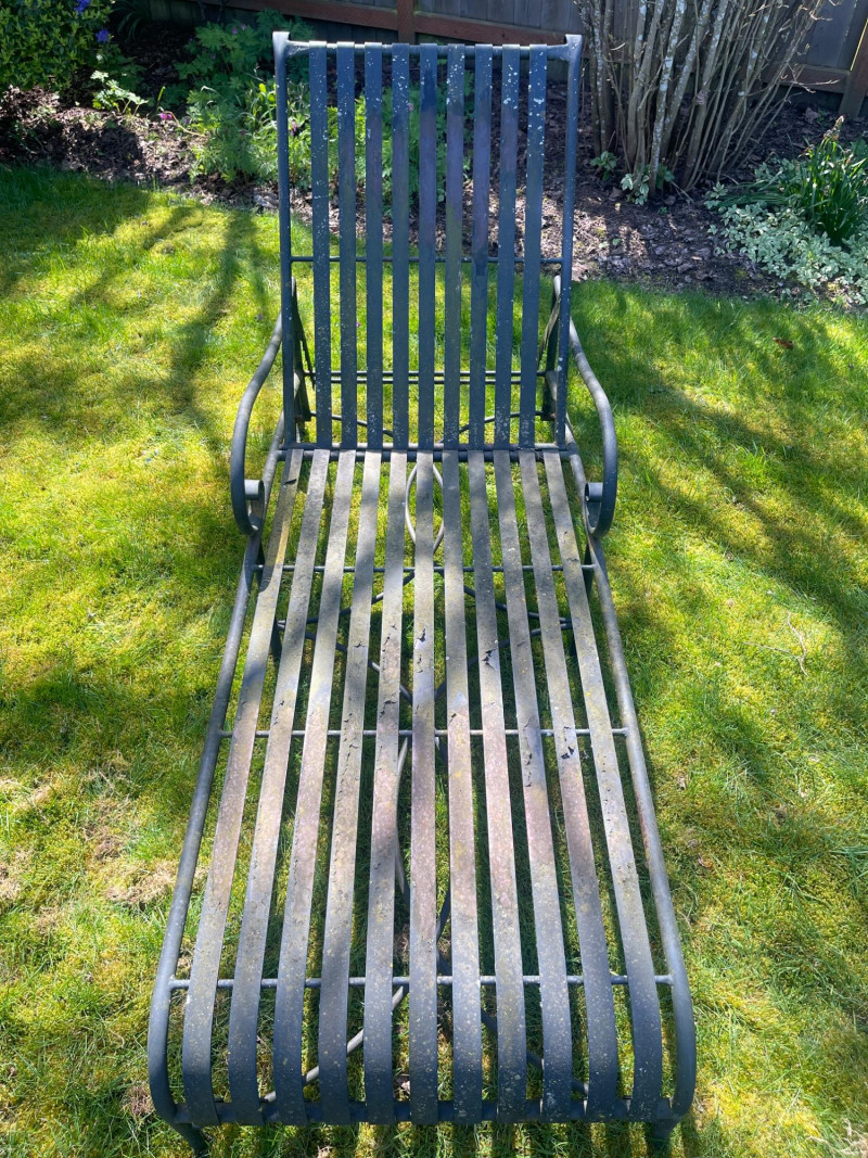 Outdoor Metal Patio Chaise Lounge Chair w/Cushion & Adjustable Back Relax in timeless garden style with this outdoor metal chaise lounge chair, perfect for patios, poolside, or garden lounging. Scrolled armrests and wheeled rear legs for easy repositioning Adjustable reclining back for customizable comfort Includes a plush green/blue padded cushion with light marbled pattern ⚠️ Note: Minor staining visible on cushion (see photos). There is also rusting and peeling to metal. Durable and stylish, this piece blends form and function, ideal for soaking up the sun in any outdoor space. Bidding on this lot is an agreement that: (1.) You will have at least 2 capable, able-bodied persons to lift and load at a minimum. (2.) You will bring a hand truck and/or any other tools needed to remove this item. If these steps are not followed your item will be forfeited and no refund given.