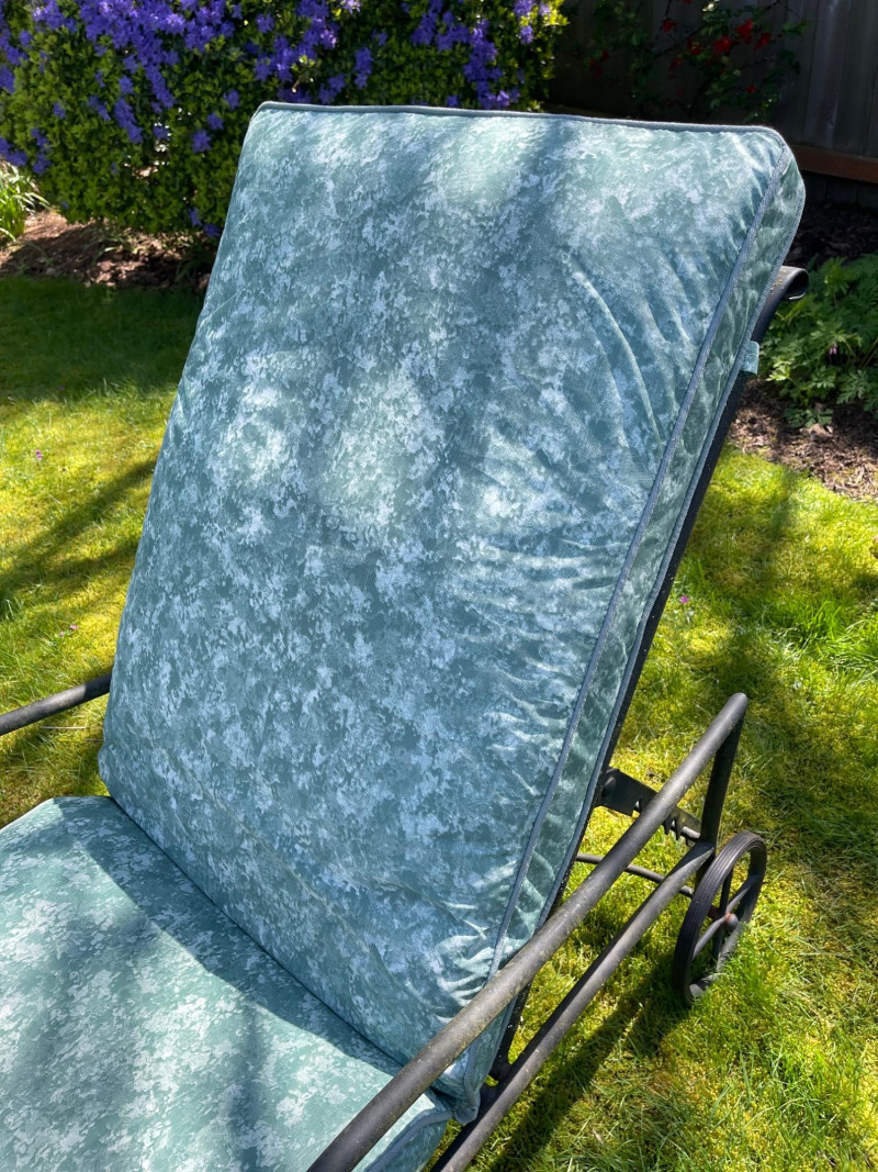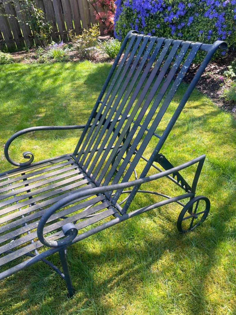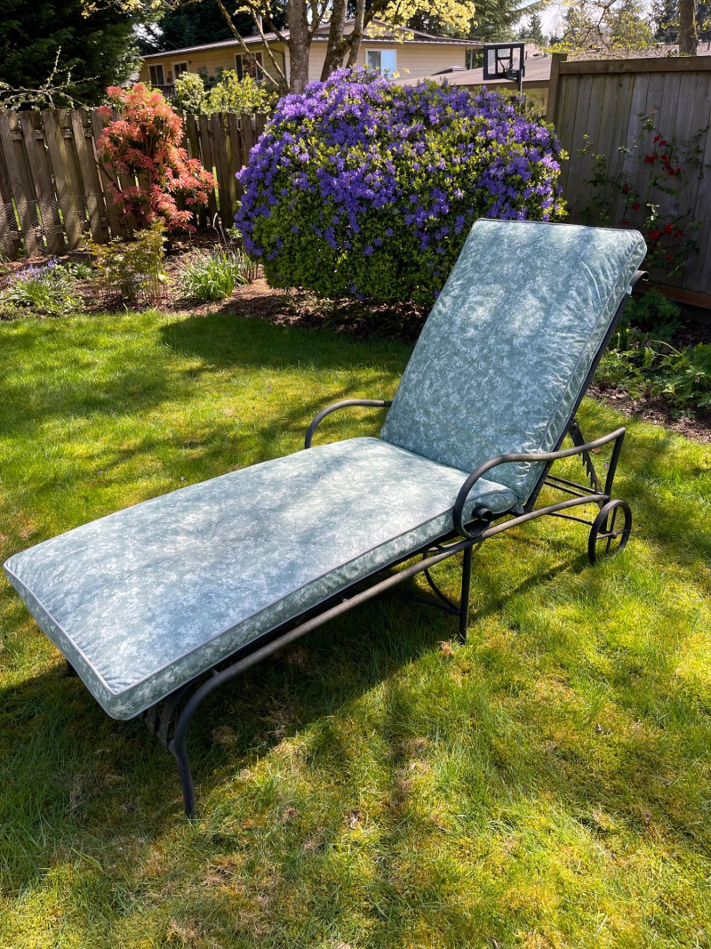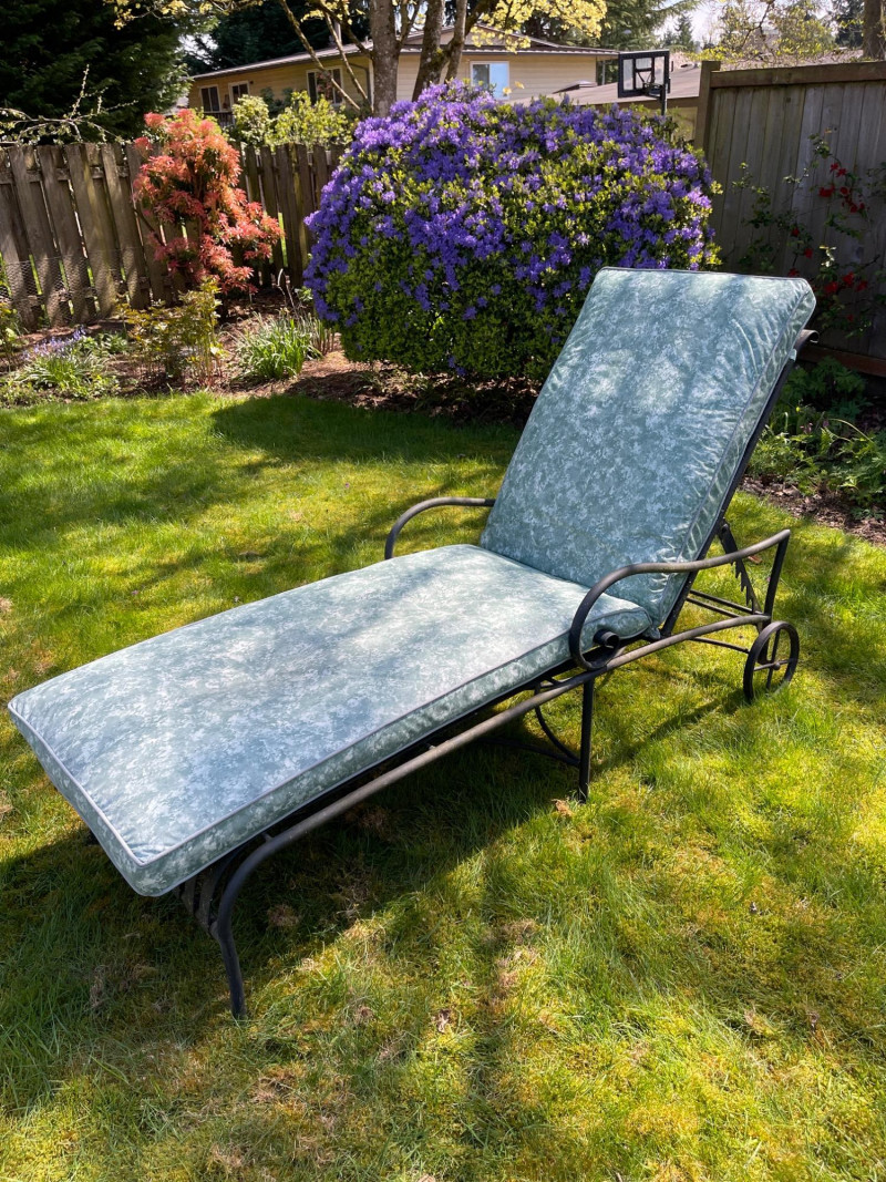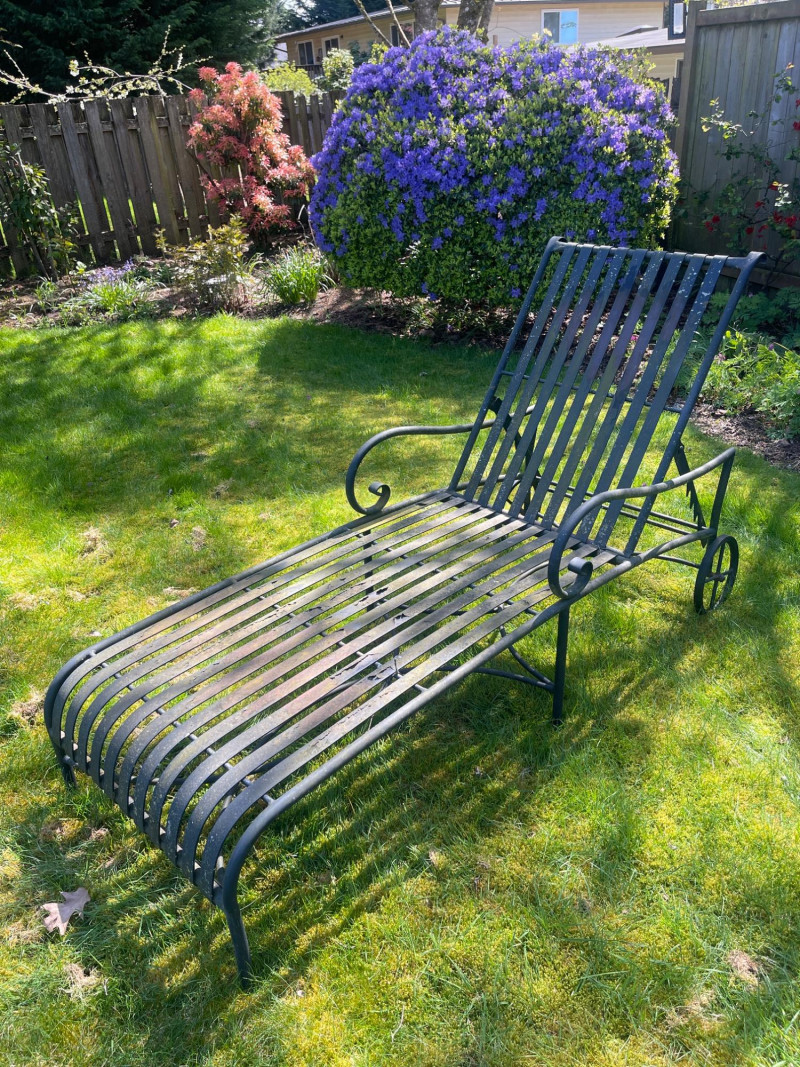 Outdoor Metal Patio Chaise Lounge Chair w/Cushion & Adjustable Back Relax in timeless garden style with this outdoor metal chaise lounge chair, perfect for patios, poolside, or garden lounging. Scrolled armrests and wheeled rear legs for easy repositioning Adjustable reclining back for customizable comfort Includes a plush green/blue padded cushion with light marbled pattern ⚠️ Note: Minor staining visible on cushion (see photos). There is also rusting and peeling to metal. Durable and stylish, this piece blends form and function, ideal for soaking up the sun in any outdoor space. Bidding on this lot is an agreement that: (1.) You will have at least 2 capable, able-bodied persons to lift and load at a minimum. (2.) You will bring a hand truck and/or any other tools needed to remove this item. If these steps are not followed your item will be forfeited and no refund given.