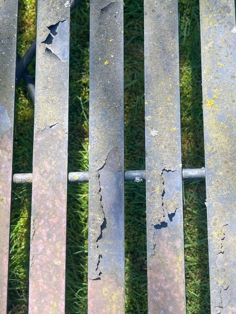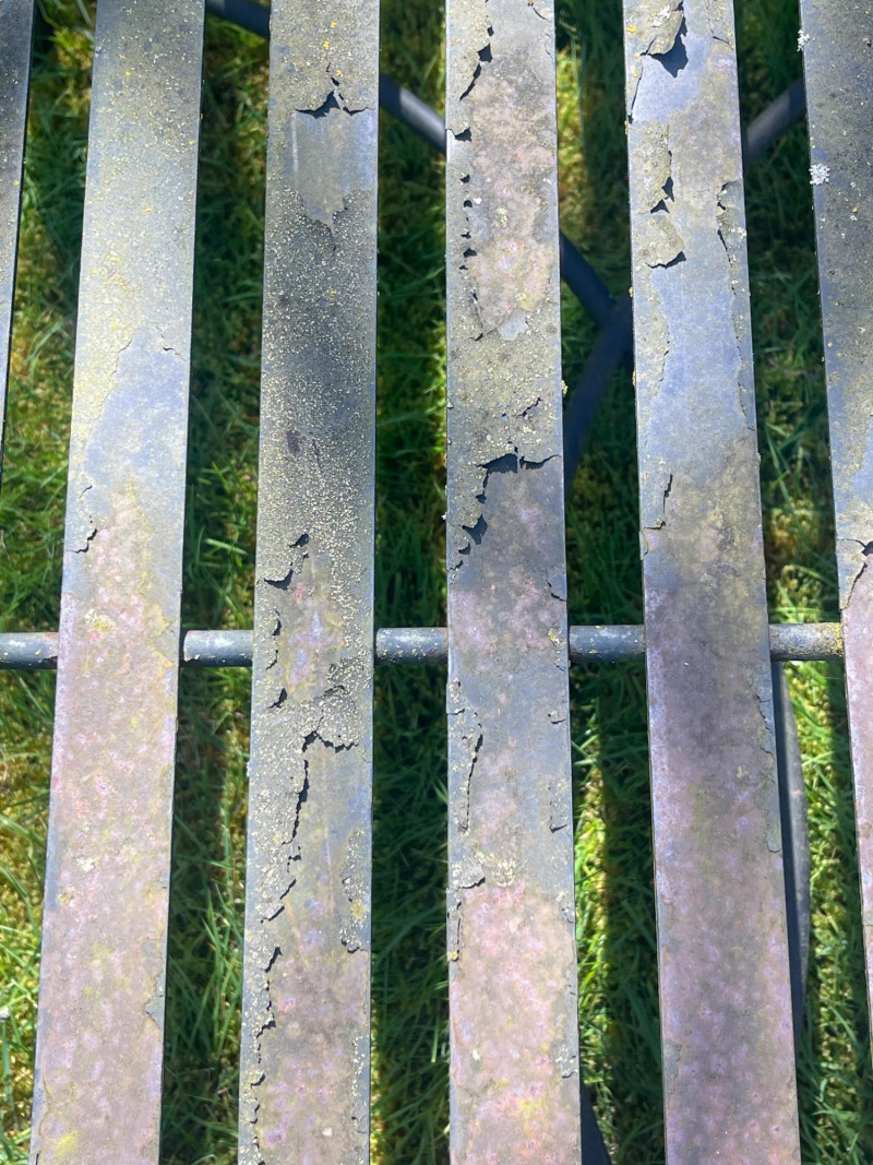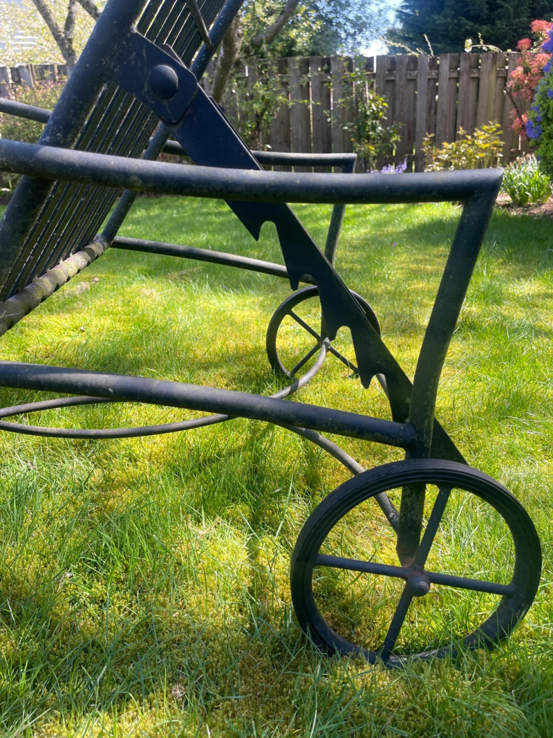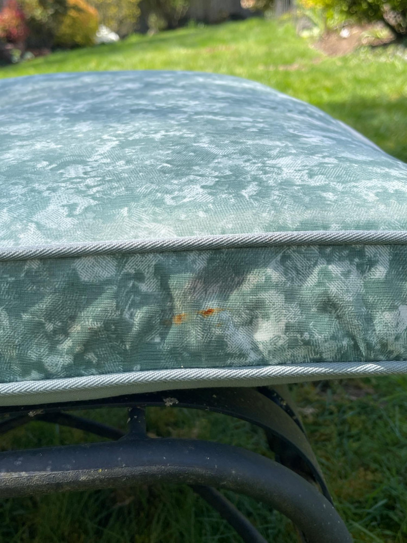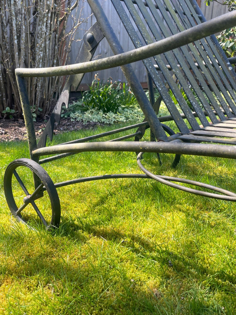Outdoor Metal Patio Chaise Lounge Chair w/Cushion & Adjustable Back Relax in timeless garden style with this outdoor metal chaise lounge chair, perfect for patios, poolside, or garden lounging. Scrolled armrests and wheeled rear legs for easy repositioning Adjustable reclining back for customizable comfort Includes a plush green/blue padded cushion with light marbled pattern ⚠️ Note: Minor staining visible on cushion (see photos). There is also rusting and peeling to metal. Durable and stylish, this piece blends form and function, ideal for soaking up the sun in any outdoor space. Bidding on this lot is an agreement that: (1.) You will have at least 2 capable, able-bodied persons to lift and load at a minimum. (2.) You will bring a hand truck and/or any other tools needed to remove this item. If these steps are not followed your item will be forfeited and no refund given.