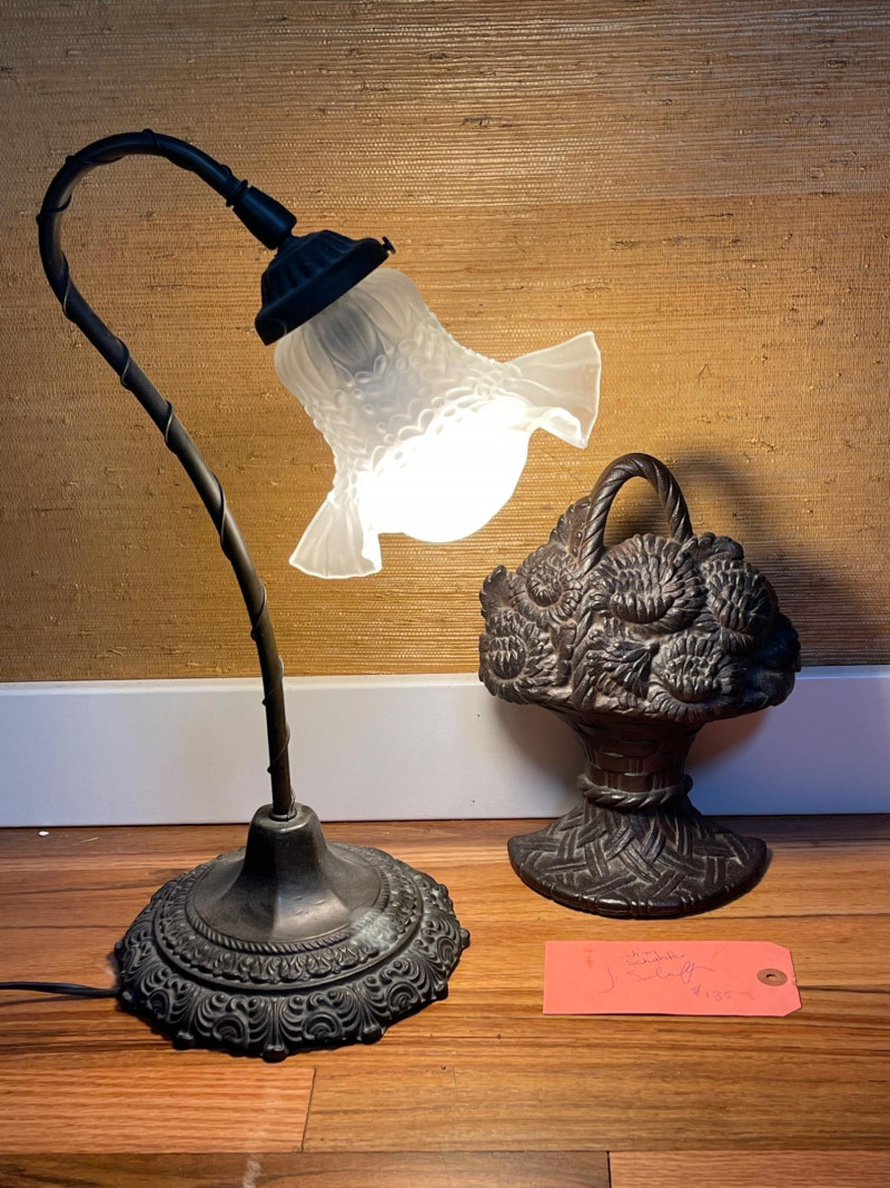 1926 Jim Schahfer Cast Iron Doorstop + Vintage Art Nouveau Brass Lamp 9-16” H Offered as a unique two-piece lot: 1. Vintage Gooseneck Table Lamp Likely brass or brass-plated base with ornate embossed detailing Elegant gooseneck design with upward spiral twist and secure base Fitted with a frosted ruffled glass shade, floral texture and soft diffusion Working condition with a warm, antique-style glow—perfect for a reading nook or vintage desk setup 2. 1926 Jim Schahfer Cast Iron Doorstop Classic flower basket motif in richly aged cast iron Clearly marked: “TRADE MARK / PAT. NOV. 9, 1926” and associated with Jim Schahfer, a noted craftsman and collector of antique-style cast iron Heavy and sturdy—ideal as a decorative doorstop, bookend, or display item Original retail tag indicating a value of $135 included Both pieces complement one another in early 20th-century revival style, ideal for vintage collectors or traditional interiors.
