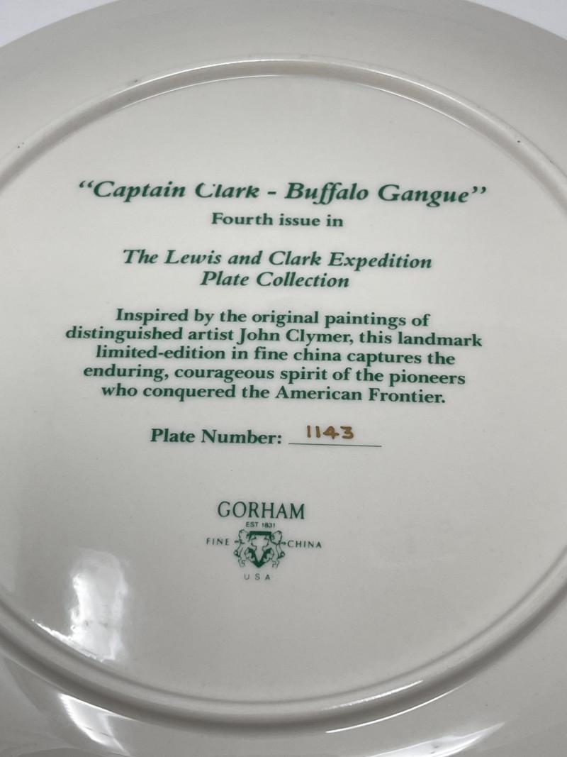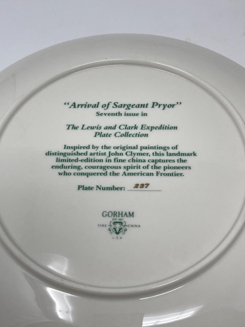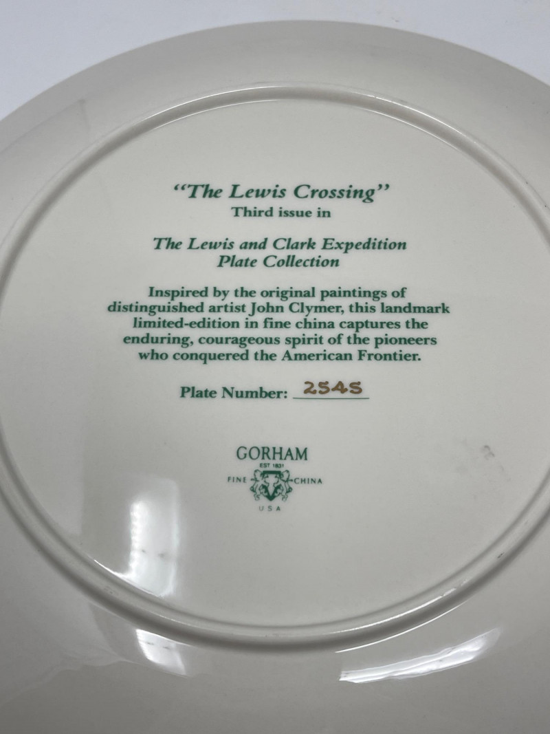 Gorham Lewis & Clark Expedition Plate Collection by John Clymer Gorham Fine China Collector Plate – John Clymer, 1971 – Plate #1578 Gorham Fine China Collector Plate – John Clymer, 1973 – Plate #2545 Gorham Fine China Collector Plate – John Clymer, 1976 – Plate #1143 Gorham Fine China Collector Plate – John Clymer, 1975 – Plate #331 Gorham Fine China Collector Plate – John Clymer, 1973 – Plate #1573 Gorham Fine China Collector Plate – John Clymer – Plate #287 Gorham Fine China Collector Plate – John Clymer – Plate #1531. “Lewis & Clark in the Bitterroots” – First Issue