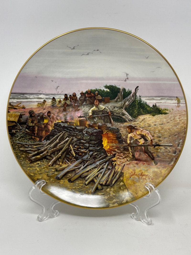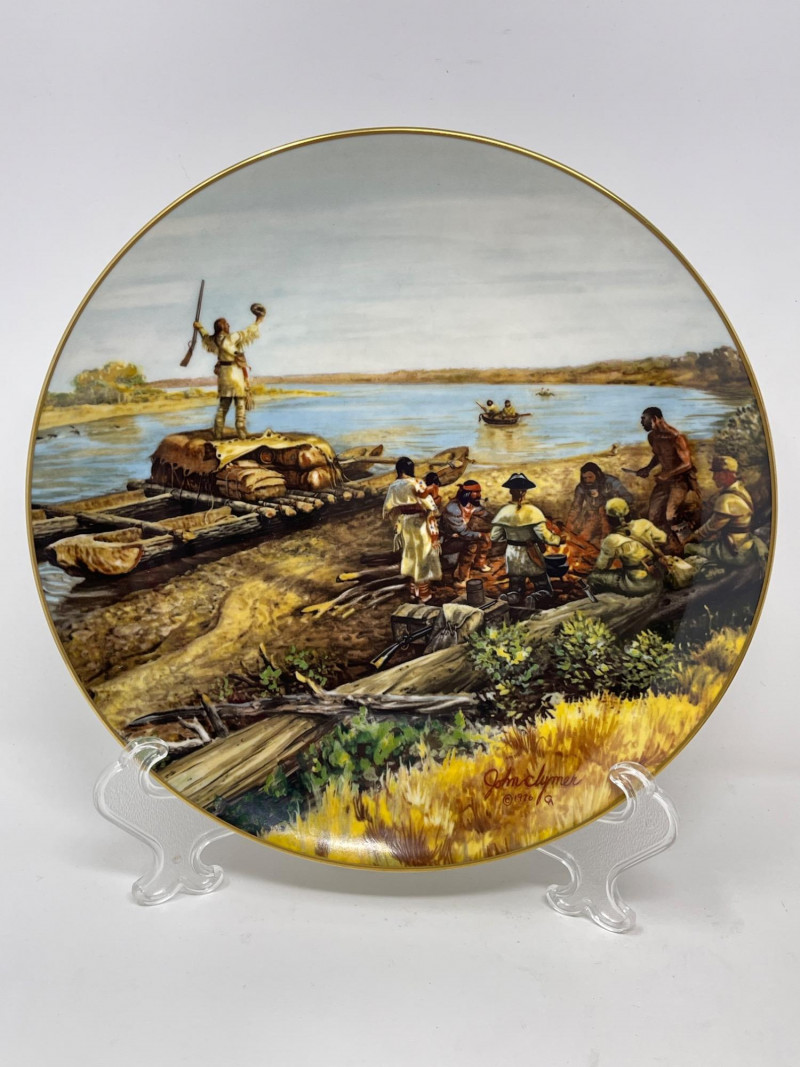Featuring the Corps of Discovery greeting visitors at their winter encampment in Oregon, this plate celebrates diplomacy and endurance in the western frontier.