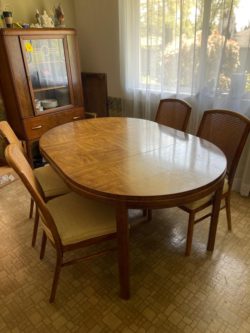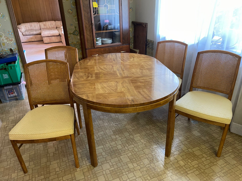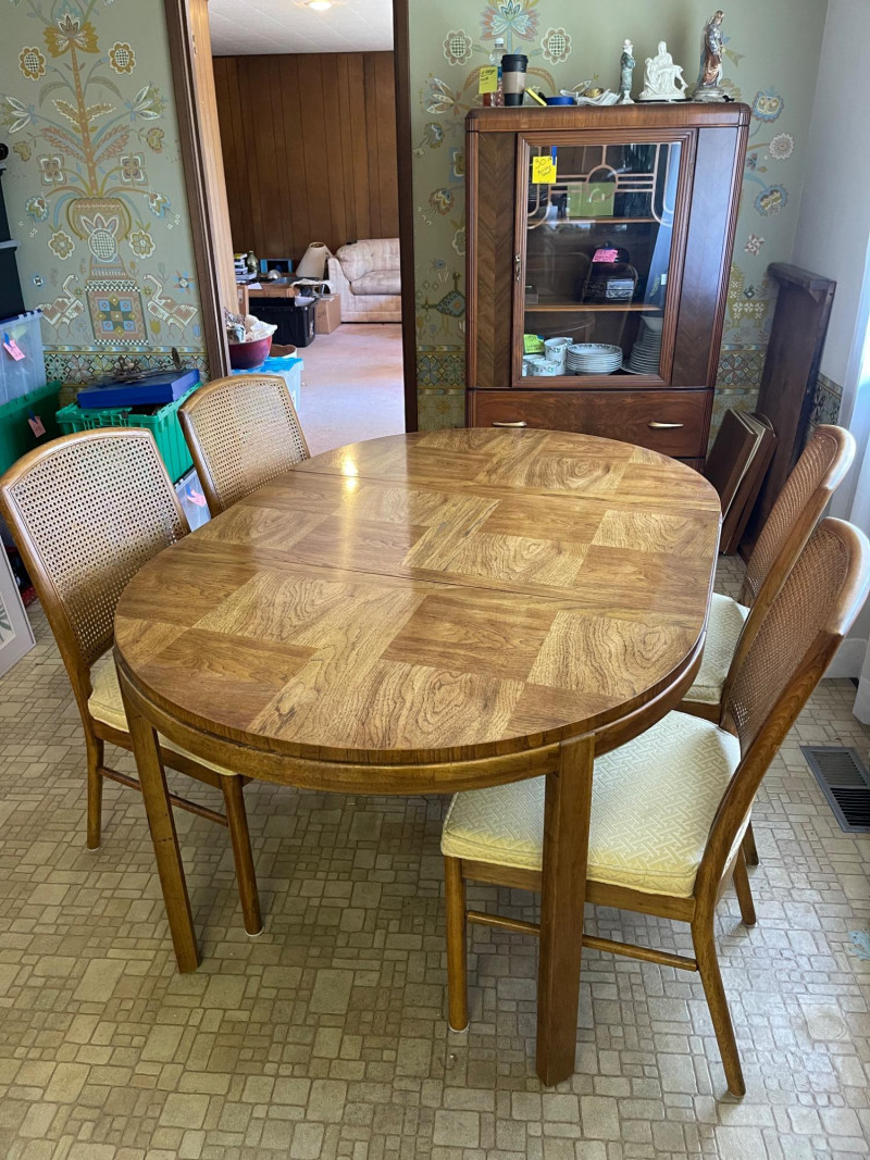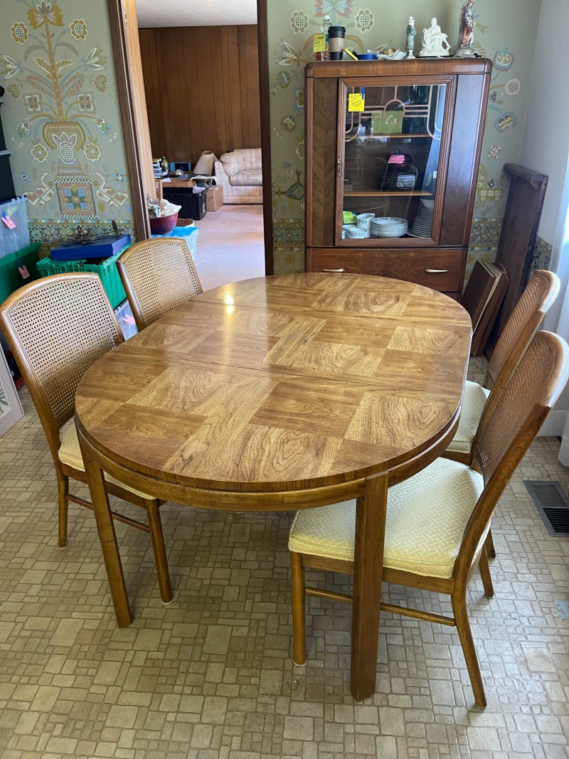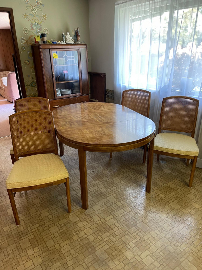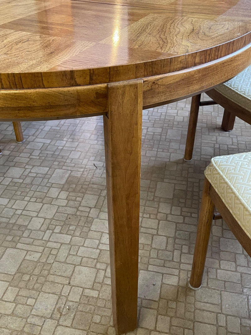 1977 Drexel “Consensus” Dining Set – Table + 4 Chairs, 2 Leaves. Offered is a timeless 1977 Drexel Heritage “Consensus” Collection dining set, a Mid-Century Modern classic known for its refined simplicity and enduring quality. This elegant set includes a rectangular oak veneer dining table with two extension leaves and four caned-back chairs in their original mottled upholstery. The warm honey finish showcases a lovely, even tone throughout, complemented by a subtle, desirable patina. The table features a parquet veneer top, and the chairs boast an attractive curved profile with supportive cane backs. Maker: Drexel Heritage Collection: Consensus Date: Circa 1977 Includes: Table, 2 leaves, 6 chairs Finish: Oak veneer with honey tone Style: Mid-Century Modern / Transitional Condition: Very good vintage condition; minor wear consistent with age Comparable sets listed online up to $3,500 A versatile and stylish set—ideal for everyday dining or formal gatherings. Measurements: