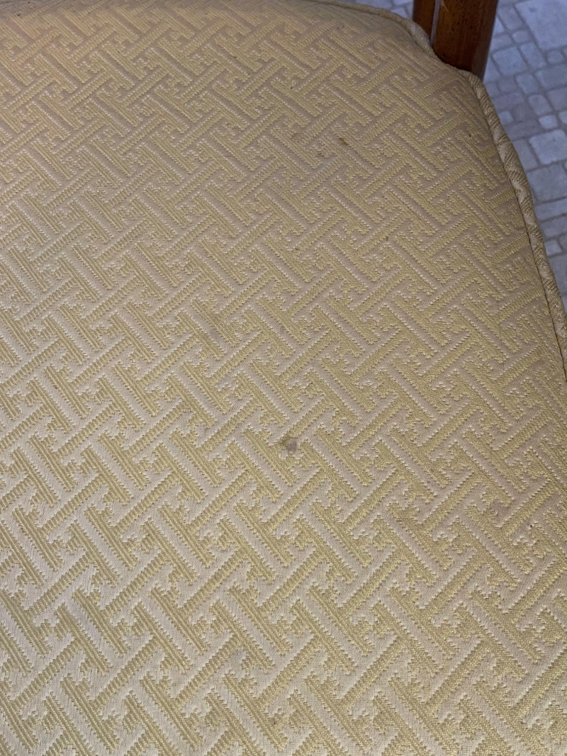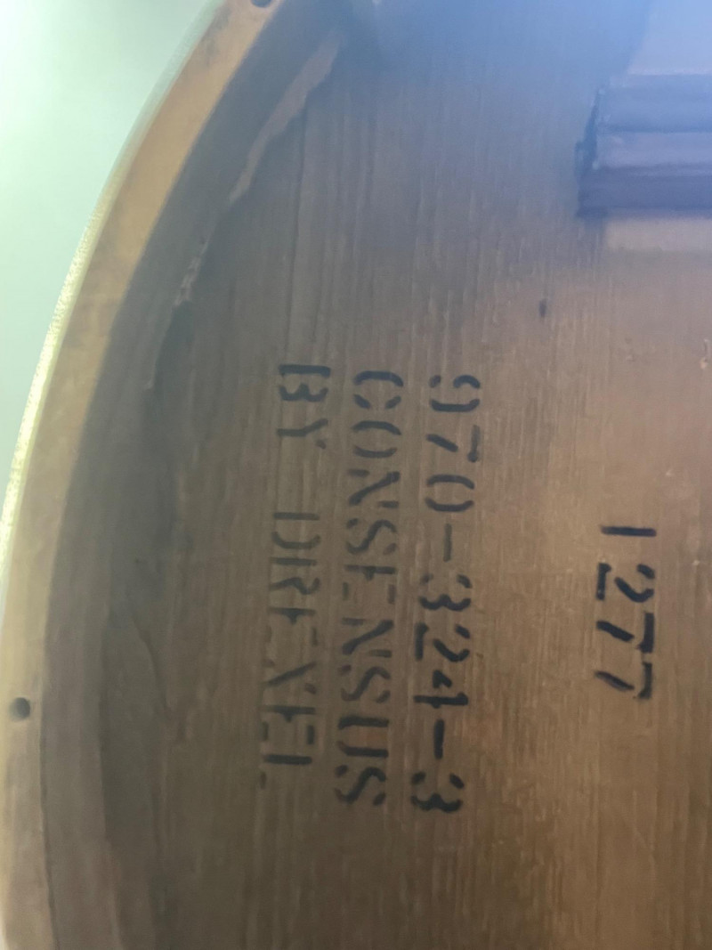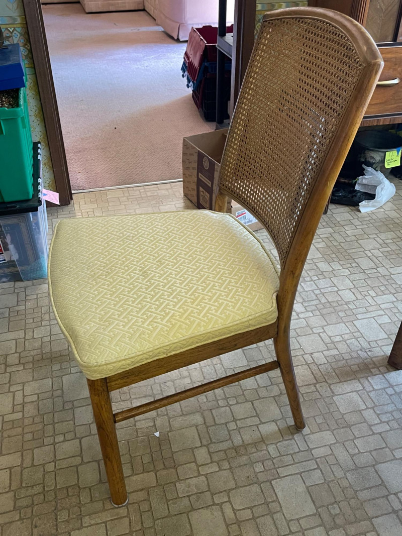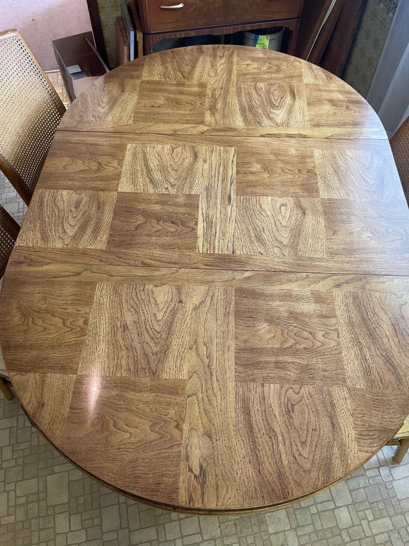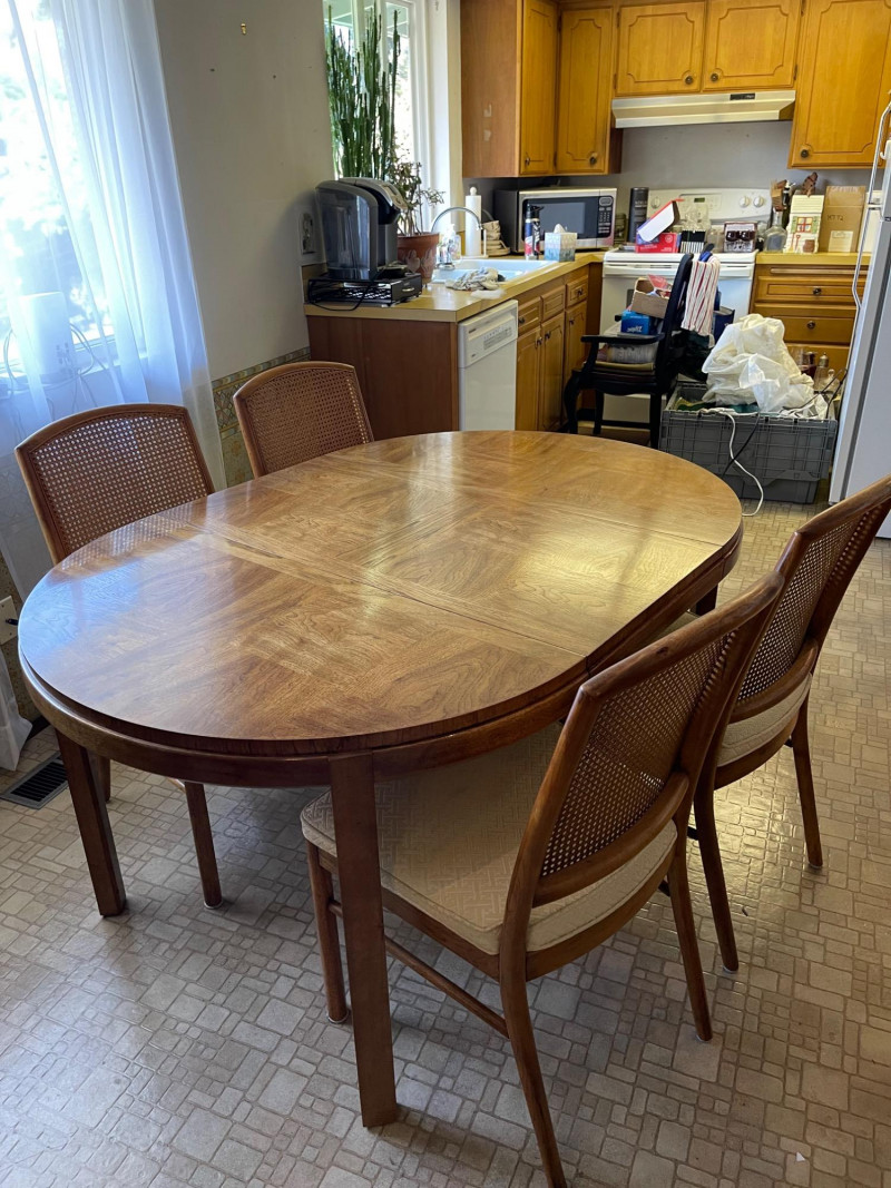 1977 Drexel “Consensus” Dining Set – Table + 4 Chairs, 2 Leaves. Offered is a timeless 1977 Drexel Heritage “Consensus” Collection dining set, a Mid-Century Modern classic known for its refined simplicity and enduring quality. This elegant set includes a rectangular oak veneer dining table with two extension leaves and four caned-back chairs in their original mottled upholstery. The warm honey finish showcases a lovely, even tone throughout, complemented by a subtle, desirable patina. The table features a parquet veneer top, and the chairs boast an attractive curved profile with supportive cane backs. Maker: Drexel Heritage Collection: Consensus Date: Circa 1977 Includes: Table, 2 leaves, 6 chairs Finish: Oak veneer with honey tone Style: Mid-Century Modern / Transitional Condition: Very good vintage condition; minor wear consistent with age Comparable sets listed online up to $3,500 A versatile and stylish set—ideal for everyday dining or formal gatherings. Measurements: