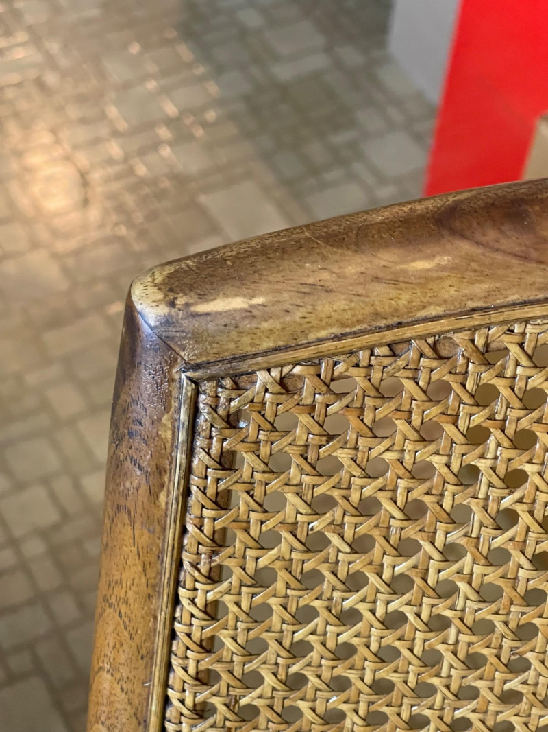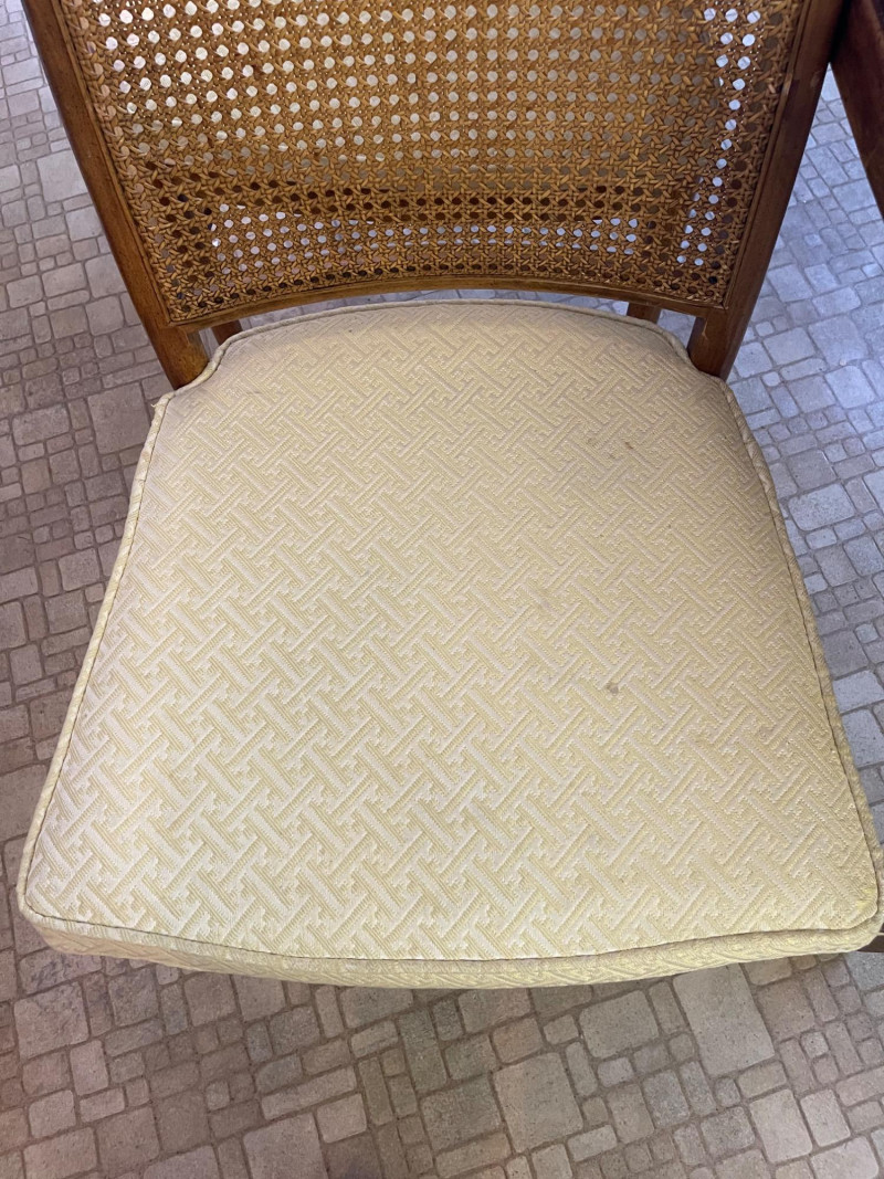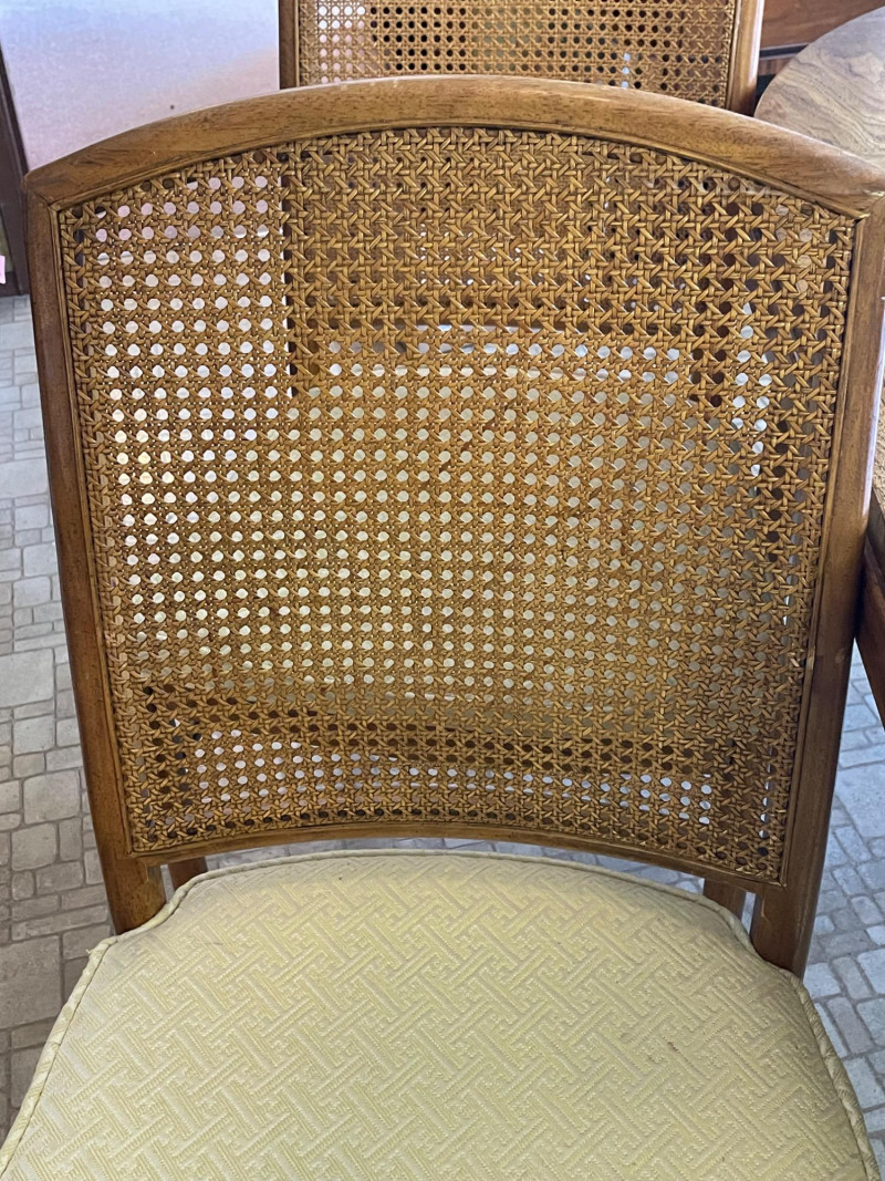 Cane Chairs: 21"W x 19"D x 36.5"H Condition: Some scratches and scuffs to both table and chairs from use. Seat cushions have staining from use as well.
