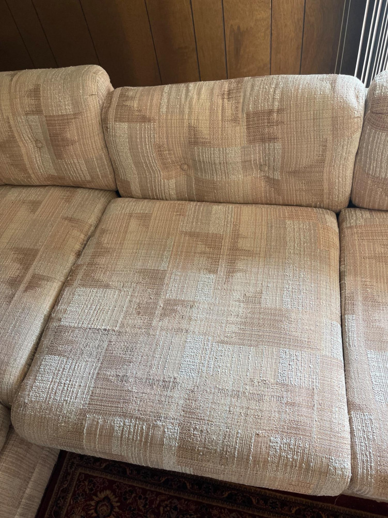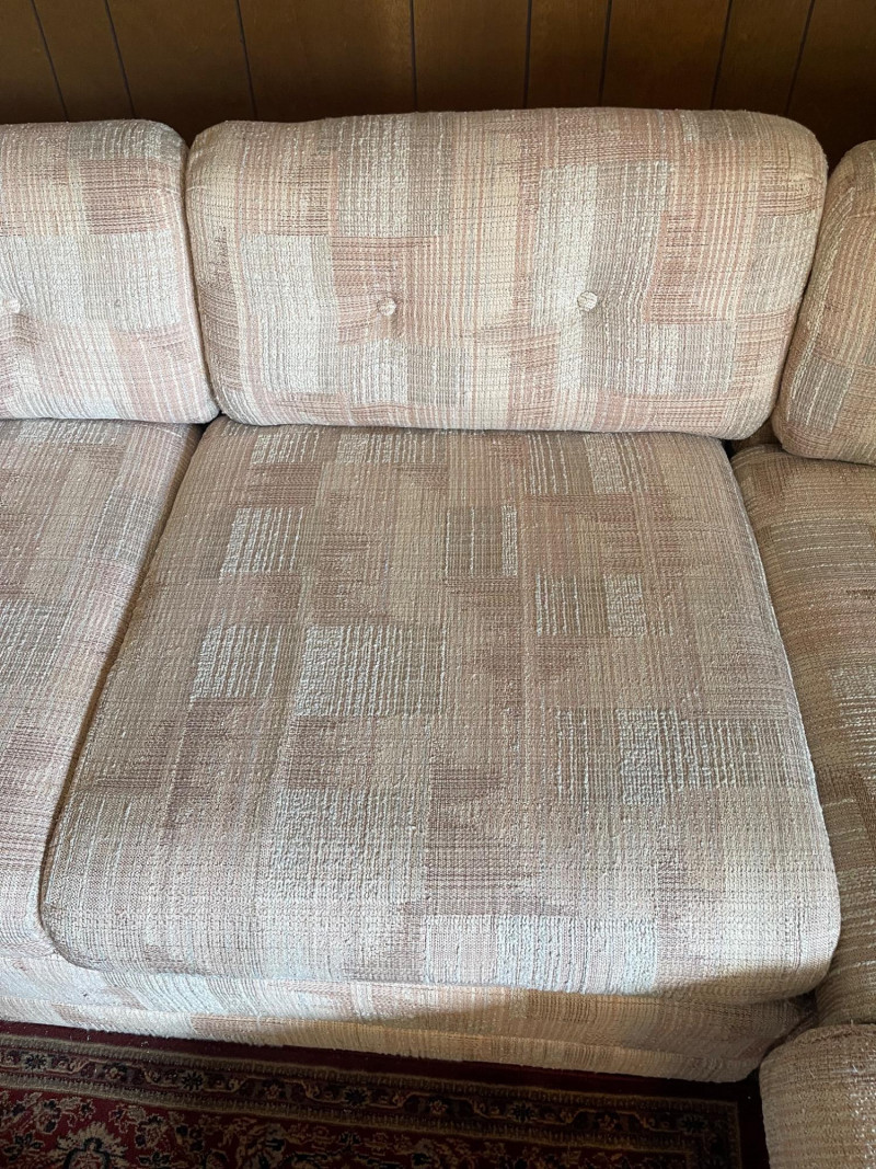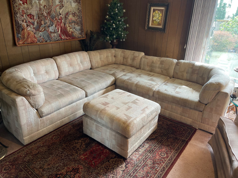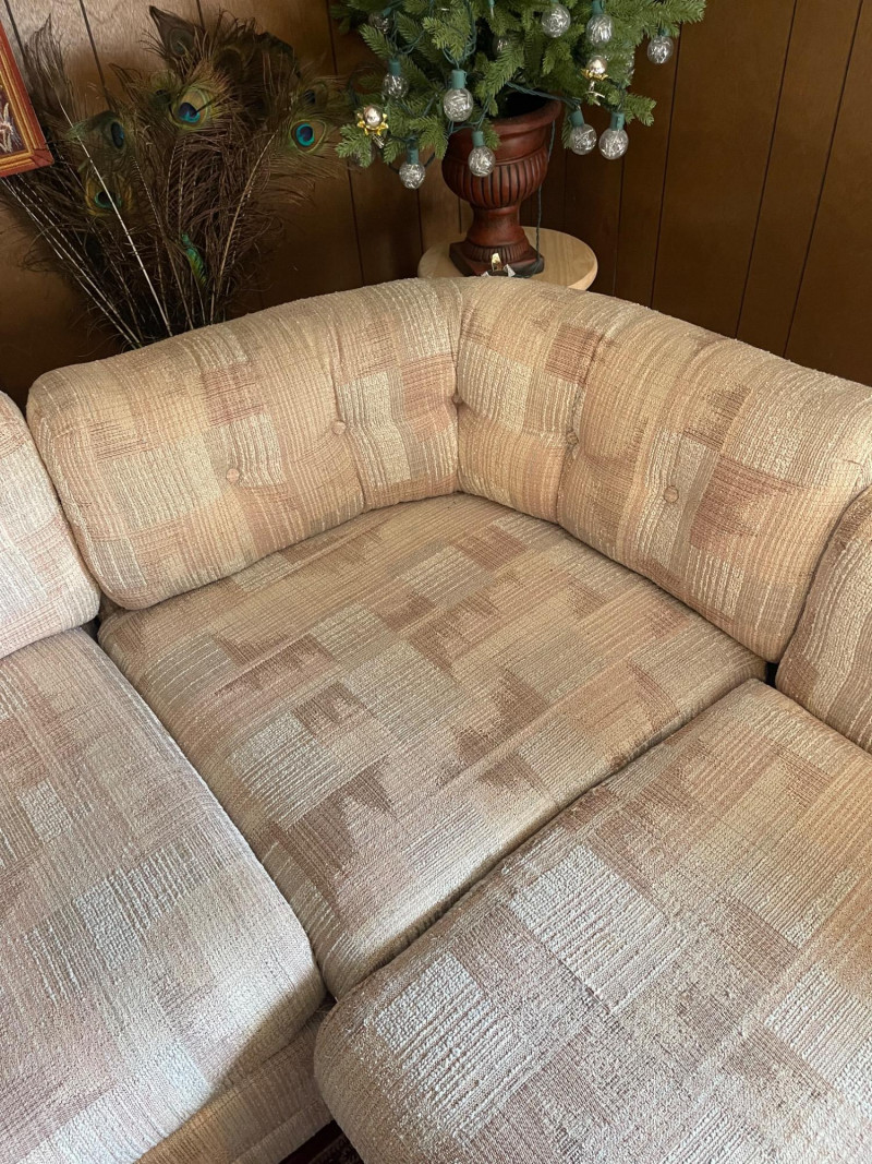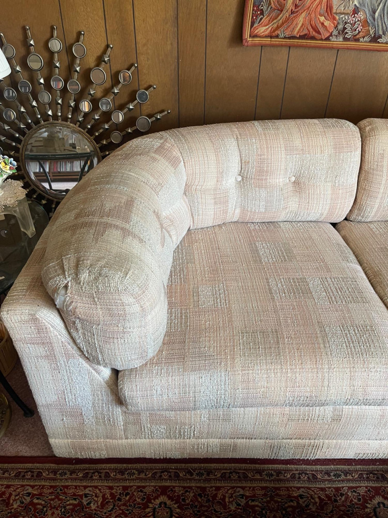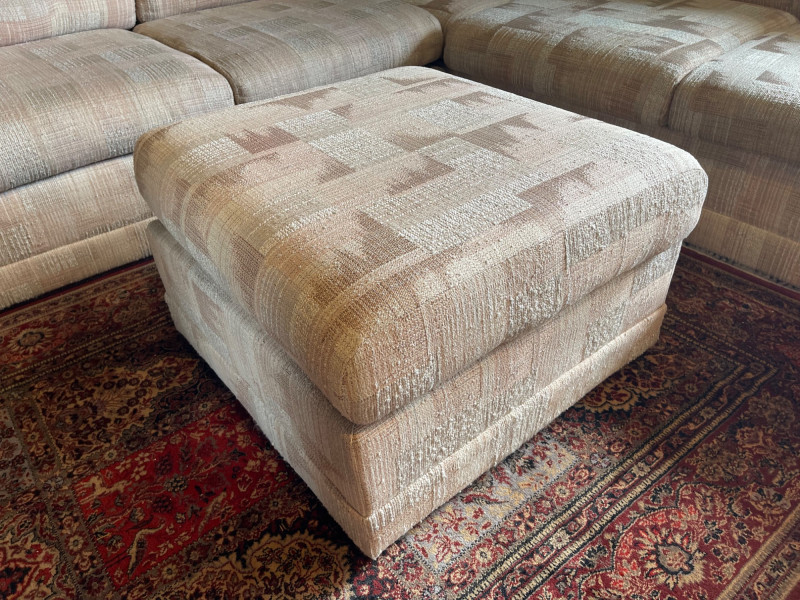 Vintage Slyter Magnuson Sectional Sofa & Ottoman A generously sized vintage sectional sofa and ottoman set by Slyter Magnuson, known for their well-crafted American-made furniture. This plush 3-piece set features the original geometric upholstery, tufted backs, and rounded pillow-style arms, offering both comfort and a distinctive retro aesthetic. The neutral palette and angular upholstery pattern reflect classic late 1980s–early 1990s design, making it an ideal statement piece for a vintage-inspired living space or cozy family room. Dimensions: Left Section: 98" L x 38" D x 27" H Right Section: 60" L x 38" D x 27" H Ottoman: 27" L x 26" D x 16" H Seat Depth: Approx. 25" Condition: Good vintage condition with light, age-appropriate wear.