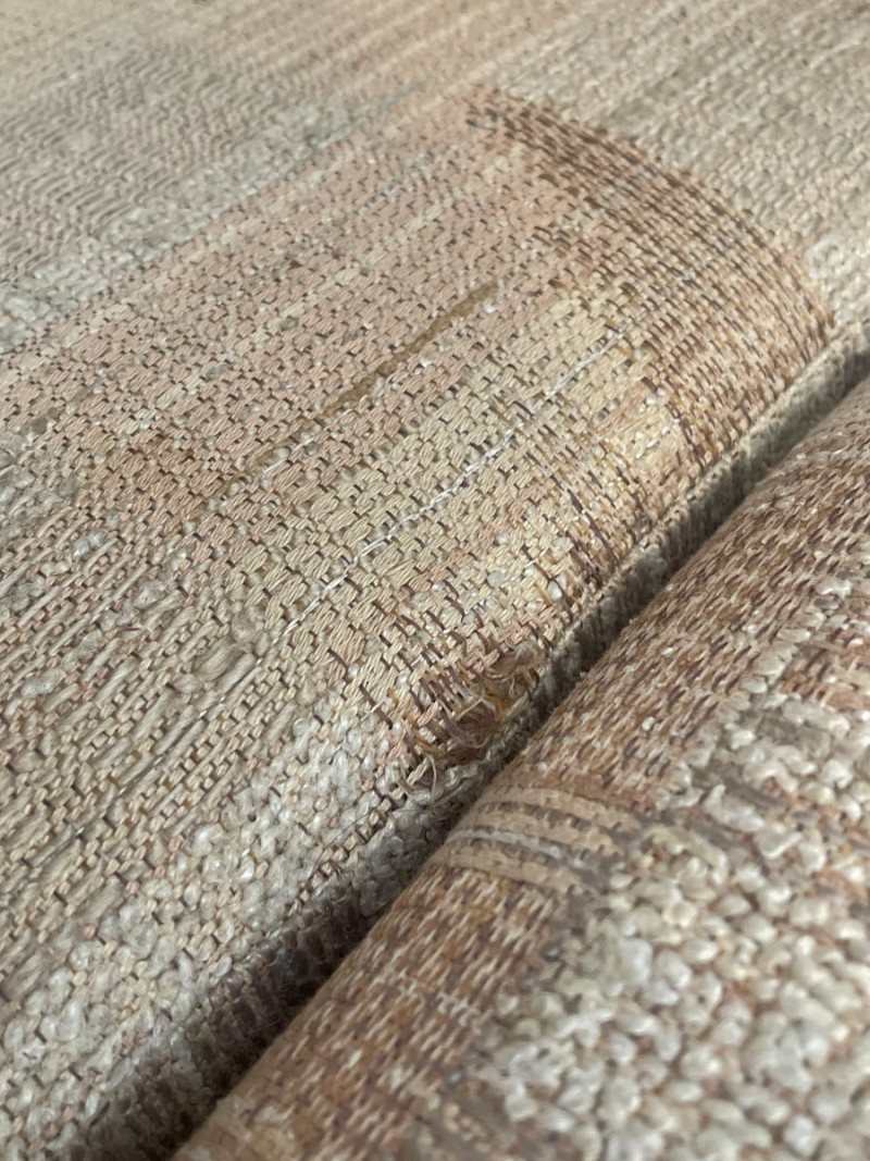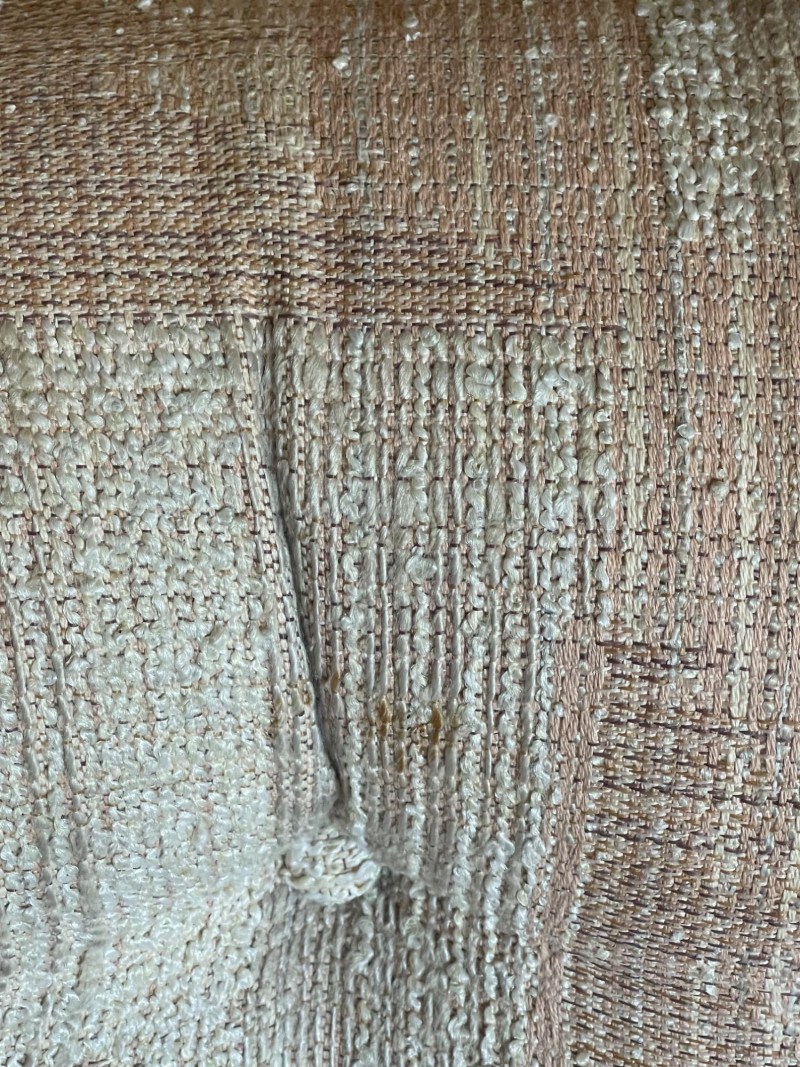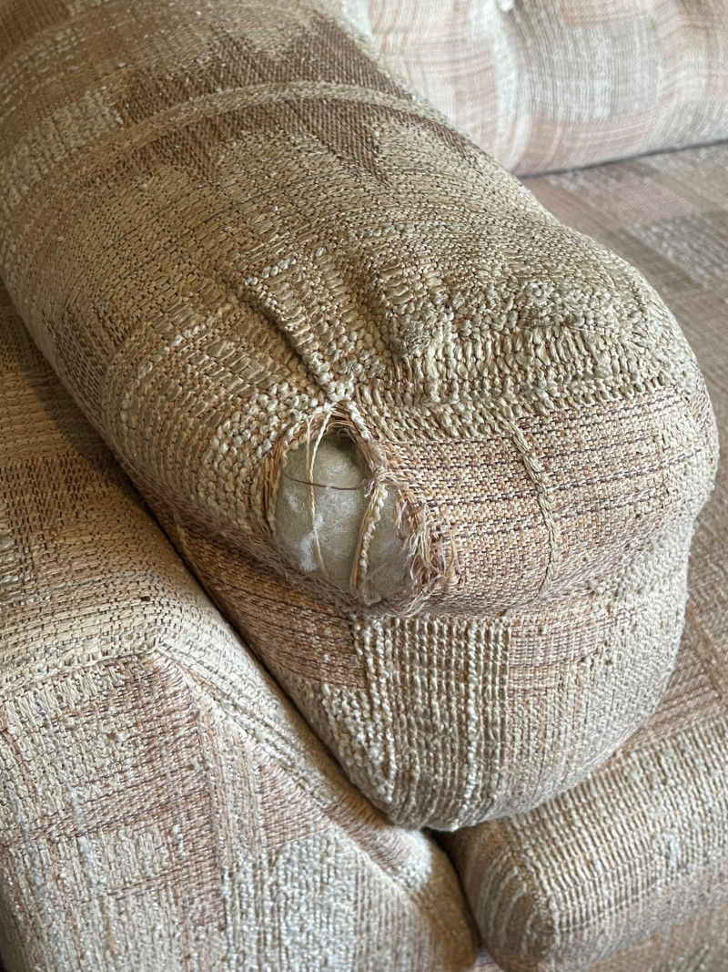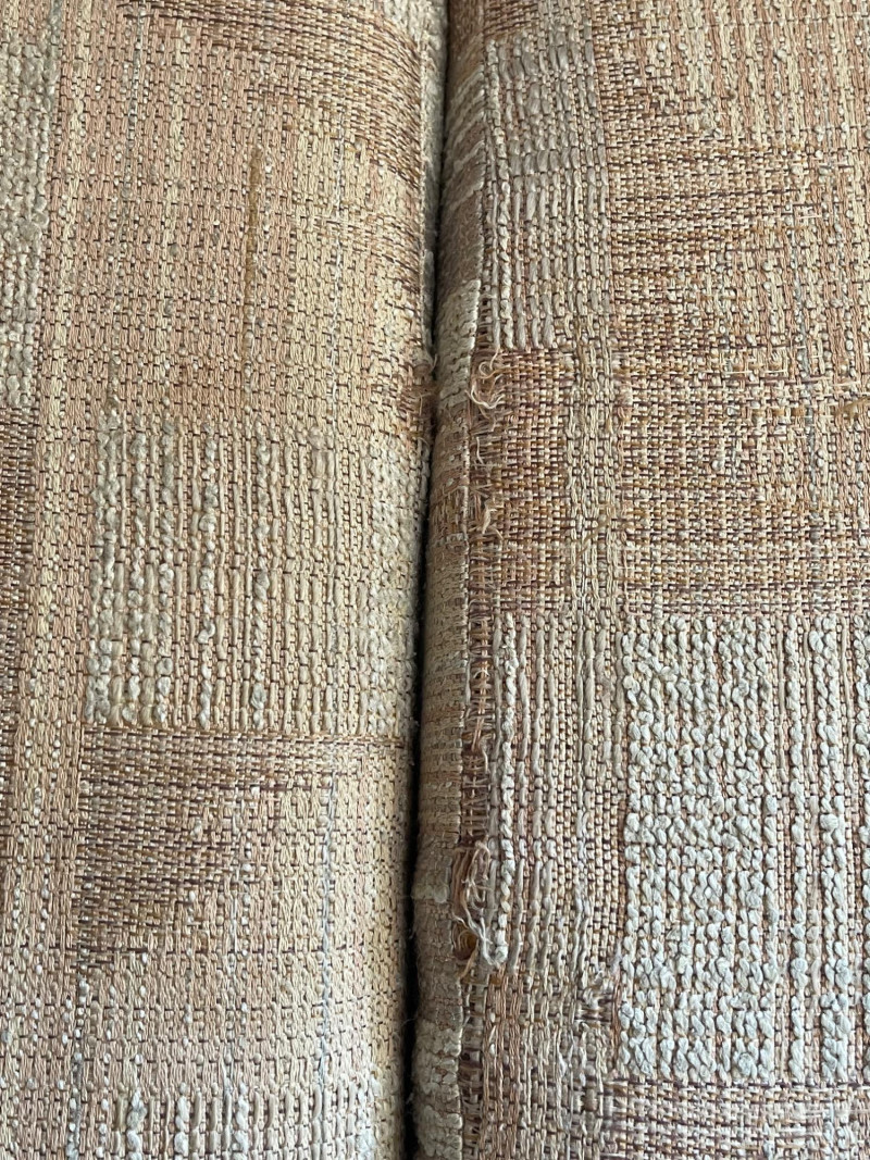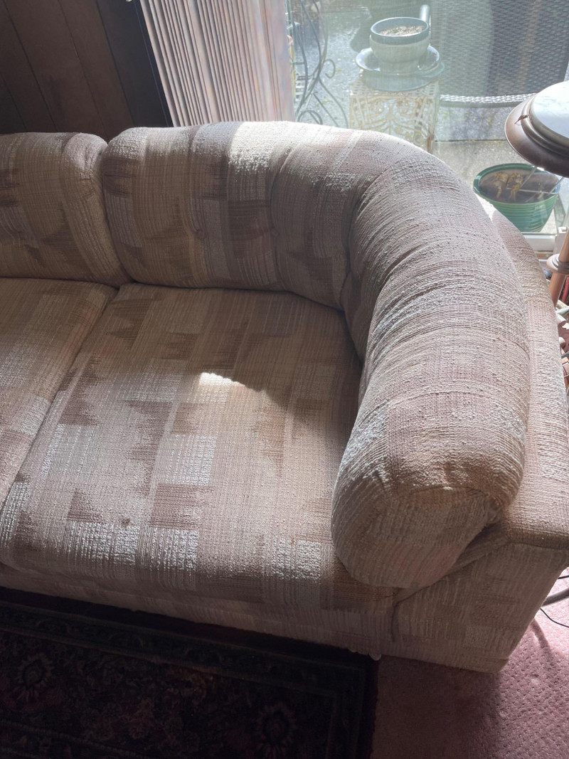 Vintage Slyter Magnuson Sectional Sofa & Ottoman A generously sized vintage sectional sofa and ottoman set by Slyter Magnuson, known for their well-crafted American-made furniture. This plush 3-piece set features the original geometric upholstery, tufted backs, and rounded pillow-style arms, offering both comfort and a distinctive retro aesthetic. The neutral palette and angular upholstery pattern reflect classic late 1980s–early 1990s design, making it an ideal statement piece for a vintage-inspired living space or cozy family room. Dimensions: Left Section: 98" L x 38" D x 27" H Right Section: 60" L x 38" D x 27" H Ottoman: 27" L x 26" D x 16" H Seat Depth: Approx. 25" Condition: Good vintage condition with light, age-appropriate wear.
