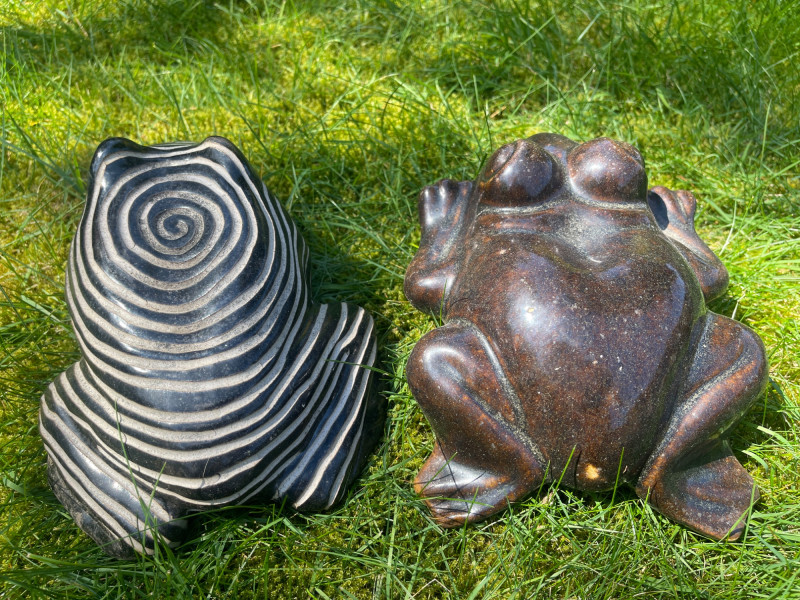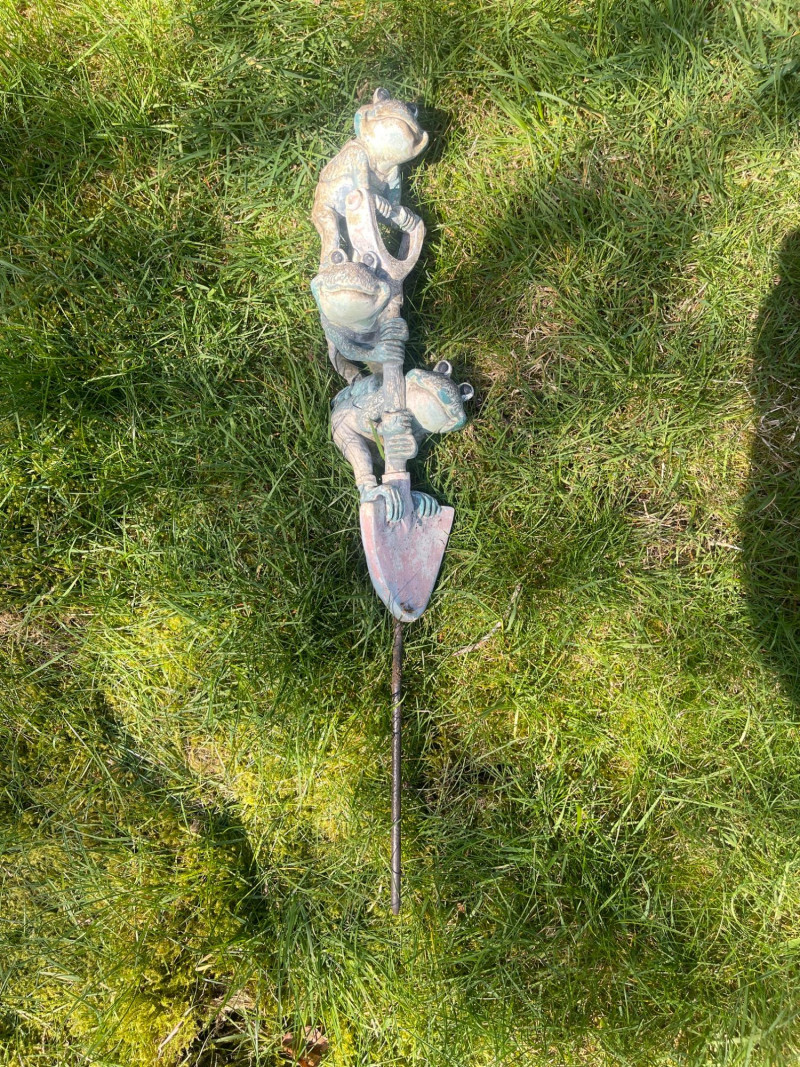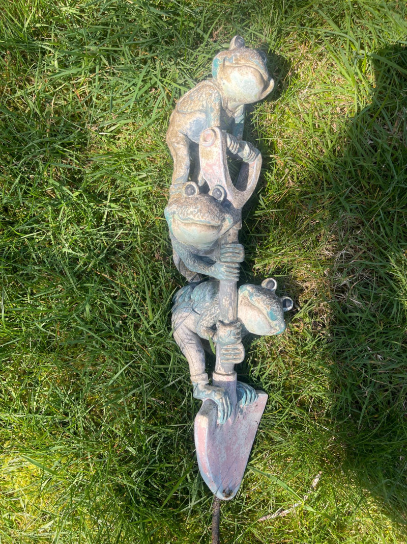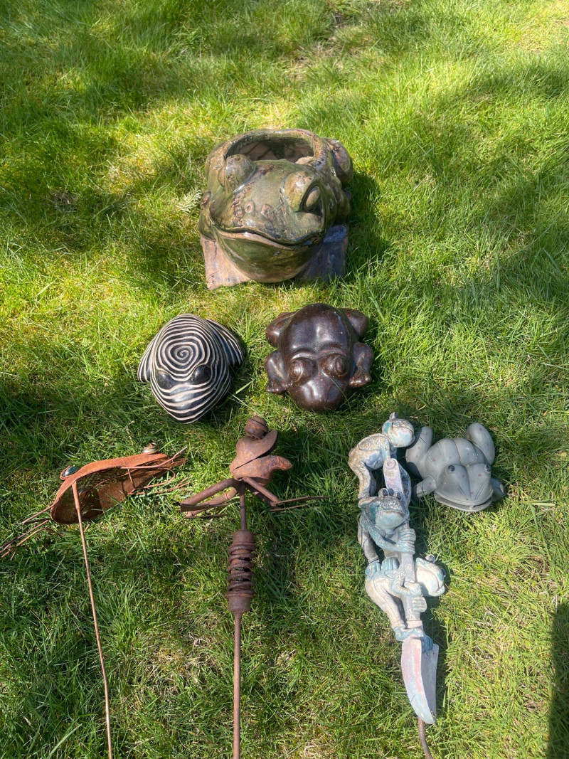 A playful garden collection featuring 8 charming frog-themed pieces in varying materials and styles. Includes: Large Ceramic Frog Planter – Glossy green glaze, open back for planting. Black & White Swirl Frog – Eye-catching stone sculpture with hypnotic stripe pattern. Speckled Brown Frog – Smooth soapstone or composite with a polished finish. Patina Metal Frog Trio on Spade Stake – Three whimsical frogs climbing a garden trowel, ideal for planting beds. Painted Cement Frog – Small outdoor sculpture with subtle red speckling and expressive detail. Rust Mesh Frog with Glass Eyes – Folk art sculpture with colorful beaded accents, full of personality. Scrap Metal Frog Figure on Stake – Crafted from springs, bolts, and sheet metal; delightfully quirky.