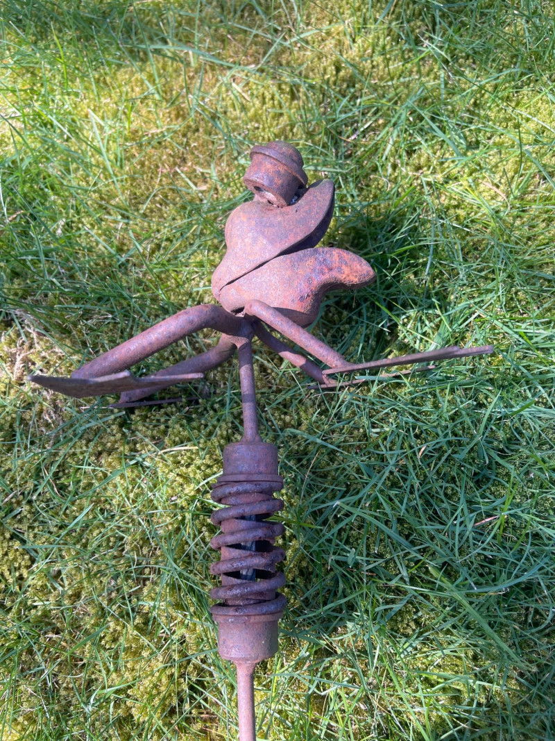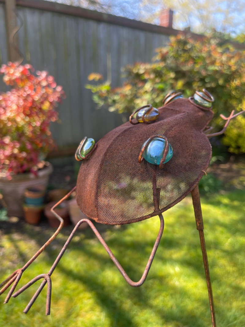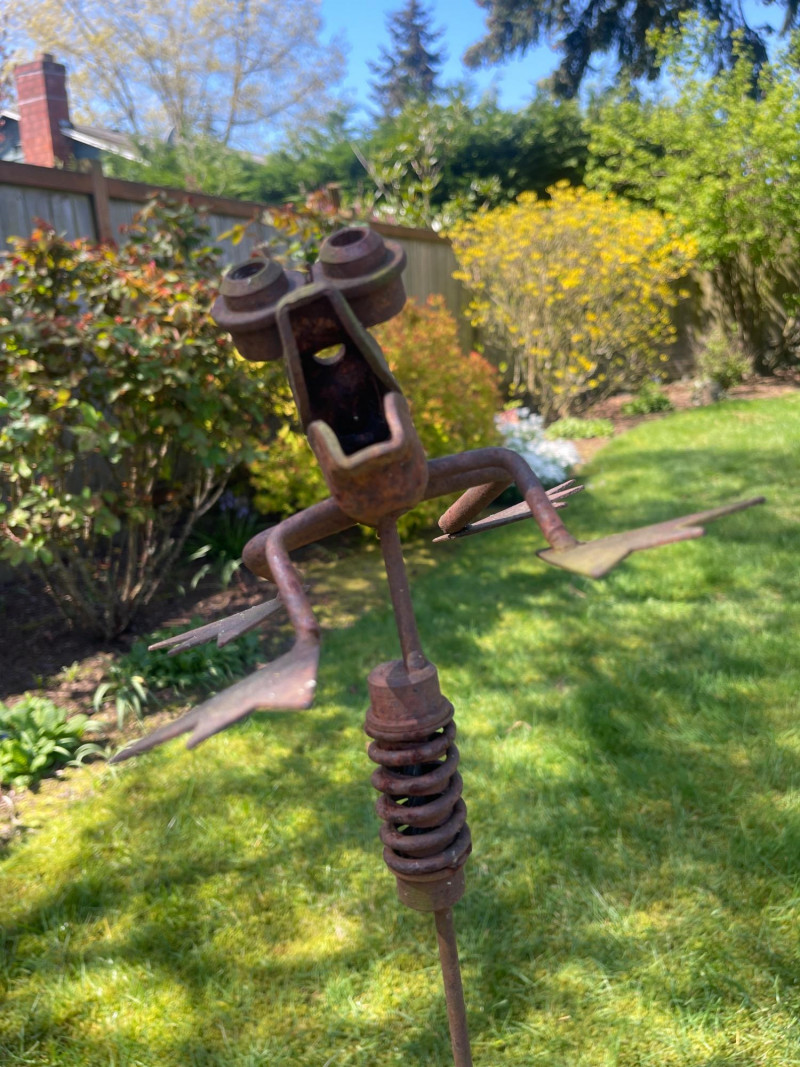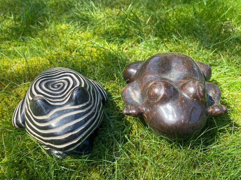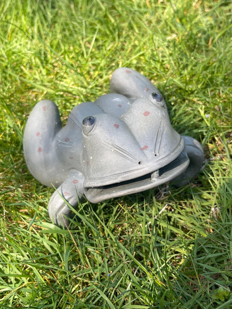 A playful garden collection featuring 8 charming frog-themed pieces in varying materials and styles. Includes: Large Ceramic Frog Planter – Glossy green glaze, open back for planting. Black & White Swirl Frog – Eye-catching stone sculpture with hypnotic stripe pattern. Speckled Brown Frog – Smooth soapstone or composite with a polished finish. Patina Metal Frog Trio on Spade Stake – Three whimsical frogs climbing a garden trowel, ideal for planting beds. Painted Cement Frog – Small outdoor sculpture with subtle red speckling and expressive detail. Rust Mesh Frog with Glass Eyes – Folk art sculpture with colorful beaded accents, full of personality. Scrap Metal Frog Figure on Stake – Crafted from springs, bolts, and sheet metal; delightfully quirky.