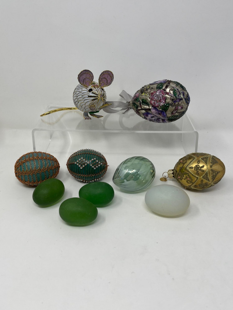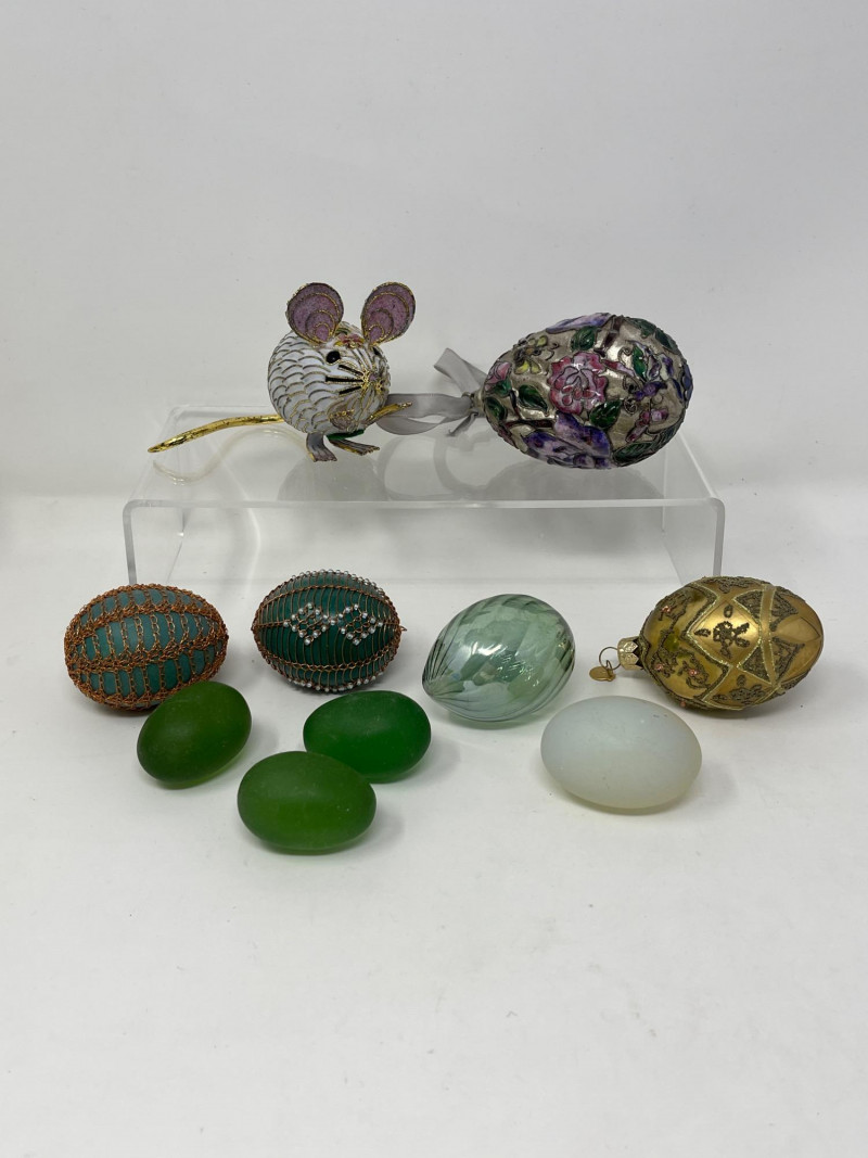 Assorted Decorative Eggs & Enamel Rat Figurine – Glass, Cloisonné & More (2–4” L)