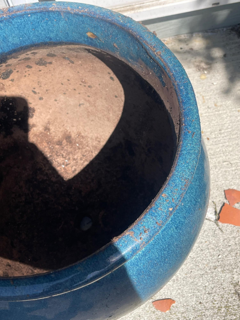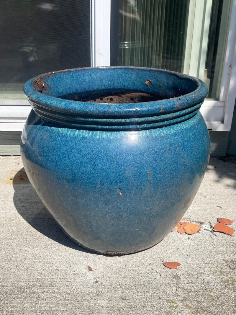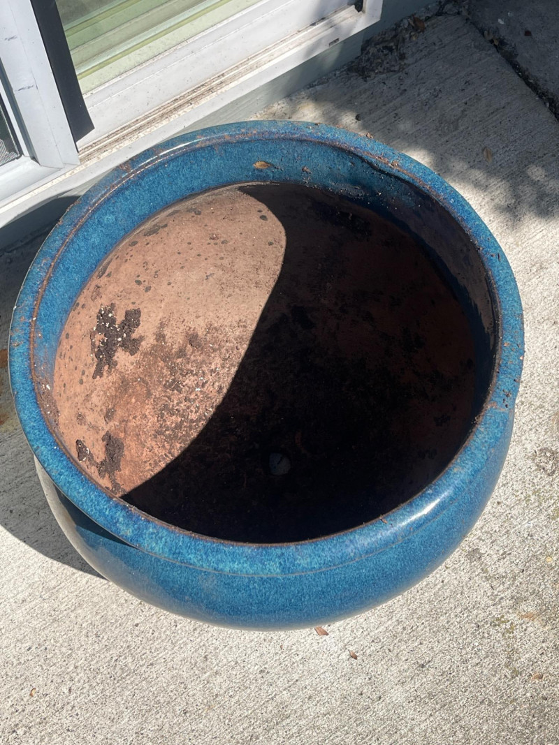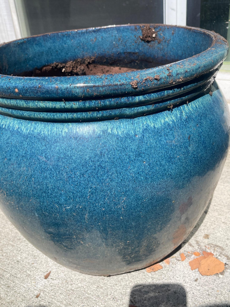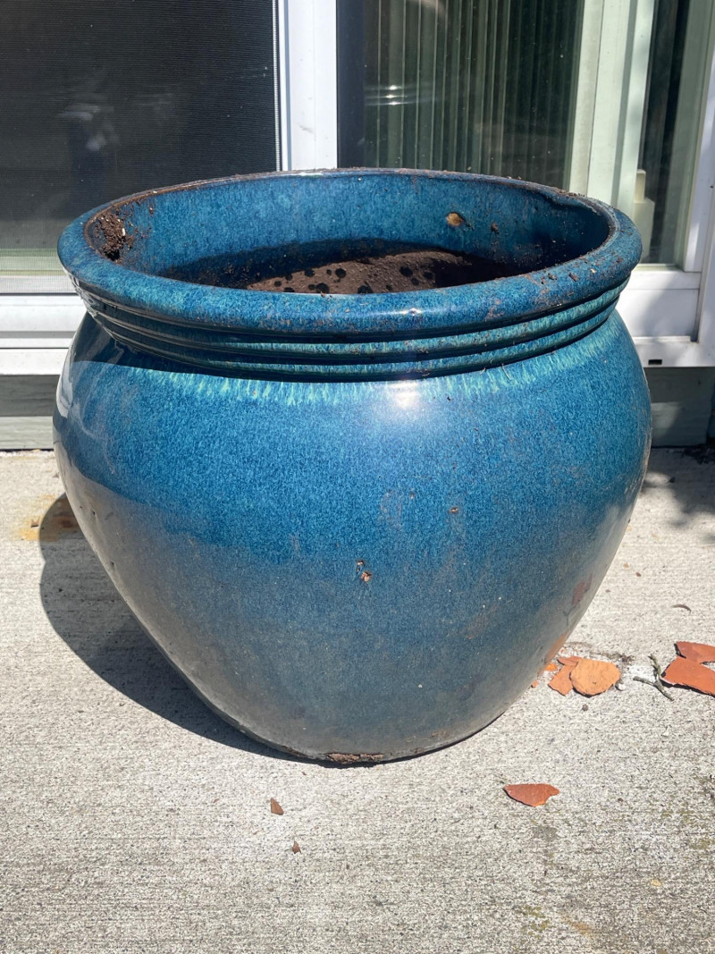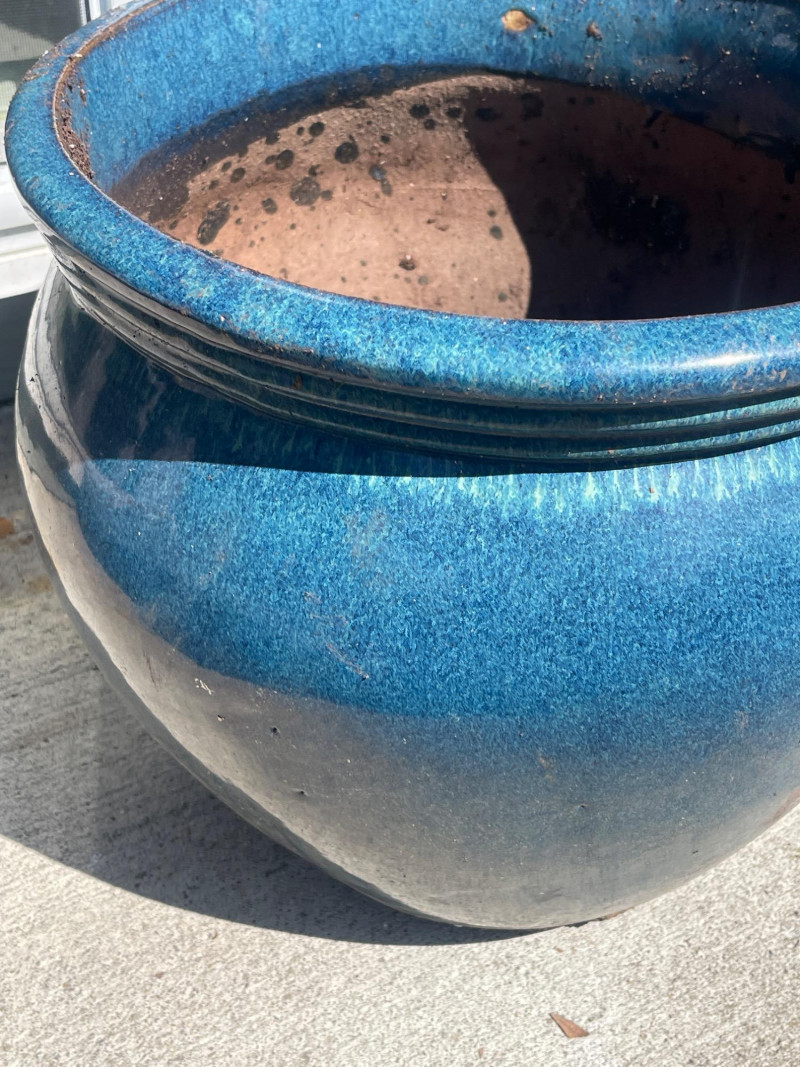 Large Blue Glazed Ceramic Planter Pot – 14" W x 12.5" H Beautifully finished with a rich blue glaze, this large ceramic garden planter adds a bold pop of color to any patio or outdoor space. Gently rounded form with thick rim detailing. Previously used, with interior soil residue and minor wear consistent with outdoor use. No visible cracks or major chips. Dimensions: Perfect for statement plantings, small shrubs, or ornamental arrangements.