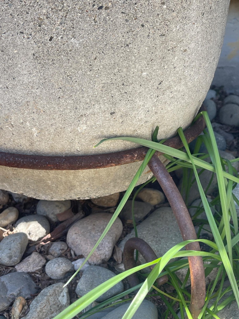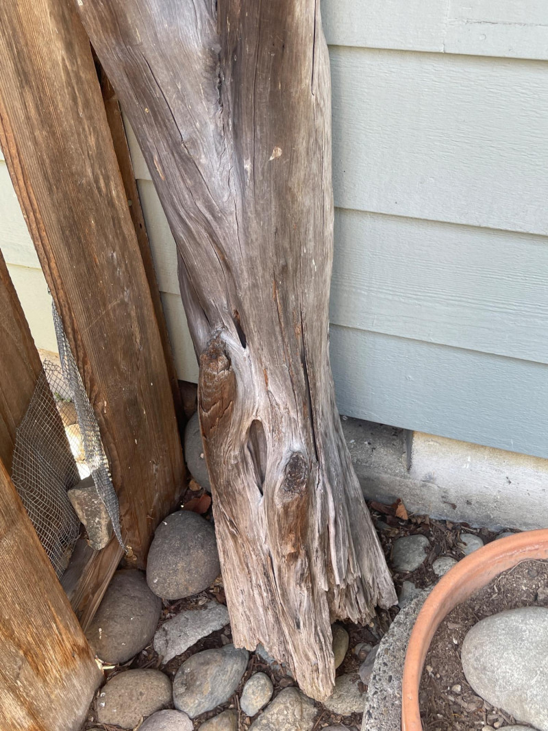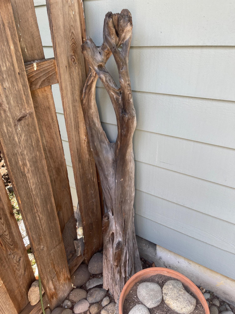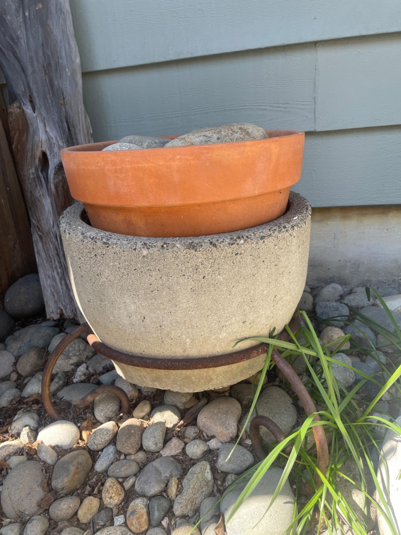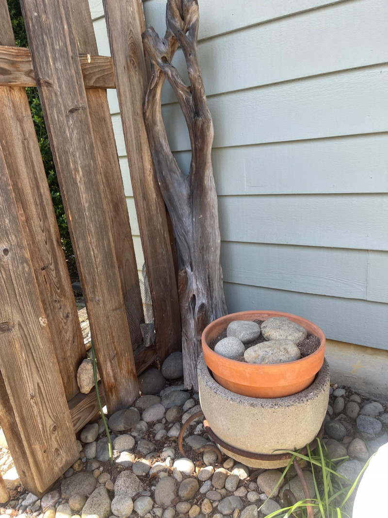 Outdoor Driftwood Sculpture & Cement Planter w/ Stand Lot includes a striking 53” tall natural driftwood sculpture—perfect as a rustic garden accent or interior art piece—paired with a 13” high cement planter set on a rusted iron stand. Also includes a terracotta pot nested inside the planter, currently filled with river stones. A sculptural, earthy set for patio, garden, or indoor zen space.