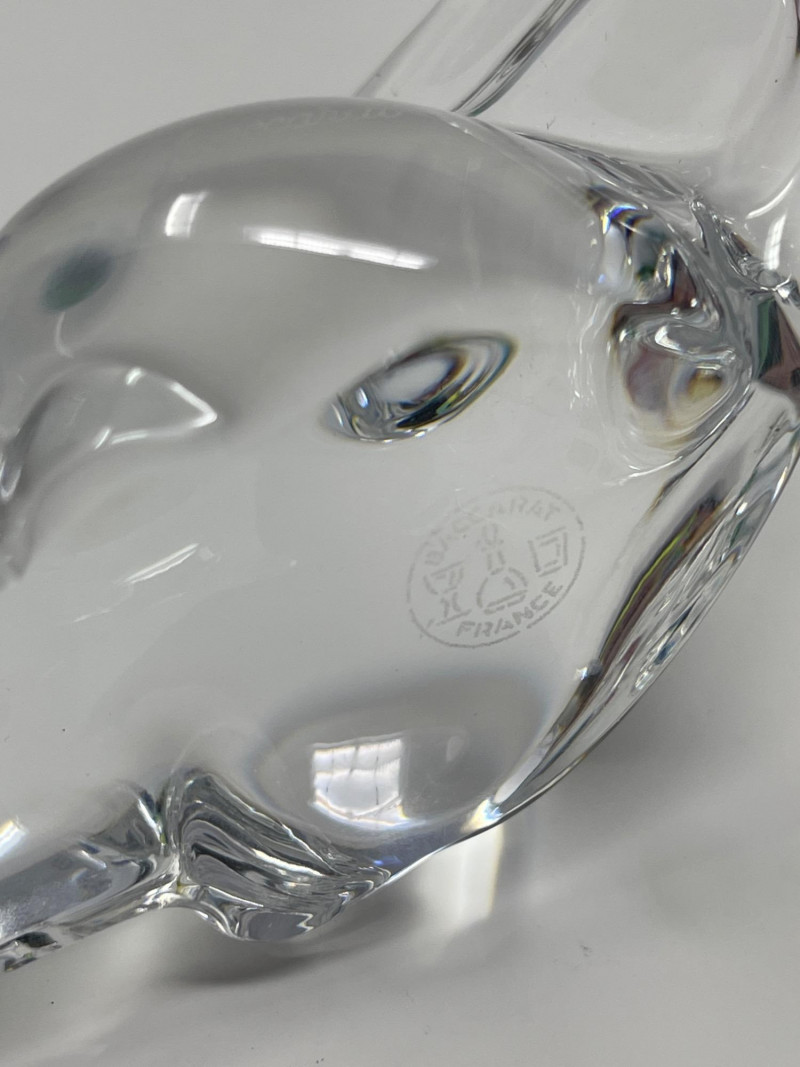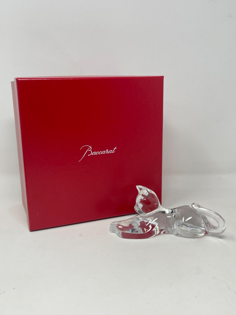 Elegant signed Baccarat crystal cat figurine, beautifully crafted in France with the iconic etched Baccarat hallmark on the base. Measures approximately 5.5" L x 2.5" H. Comes with a red Baccarat box, though it is likely not the original for this specific piece. Figurine is in excellent condition with no chips or cracks. A timeless piece for collectors or cat lovers alike.