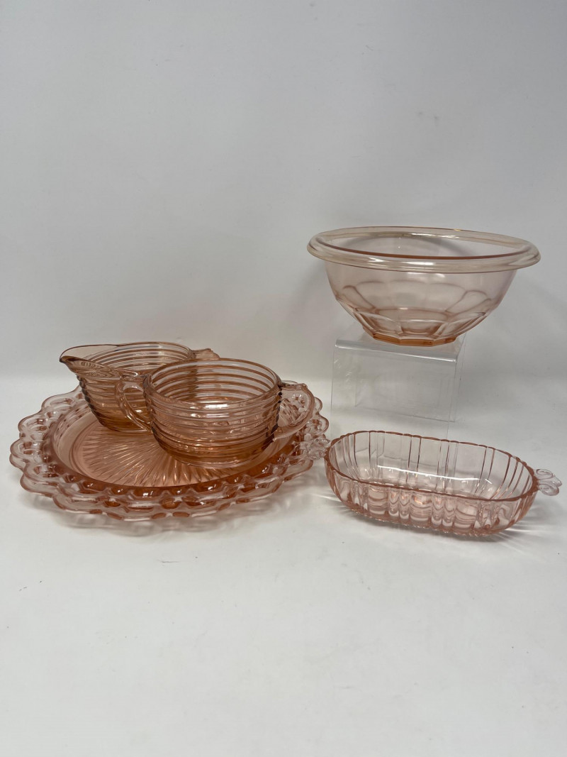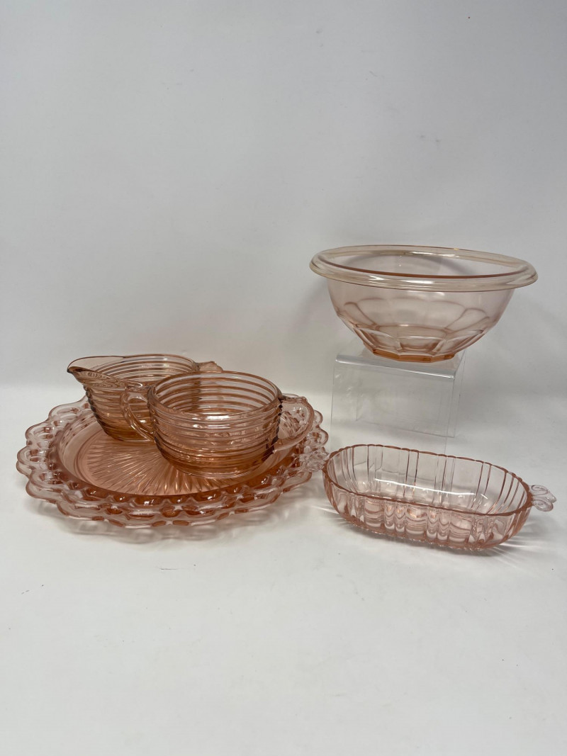 Vintage Pink Depression Glass Assortment – Plates, Bowl, Creamer & Sugar