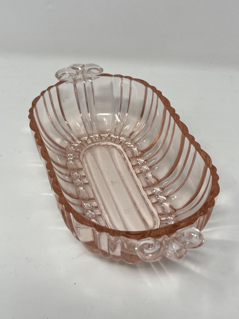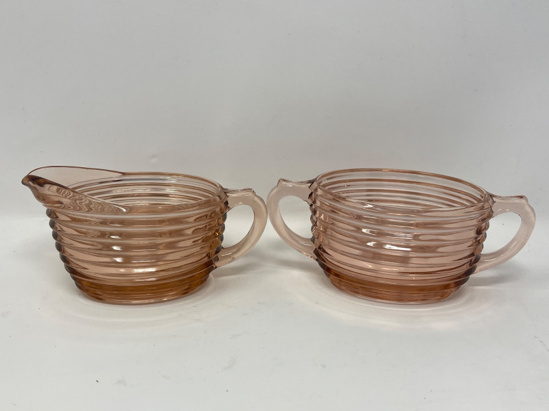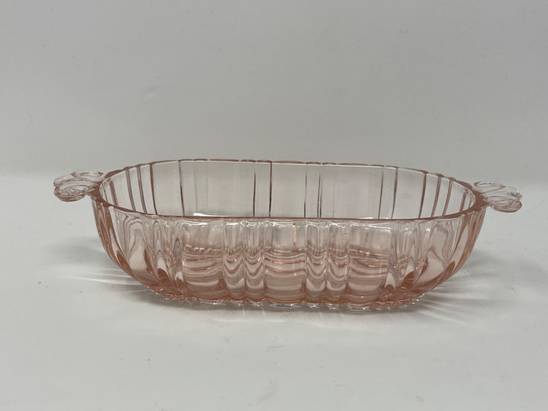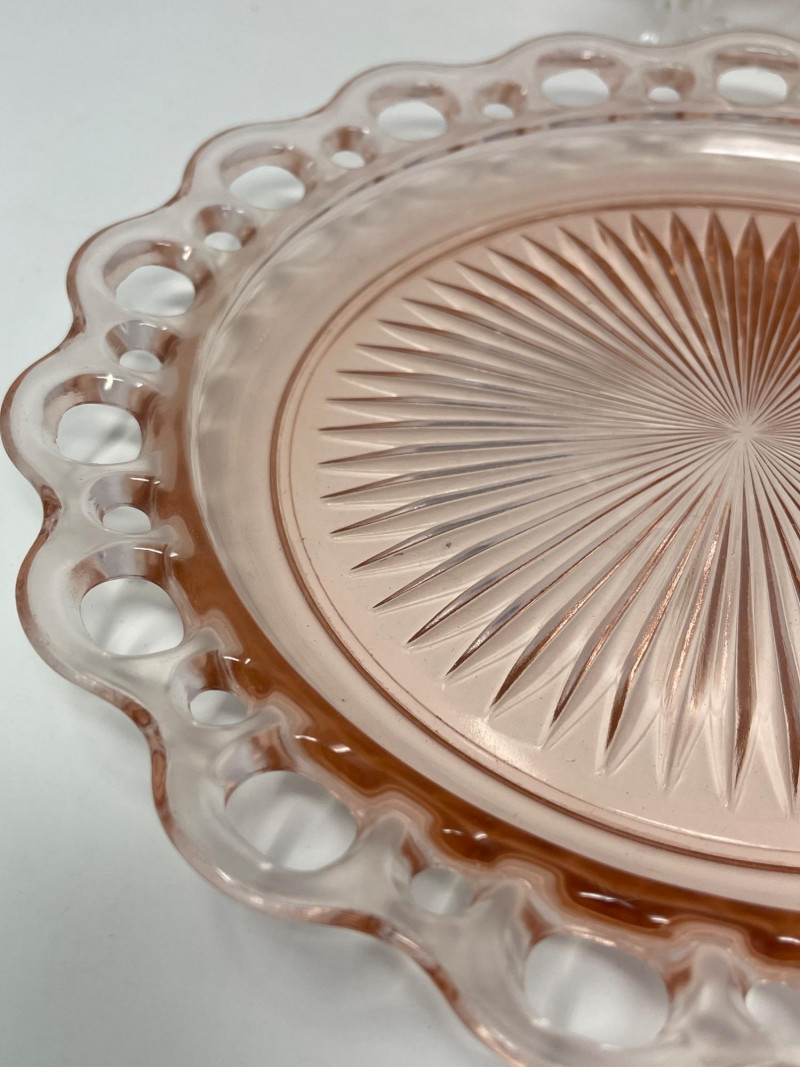 A charming 6-piece collection of vintage pink Depression glass, offering a warm, nostalgic hue and iconic 1930s-40s American design. This assorted grouping includes both functional and decorative pieces in varying styles and patterns—ideal for collectors, display, or vintage-themed dining. Each piece showcases the elegance and delicate craftsmanship characteristic of Depression-era pressed glass. (2) Open Lace Edge Plates – 10.5" Diameter Mixing or Serving Bowl – 7.5" W x 3" H Oval Ribbed Dish with Scroll Handles – Approx. 8.5" W Creamer & Sugar Set – Ribbed Pattern