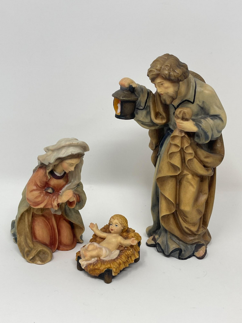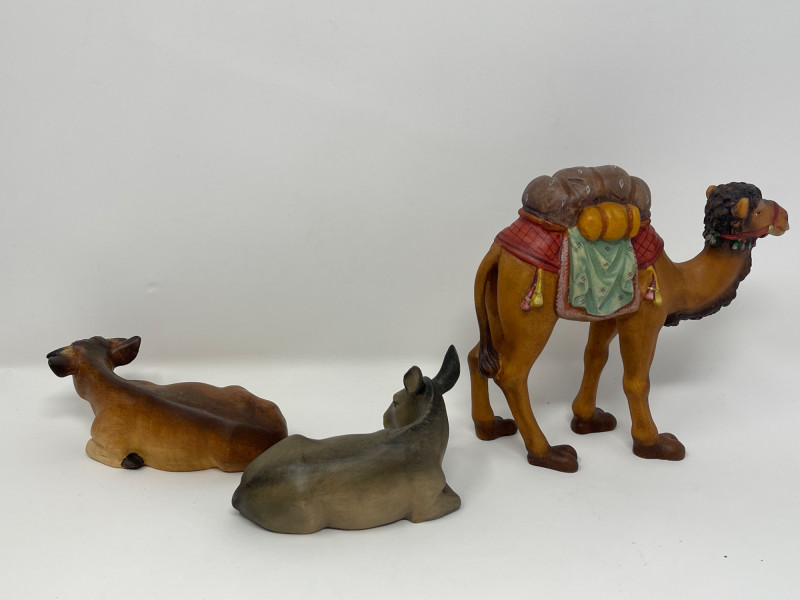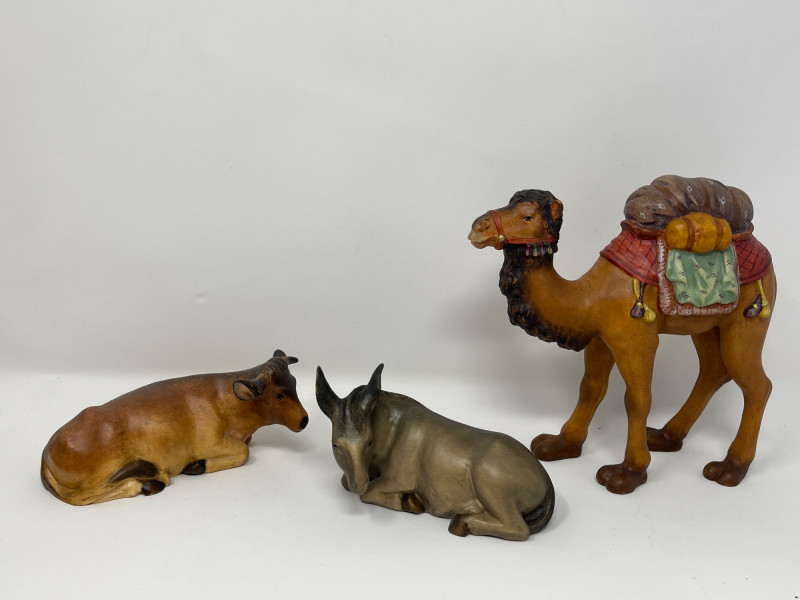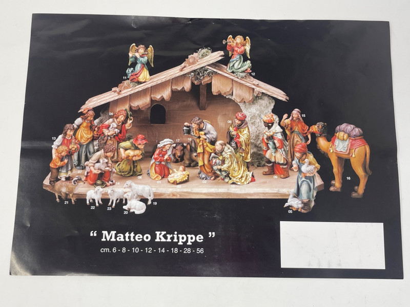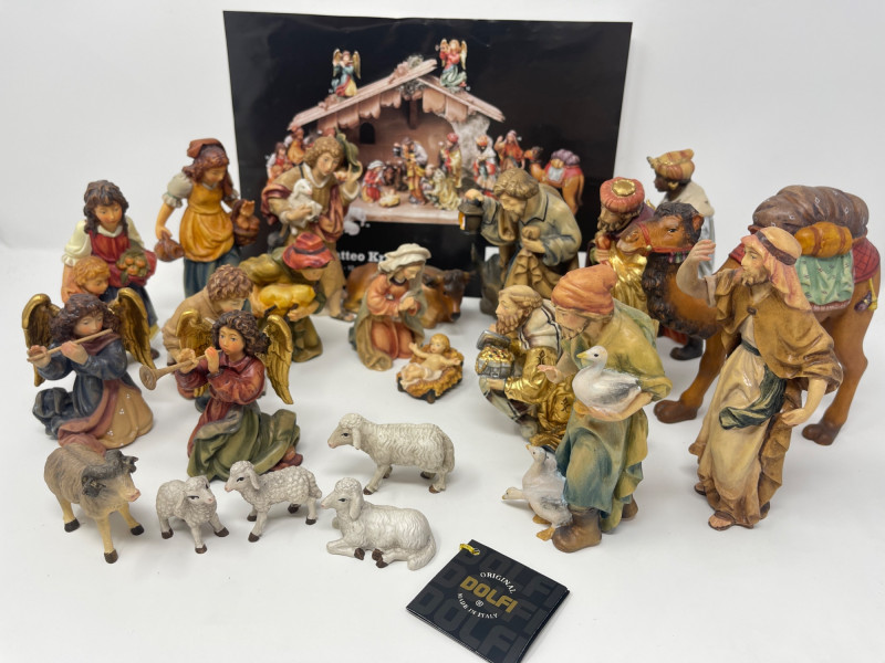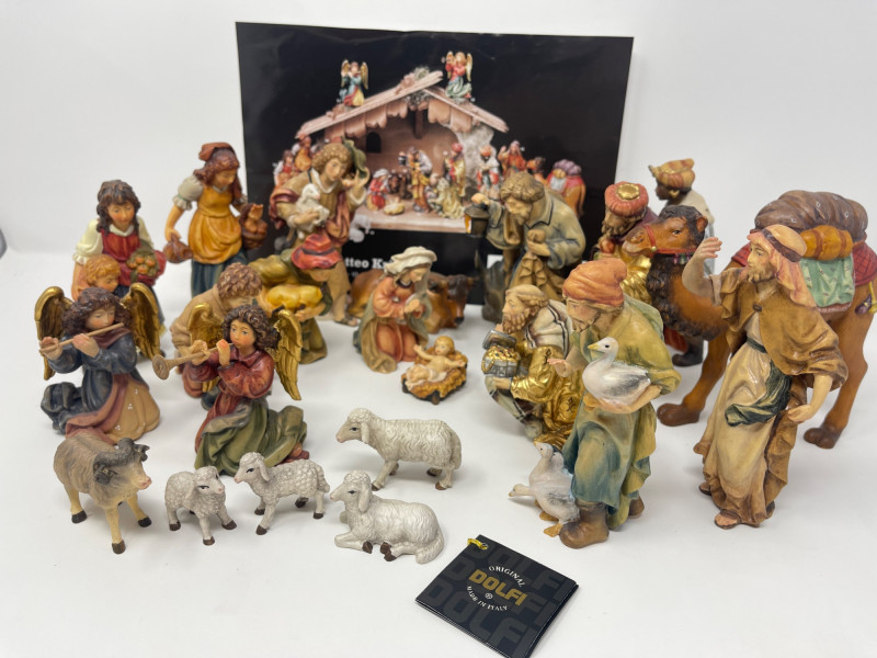 Beautiful 23-piece Italian nativity set by Dolfi, featuring intricately hand-carved and hand-painted wood figures measuring approximately 6 inches tall. Crafted in Italy in the “Matteo Krippe” style, this set includes the Holy Family, Three Kings, angels, shepherds, animals, and even a camel—each full of character and detail. The set is accompanied by the original identification guide. Excellent condition. Does NOT have barn piece. Estimated Market Value: A stunning heirloom-quality nativity set for collectors or holiday décor enthusiasts.