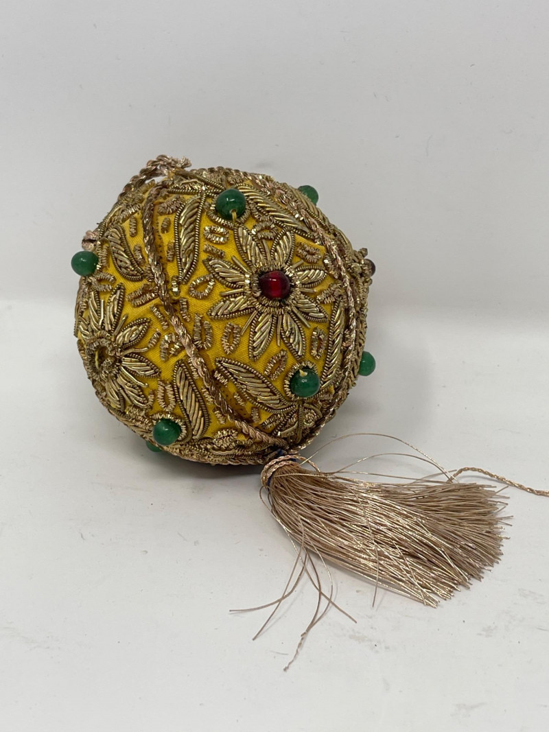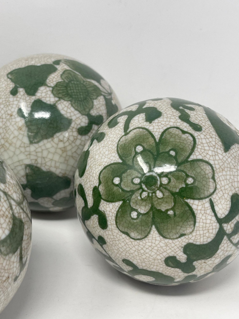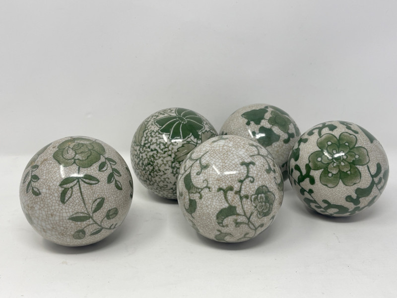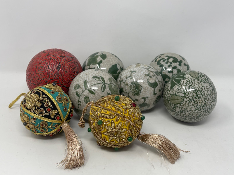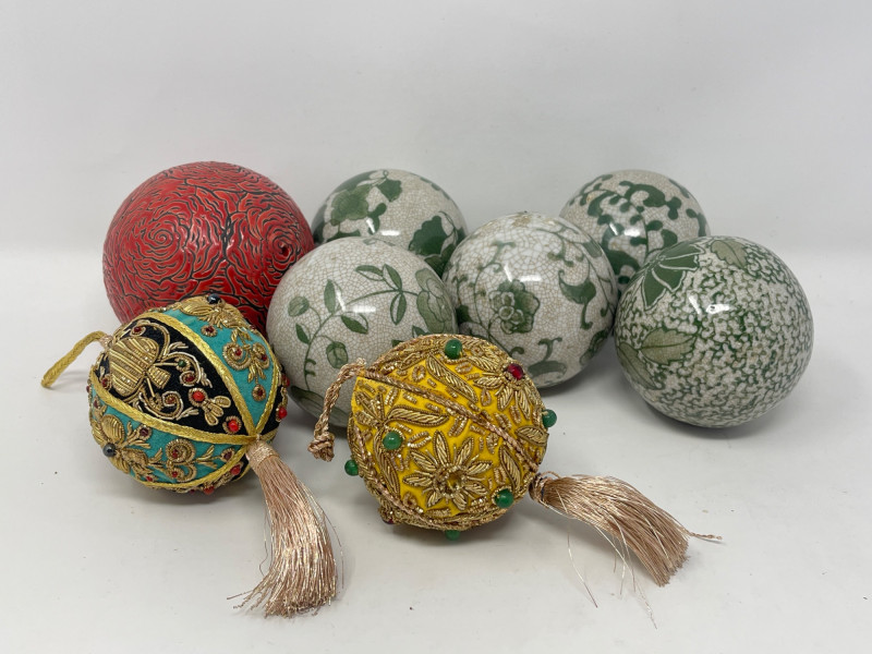 Charming collection of 8 decorative orbs ranging from approx. 3" to 3.5" in diameter. Includes six hand-painted crackle-glazed ceramic balls in sage green tones with floral and vine patterns, one carved red cinnabar-style resin orb with swirling floral motifs, and two ornate textile-wrapped balls embellished with gold embroidery, glass beads, and metallic tassels—one in turquoise/black and one in gold/yellow. Ideal for holiday decor, tabletop displays, or bowl fillers.