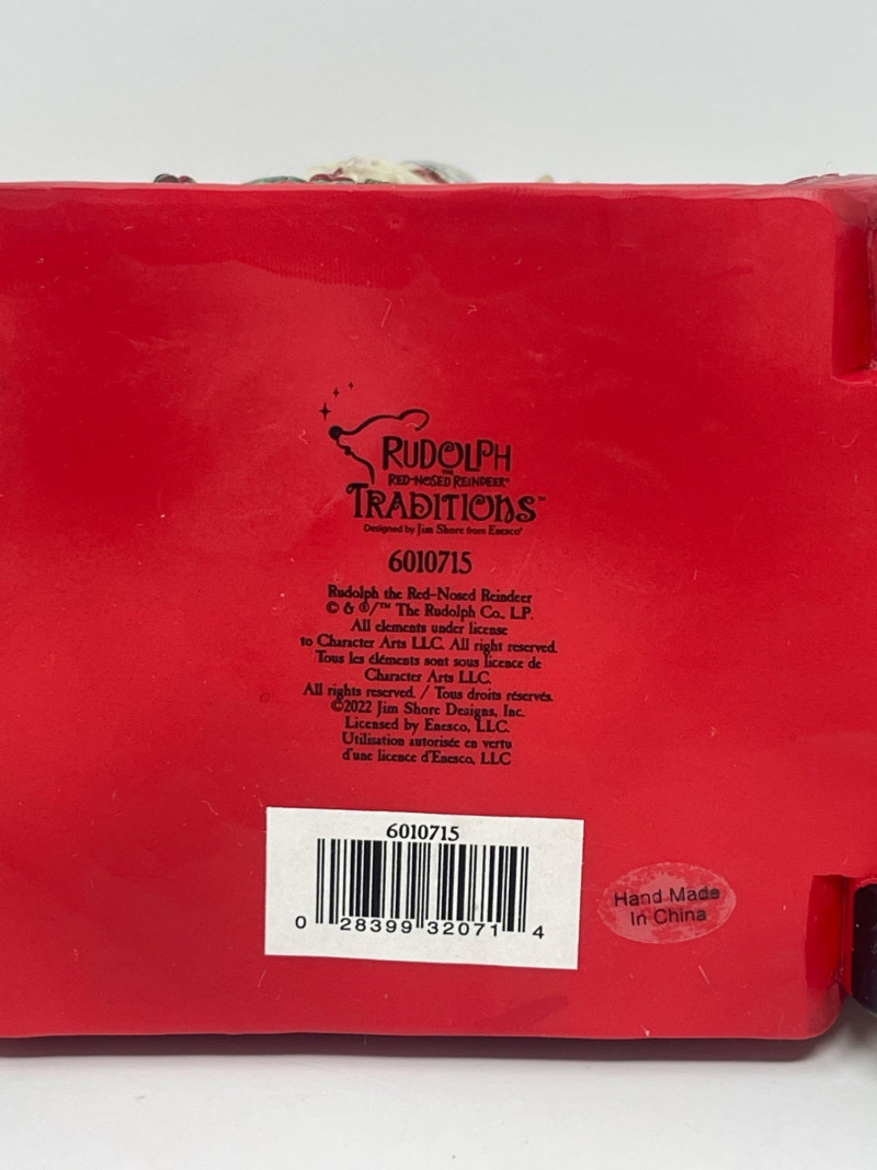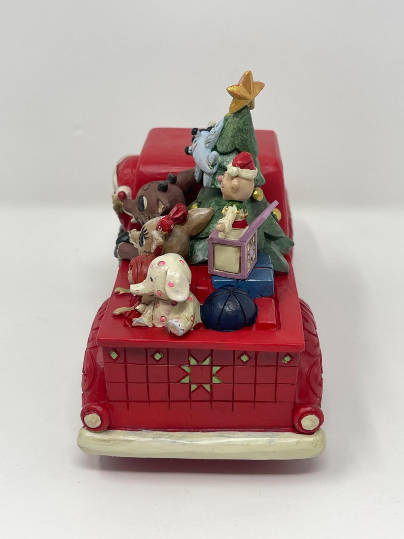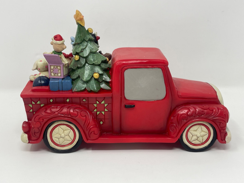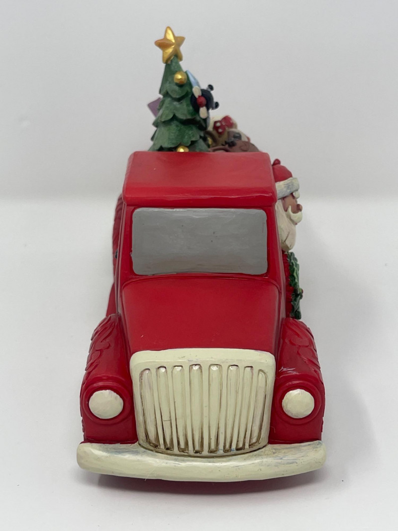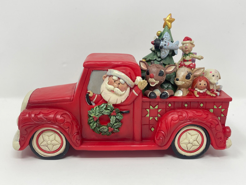 This festive hand-painted resin figure features Santa joyfully driving a bright red vintage truck filled with iconic characters from Rudolph the Red-Nosed Reindeer—including Rudolph, Clarice, Hermey the Elf, and Bumble—gathered around a decorated Christmas tree. Designed by Jim Shore in his signature folk-art style for the Rudolph Traditions® line, this piece is full of nostalgic charm and holiday cheer.