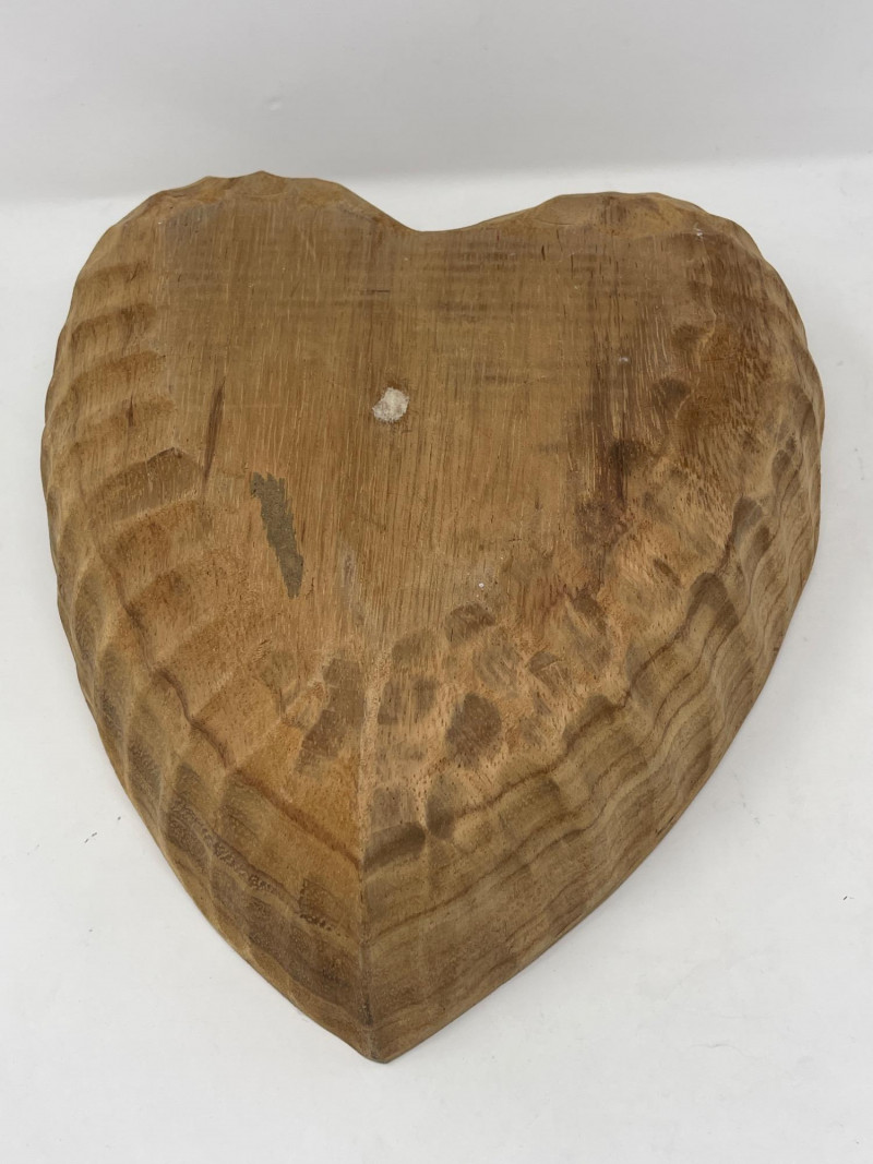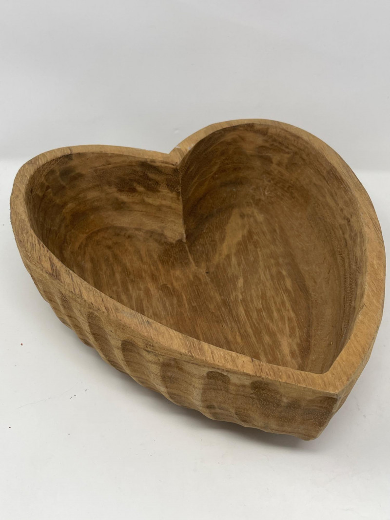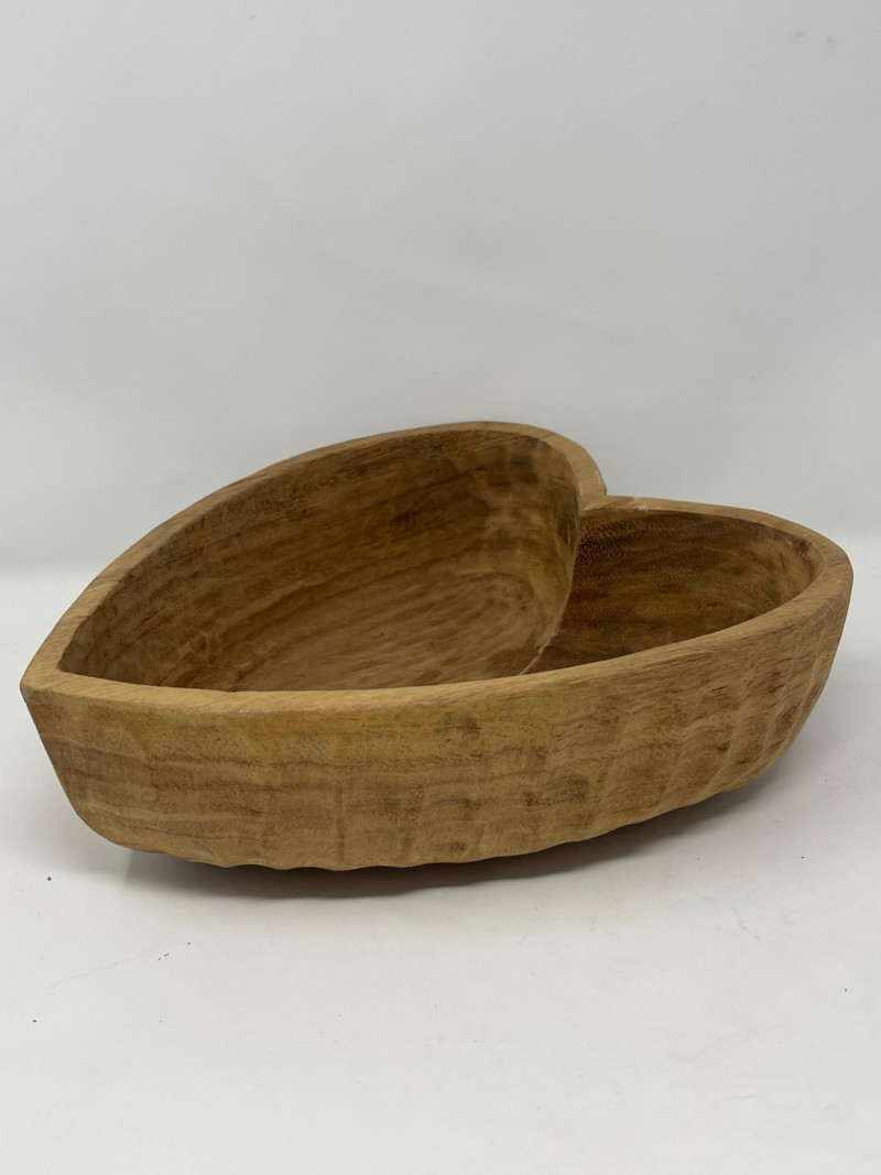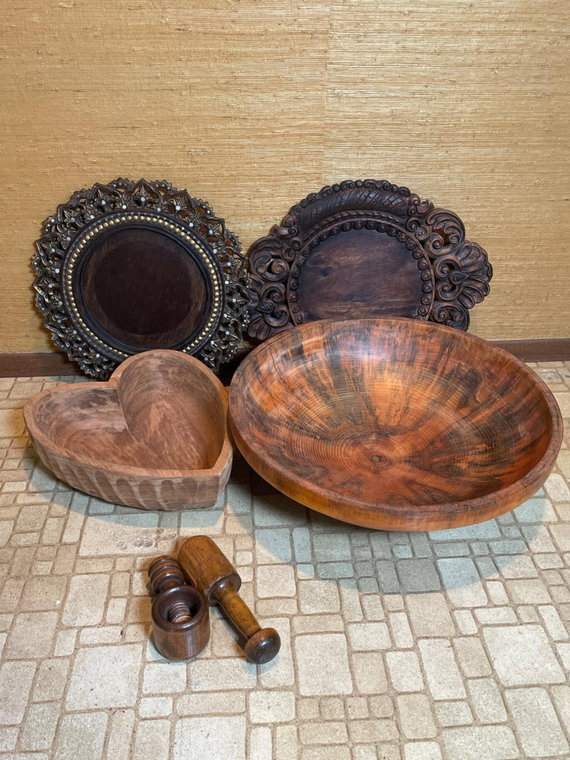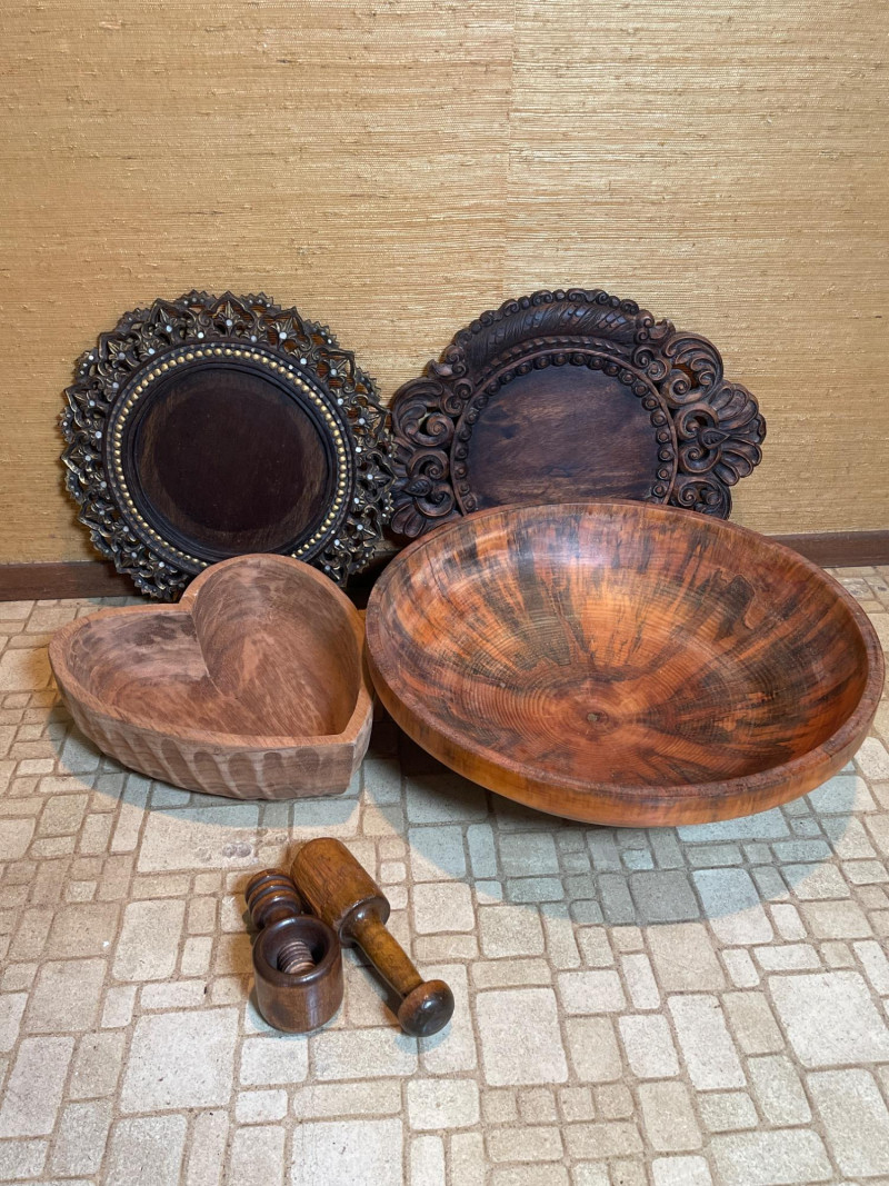 Rustic Carved Wood Kitchenware Lot – Bowls, Platters, Nutcracker Beautiful set of 5 hand-carved wooden kitchen and tableware items, featuring natural grain patterns, decorative craftsmanship, and functional vintage charm. Ideal for rustic home décor, food styling, or farmhouse-inspired serving pieces. 1. Large Decorative Platter – 17” Wide 2. Smaller Carved Platter – 14” Wide 3. Large Wooden Bowl – 17.5” Diameter x 5.5” High 4. Carved Heart-Shaped Bowl – 13” x 11” x 4” 5. Hand-Carved Nutcracker (Wood Mallet + Chamber)