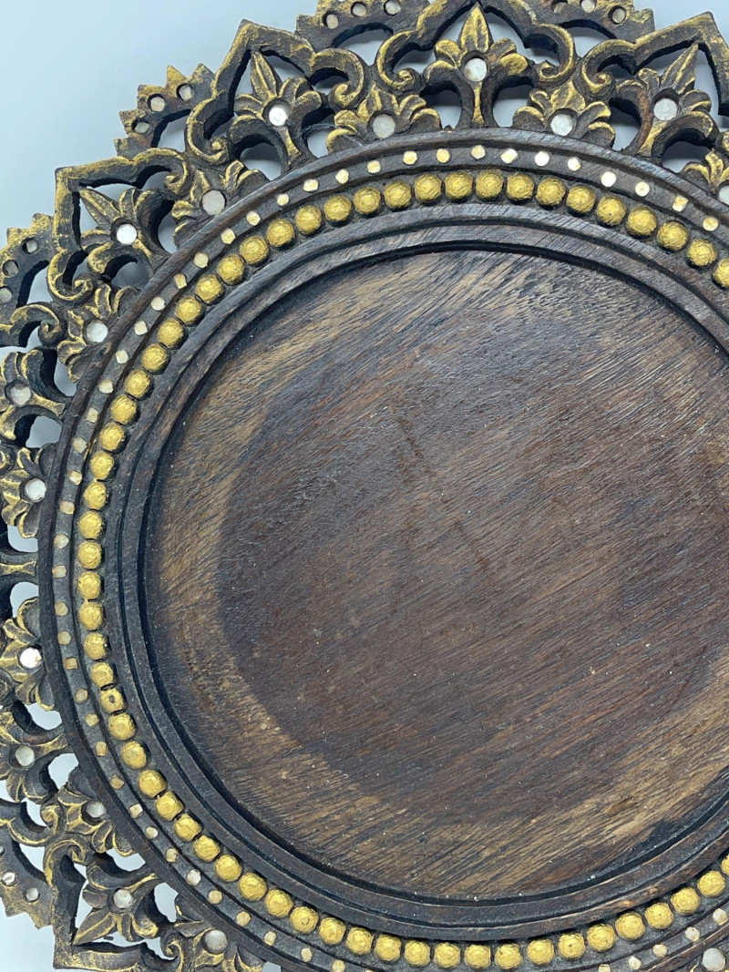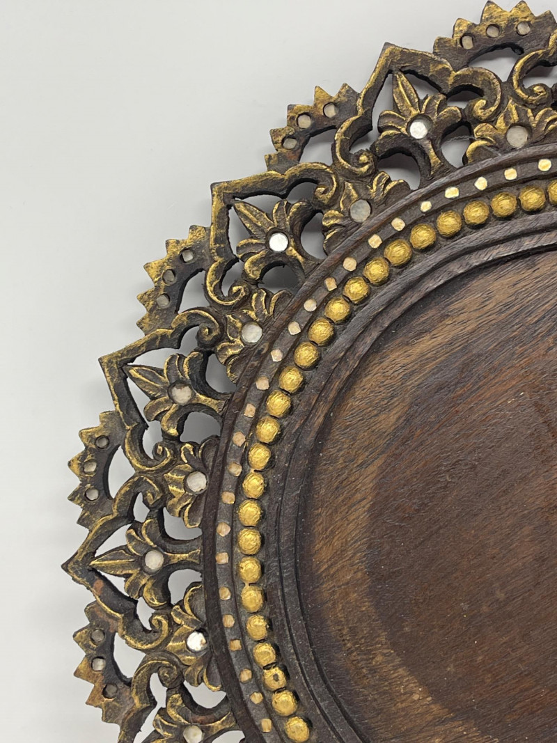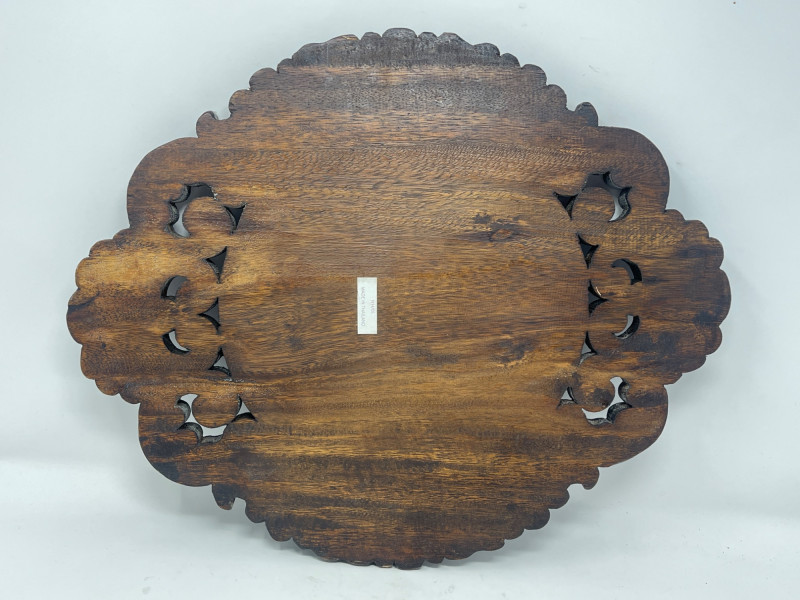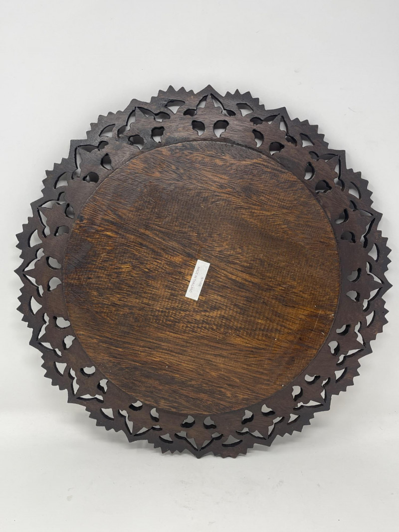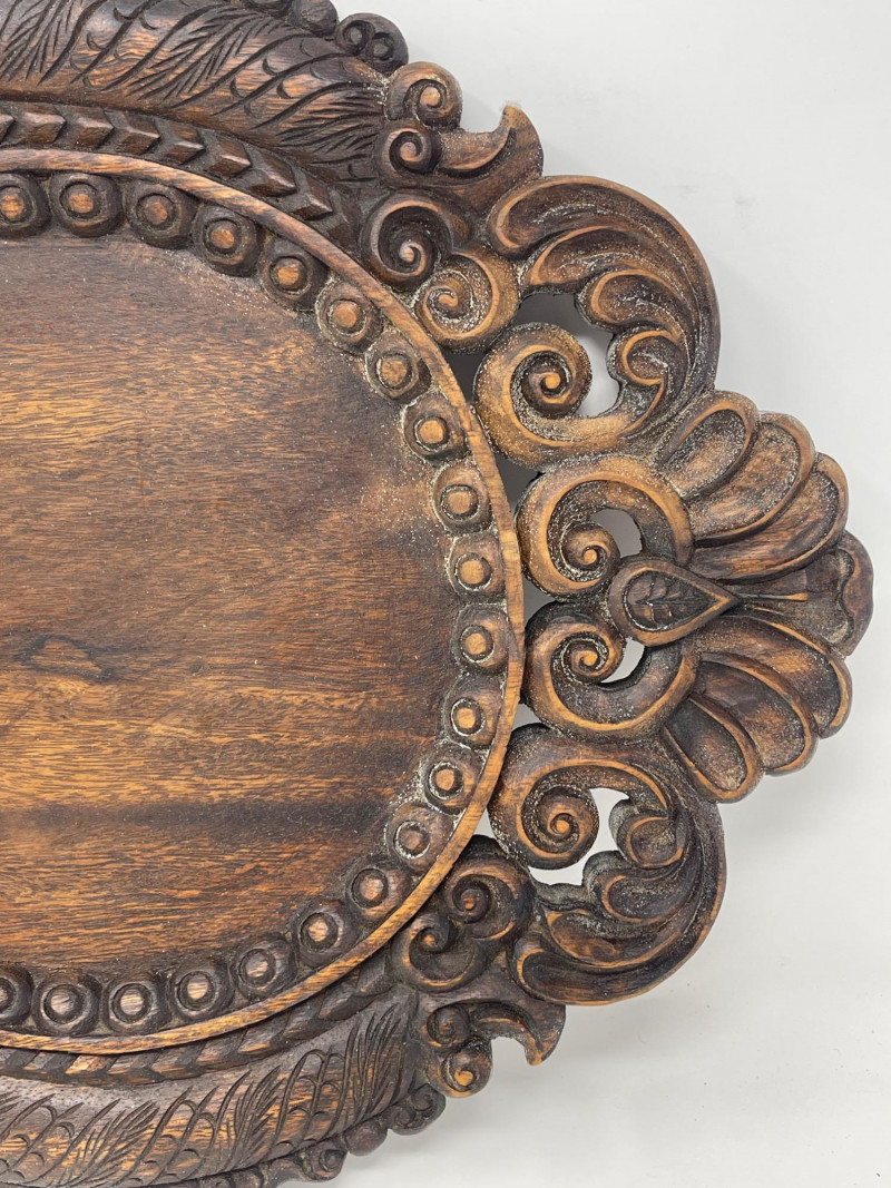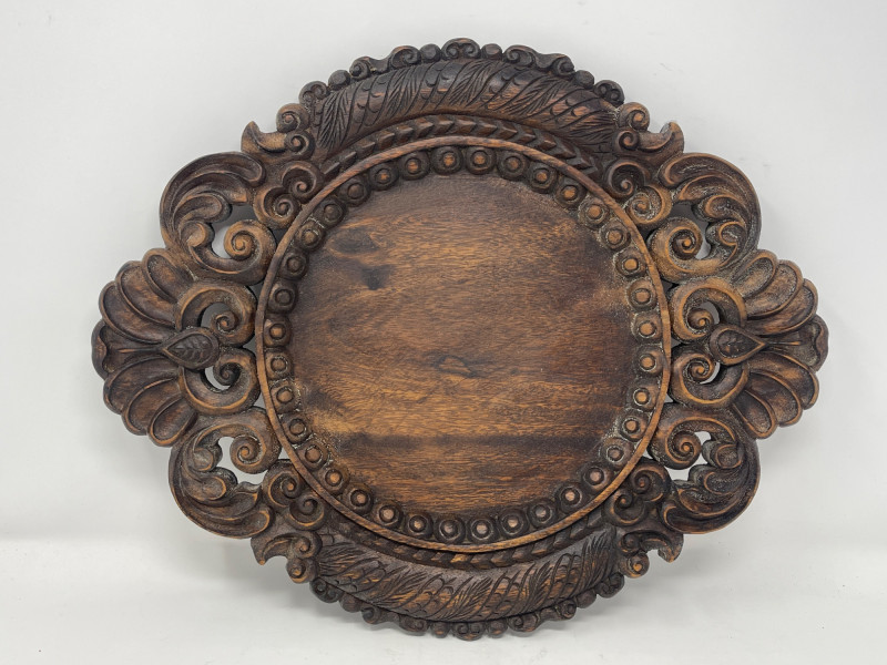 Intricately carved wood platter with floral/scroll accents, rich dark wood tone. Suitable as a wall display or centerpiece tray.