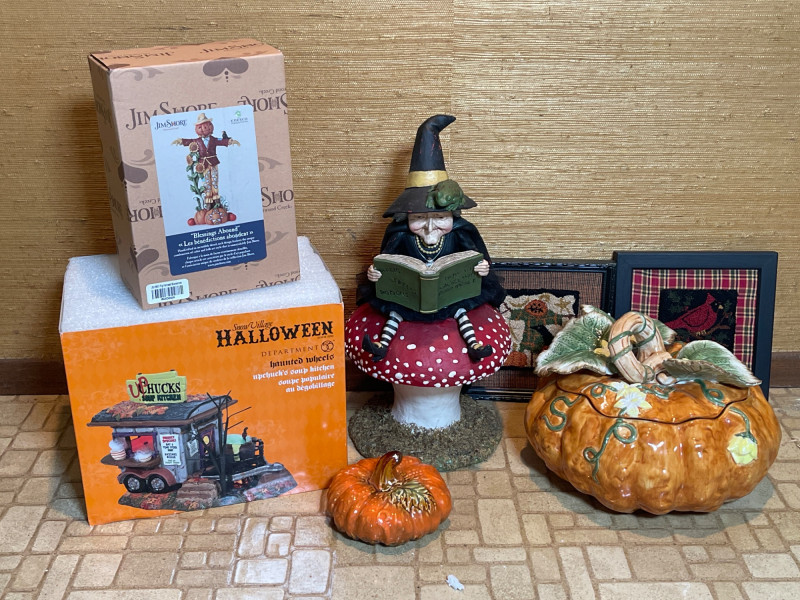 Halloween & Fall Decor - Fits & Floyd, Jim Shore, Department 56 + Celebrate the cozy charm of autumn and the playful spirit of Halloween with this diverse seasonal decor collection, featuring beloved brands and handcrafted details. This lot includes boxed collectibles, ceramics, folk art, and light-up pieces—perfect for festive home decorating or gifting.