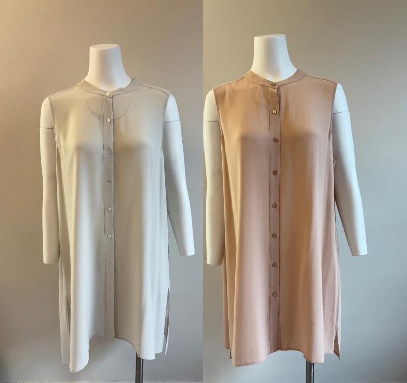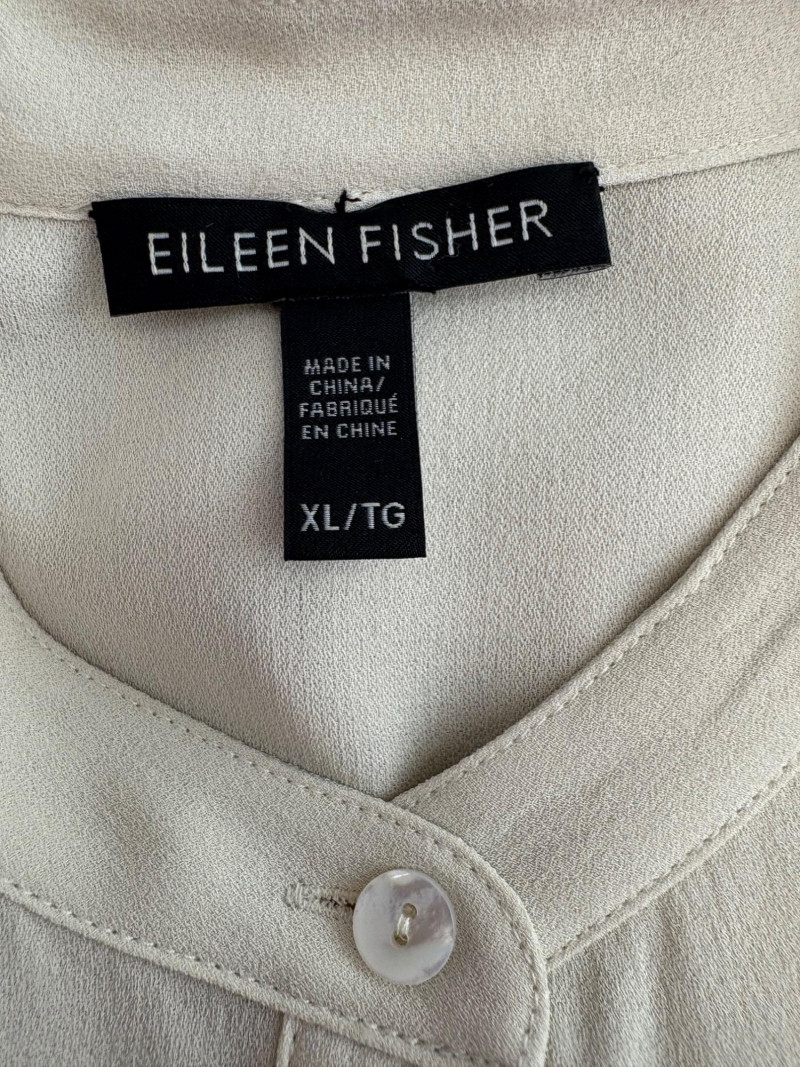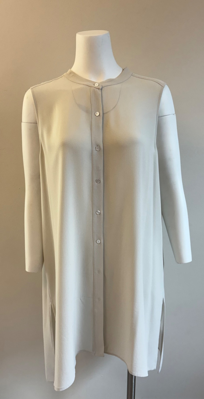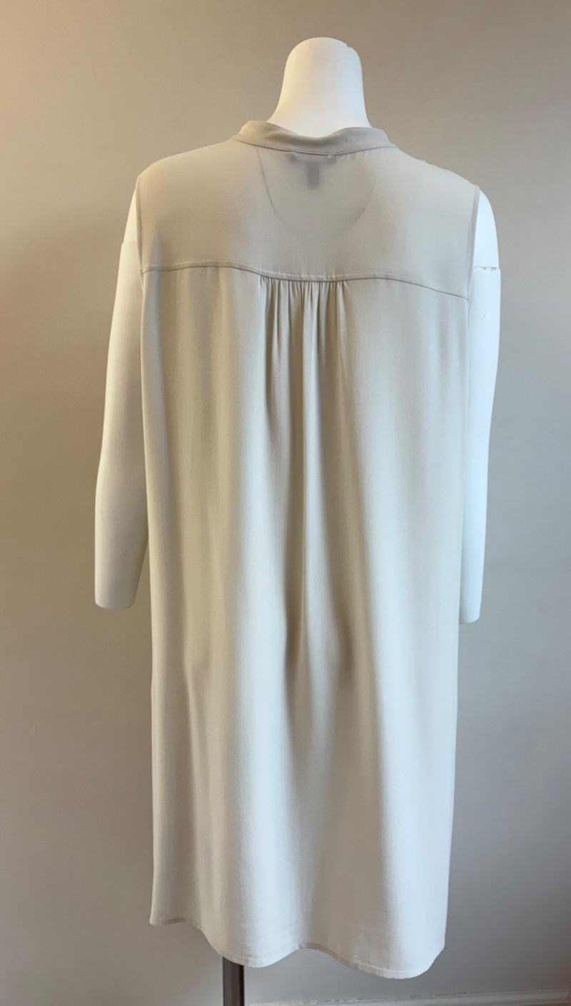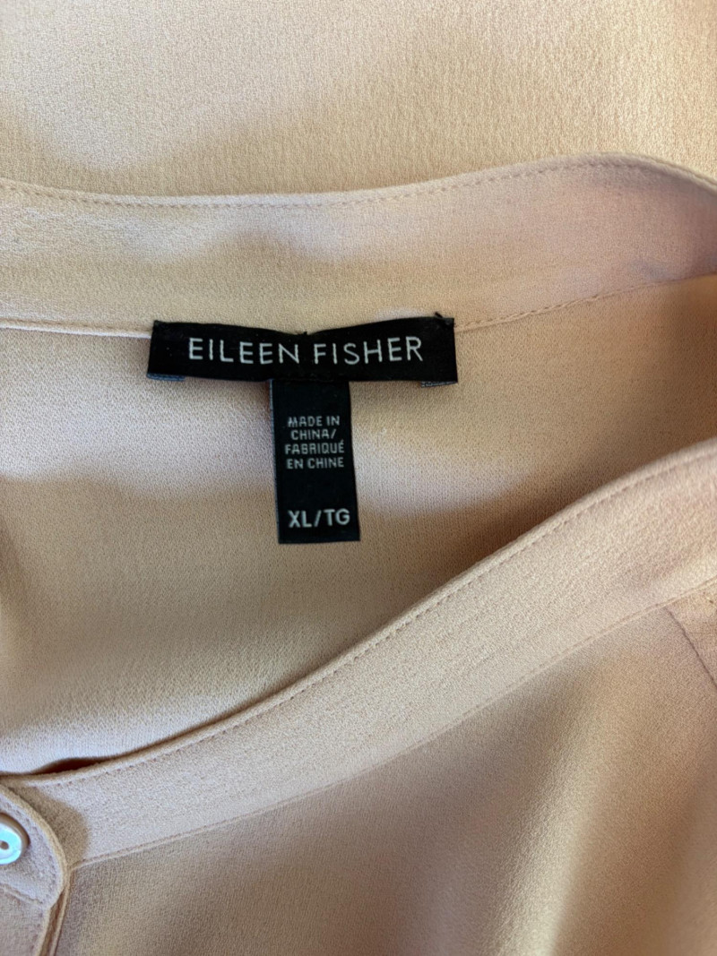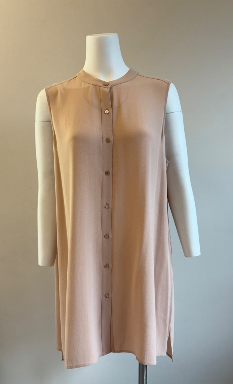 Two elegant 100% silk sleeveless tunics from Eileen Fisher - they are identical in size and design with one in pale pink and the other in ivory. They have button front closures with placket, topstitching along many seams, band collars, gathering below the back yokes, and split hems. The back hems are approx. 3" longer than the front hems. Both are in excellent condition with the exception of a small discoloration on the collar of the ivory tunic that may launder out - see last photo. They measure 24" to pit and 34" from center back neck seam to back hemline. Size tags say 1X.