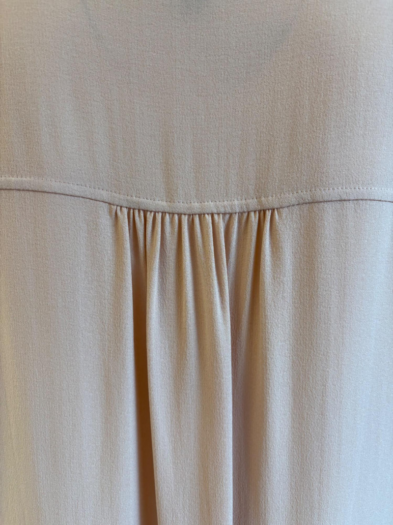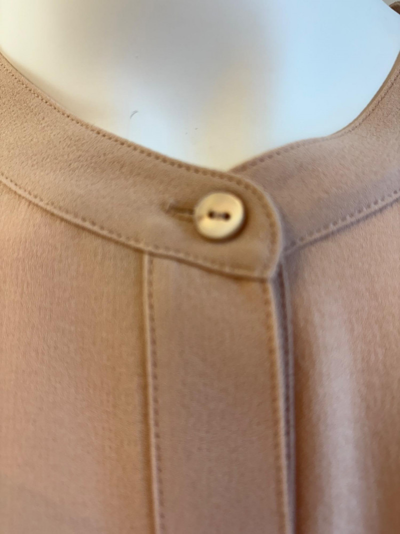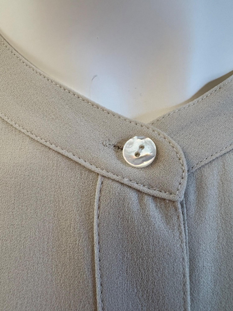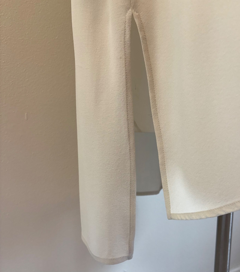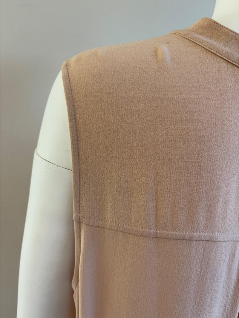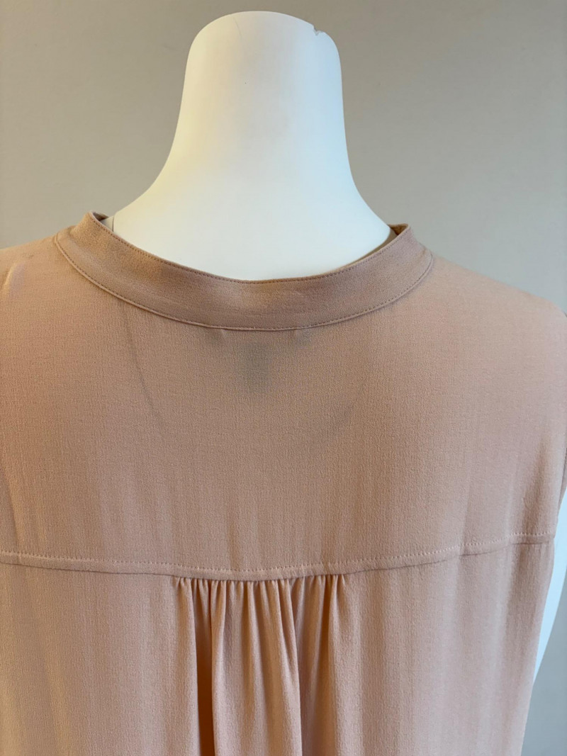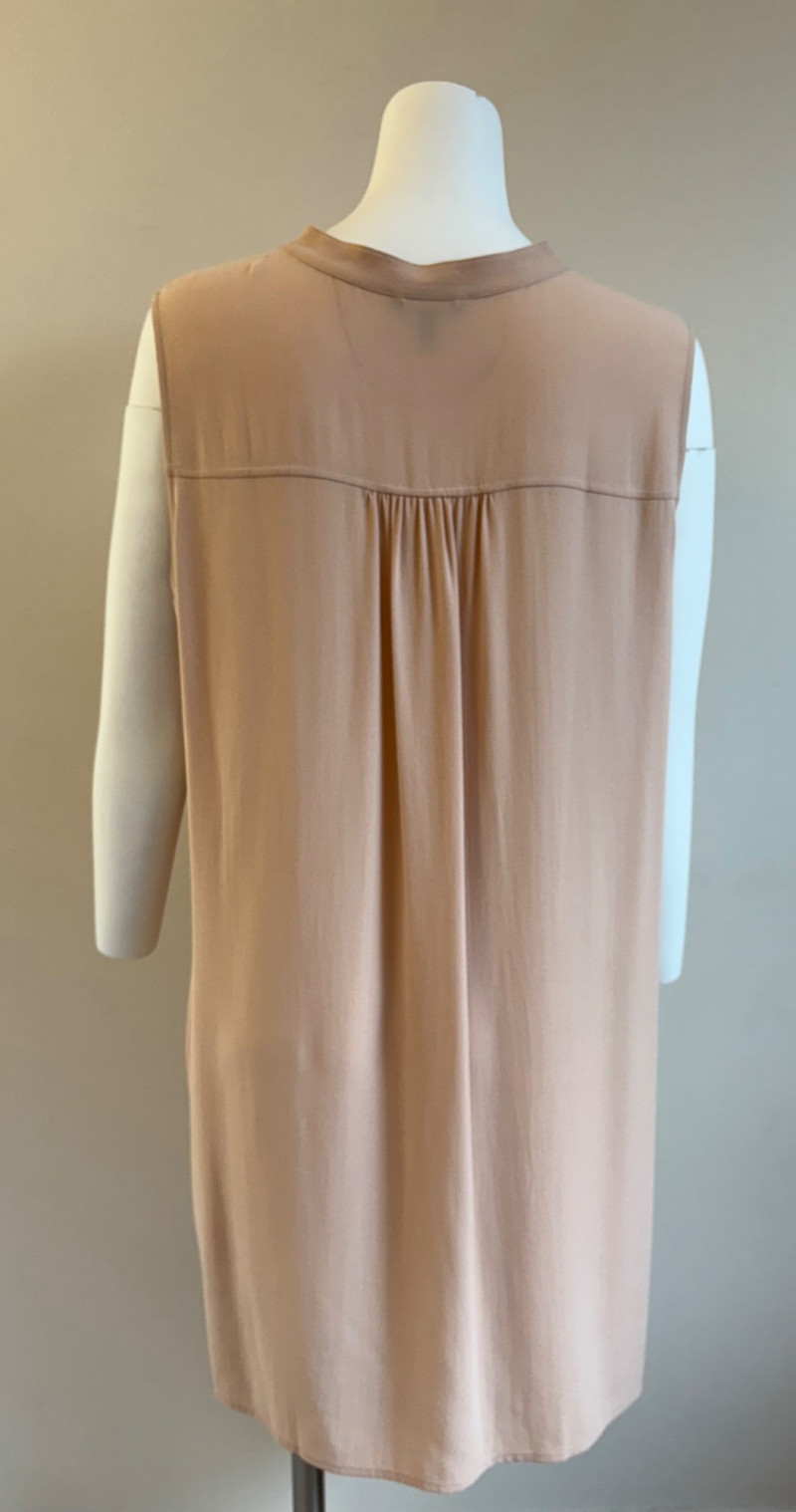 Two elegant 100% silk sleeveless tunics from Eileen Fisher - they are identical in size and design with one in pale pink and the other in ivory. They have button front closures with placket, topstitching along many seams, band collars, gathering below the back yokes, and split hems. The back hems are approx. 3" longer than the front hems. Both are in excellent condition with the exception of a small discoloration on the collar of the ivory tunic that may launder out - see last photo. They measure 24" to pit and 34" from center back neck seam to back hemline. Size tags say 1X.