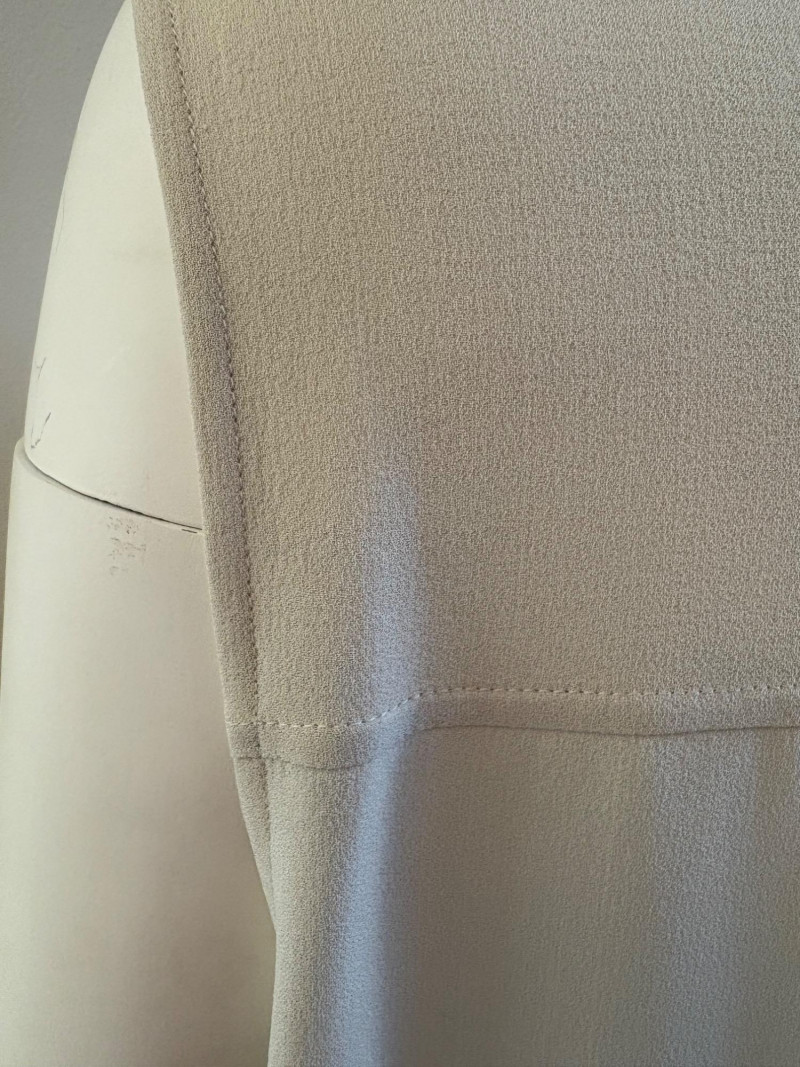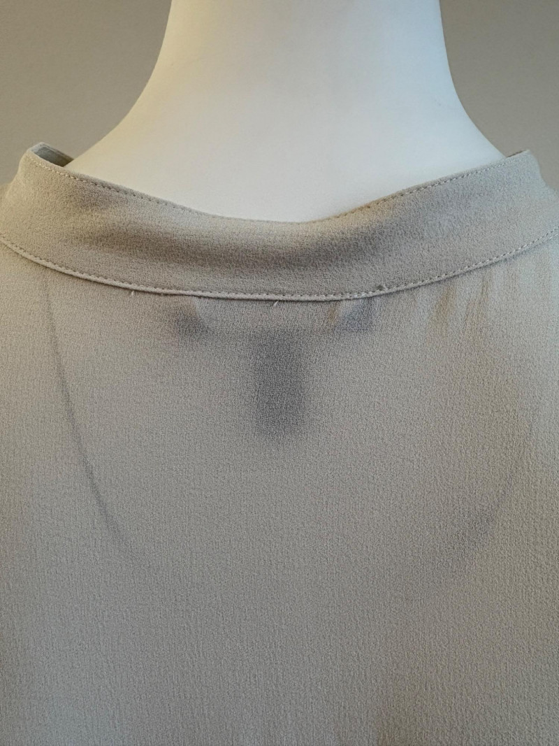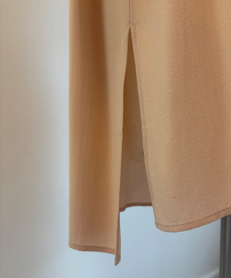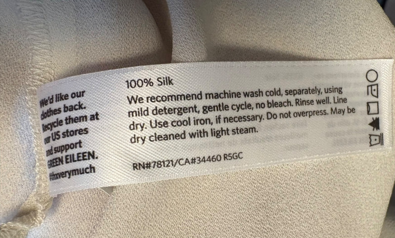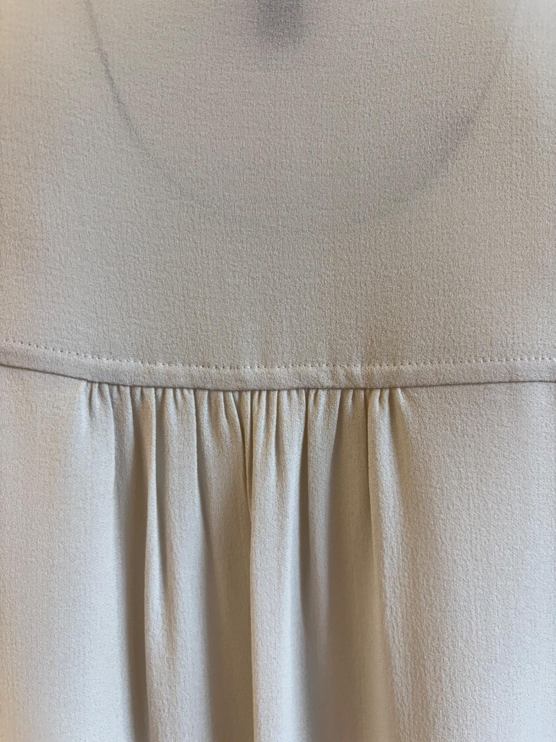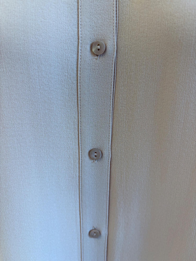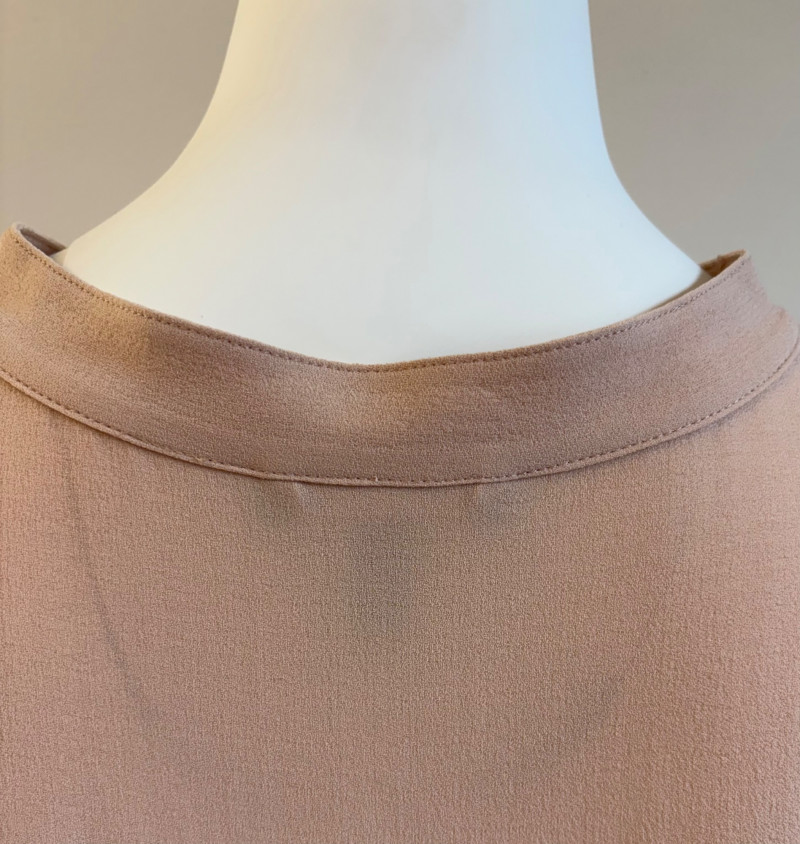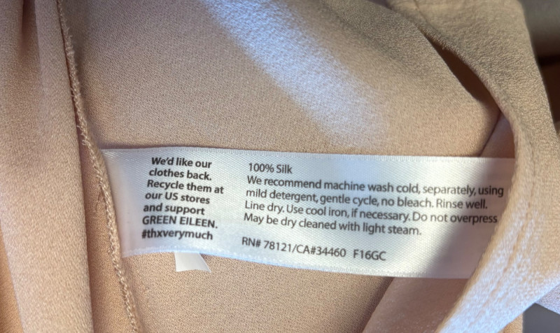 Two elegant 100% silk sleeveless tunics from Eileen Fisher - they are identical in size and design with one in pale pink and the other in ivory. They have button front closures with placket, topstitching along many seams, band collars, gathering below the back yokes, and split hems. The back hems are approx. 3" longer than the front hems. Both are in excellent condition with the exception of a small discoloration on the collar of the ivory tunic that may launder out - see last photo. They measure 24" to pit and 34" from center back neck seam to back hemline. Size tags say 1X.