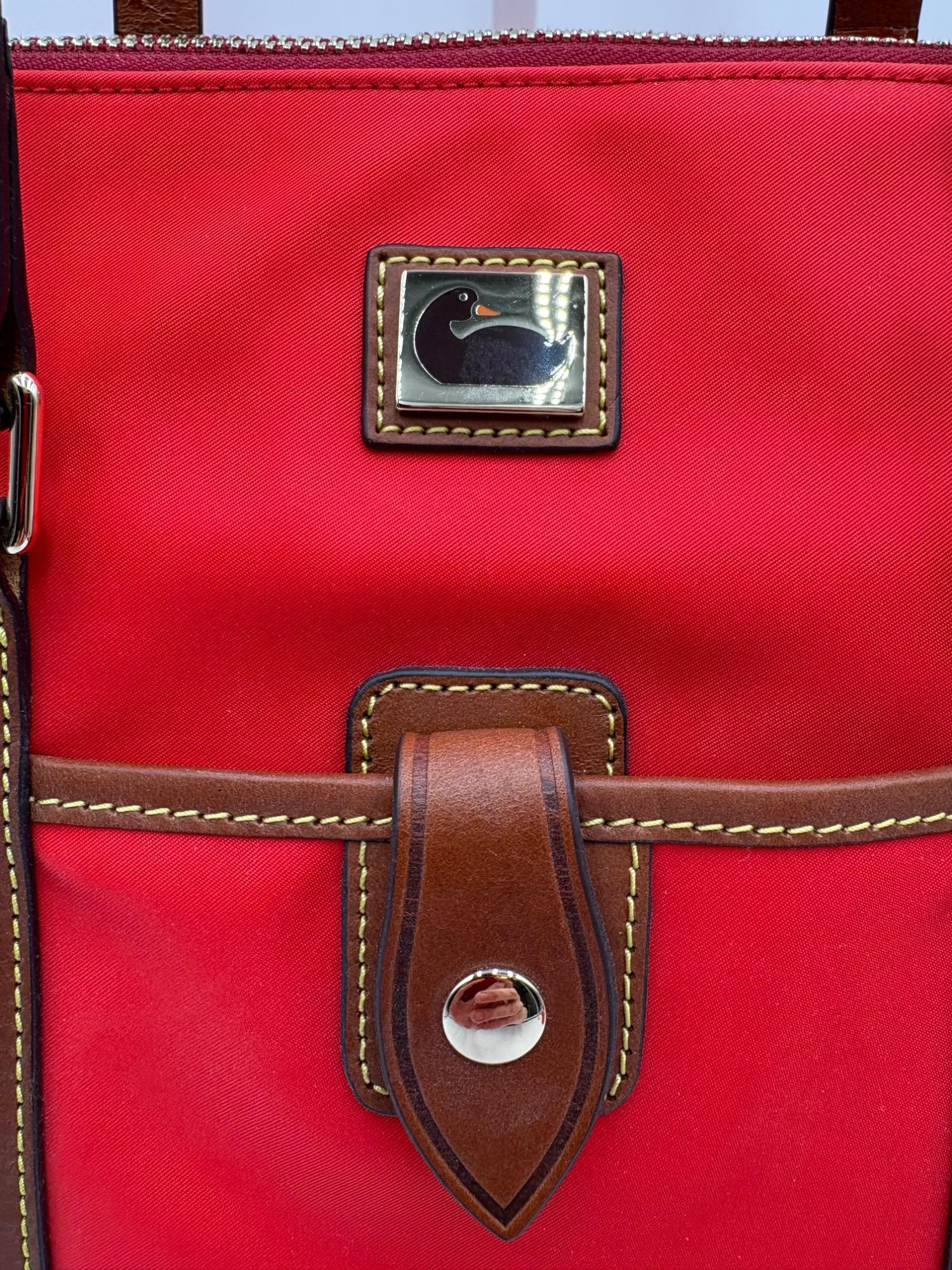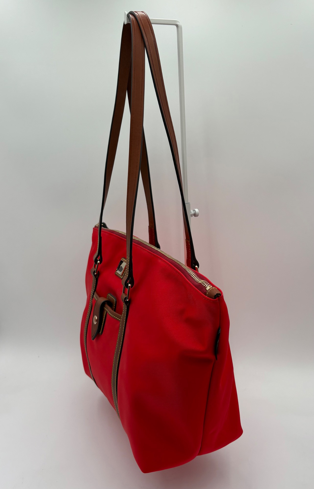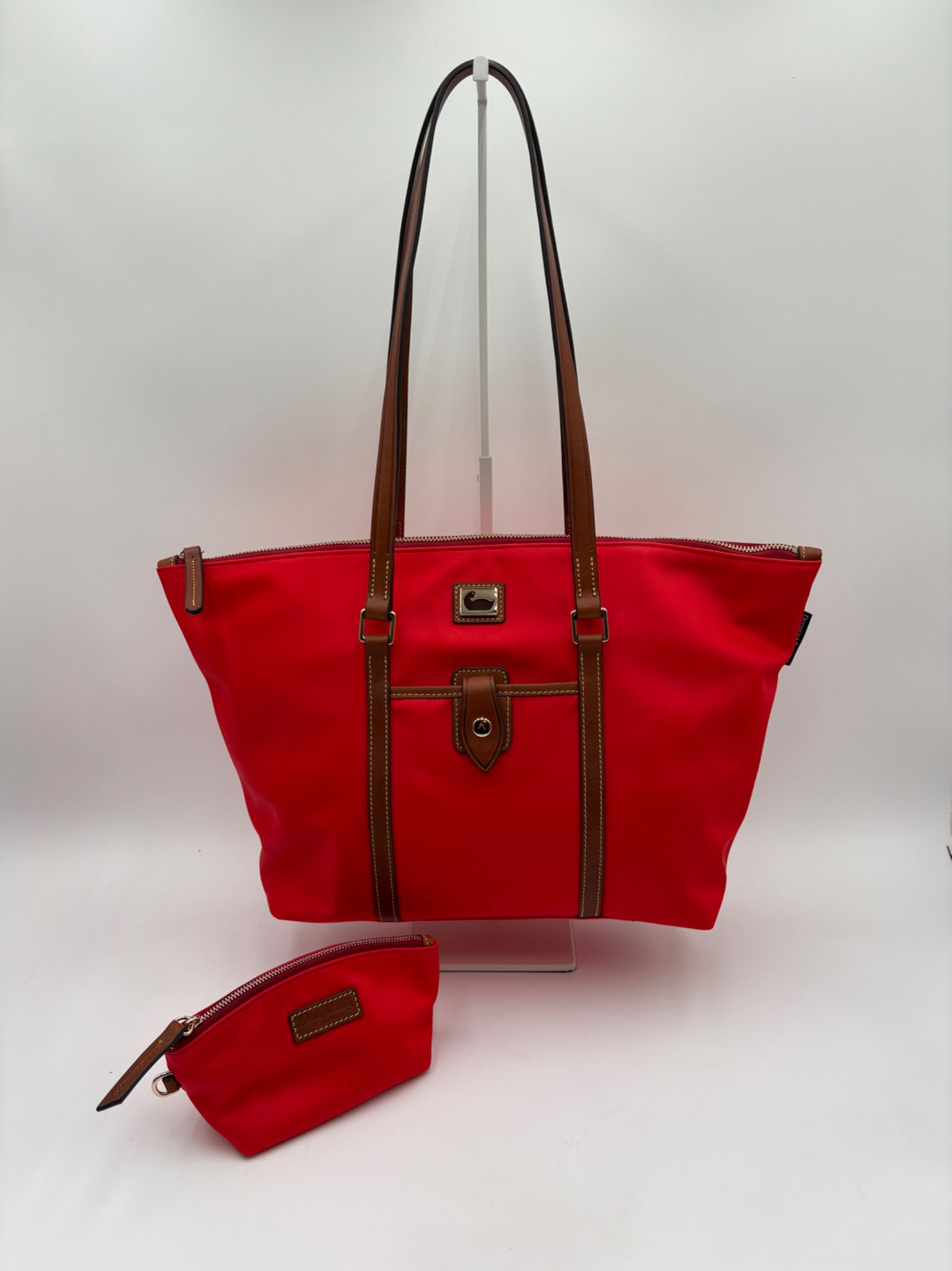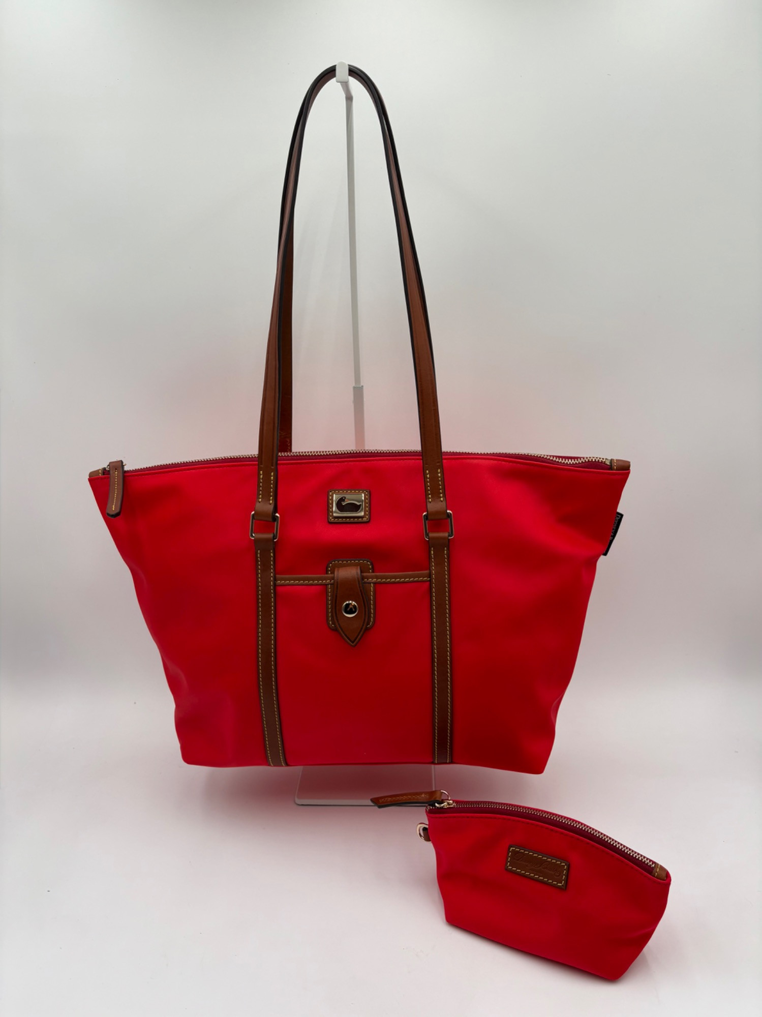 Tote-style handbag and matching small companion bag from Dooney & Bourke. Red bag has a nylon exterior, blue & white cotton lining, and brown leather trim with yellow stitching. It also has one exterior snap close pocket, multiple interior pockets, and a safety strap for included smaller zip-close bag. Dooney & Bourke logo plate on large bag exterior with leather logo labels on the inside of the larger bag and exterior of the smaller bag. Appears to be new - no signs of wear or use noted and warranty registration card is still in zipper pocket. Large bag measures 11.5" H x 11.5" W with 11" drop from top of straps to top center of the bag. Small bag measures 4" H x 5" W at base. .