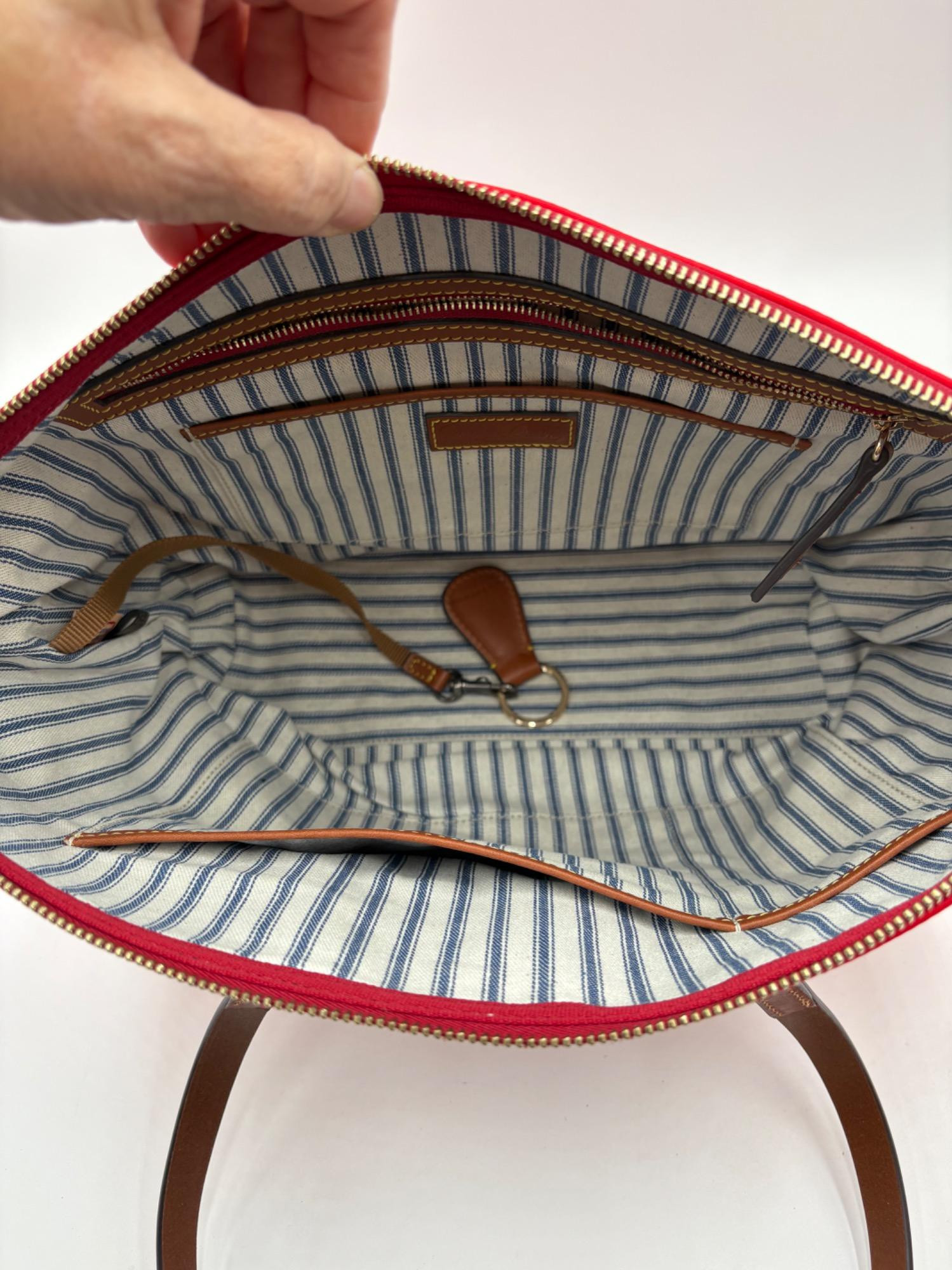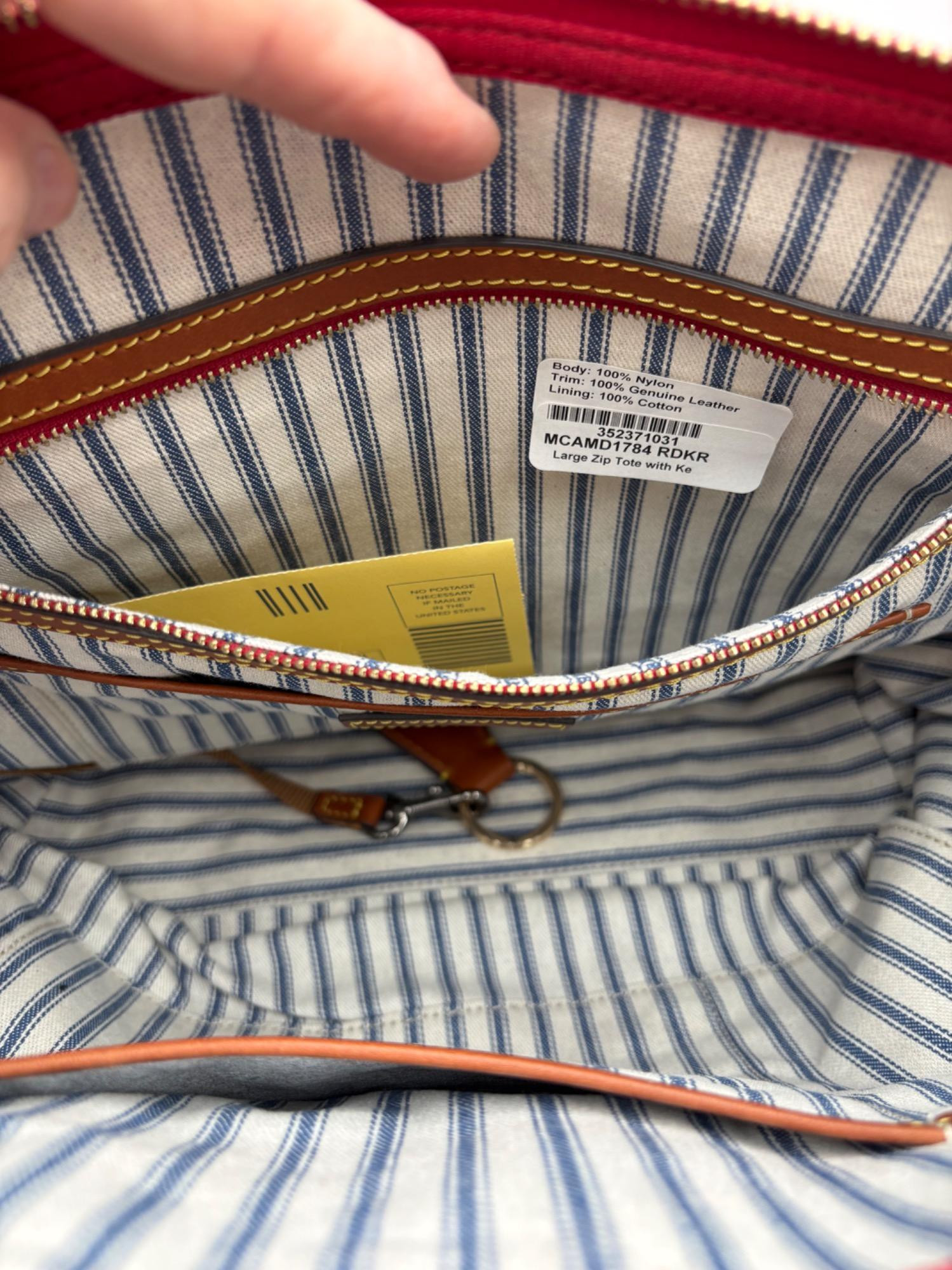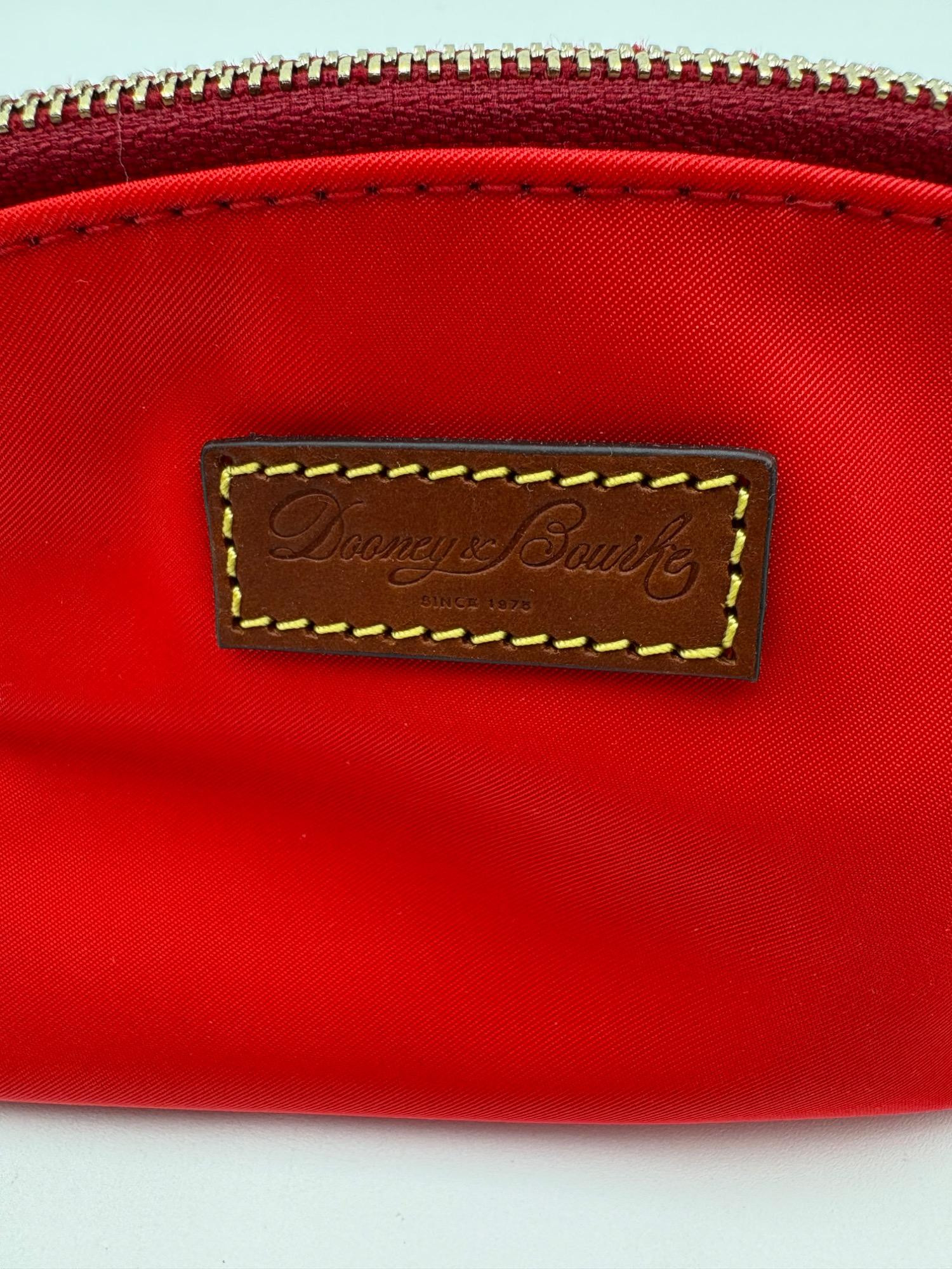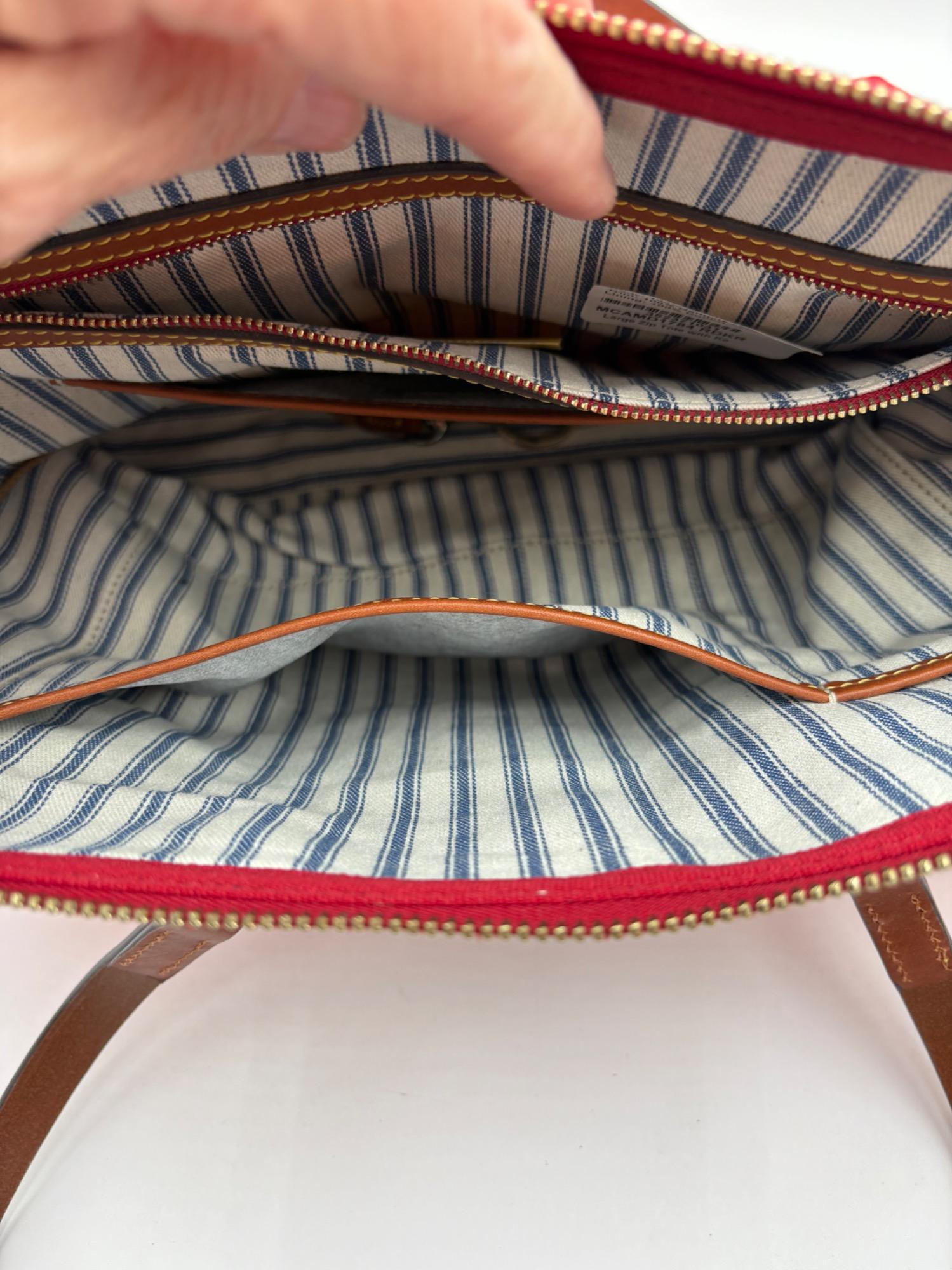 Tote-style handbag and matching small companion bag from Dooney & Bourke. Red bag has a nylon exterior, blue & white cotton lining, and brown leather trim with yellow stitching. It also has one exterior snap close pocket, multiple interior pockets, and a safety strap for included smaller zip-close bag. Dooney & Bourke logo plate on large bag exterior with leather logo labels on the inside of the larger bag and exterior of the smaller bag. Appears to be new - no signs of wear or use noted and warranty registration card is still in zipper pocket. Large bag measures 11.5" H x 11.5" W with 11" drop from top of straps to top center of the bag. Small bag measures 4" H x 5" W at base. .