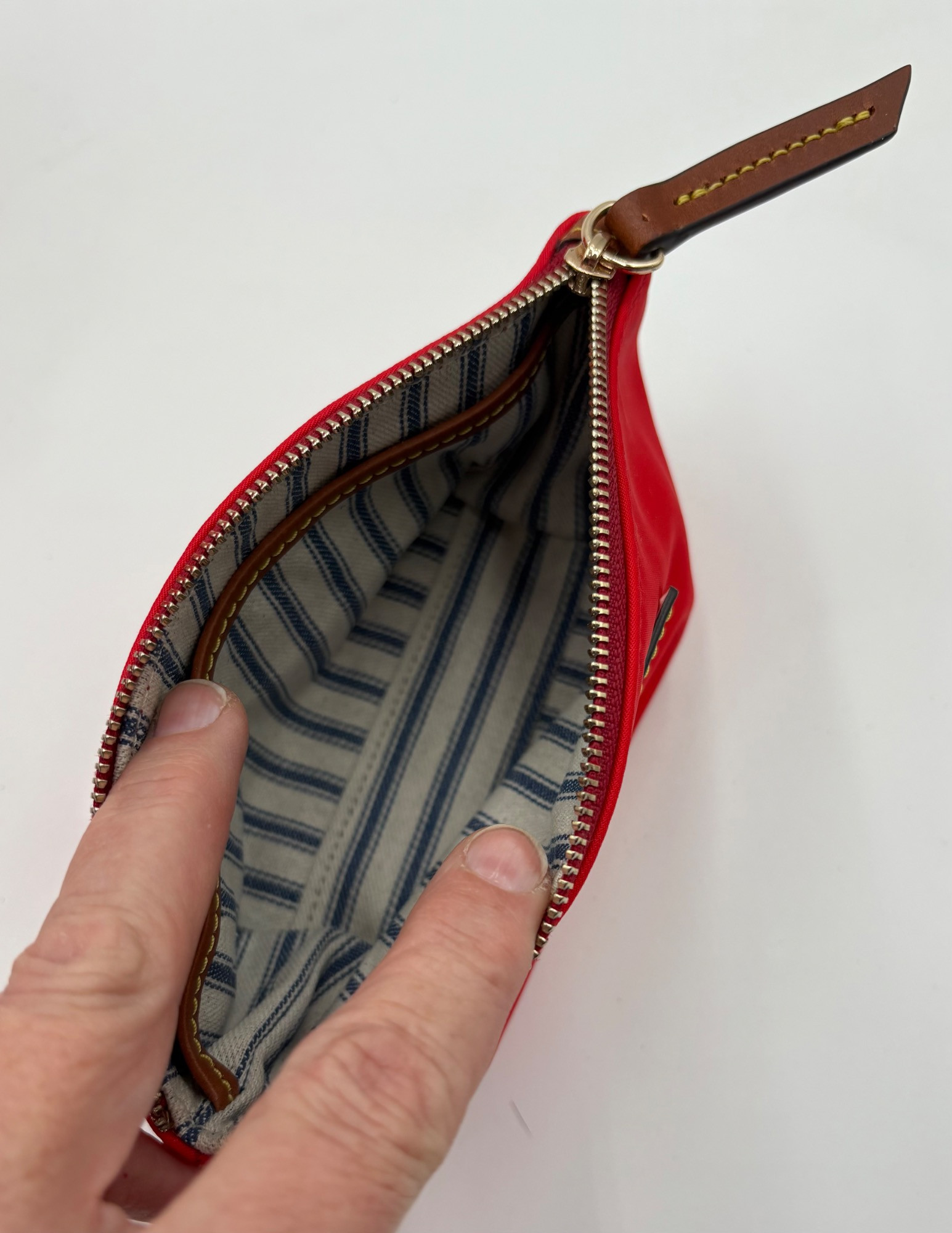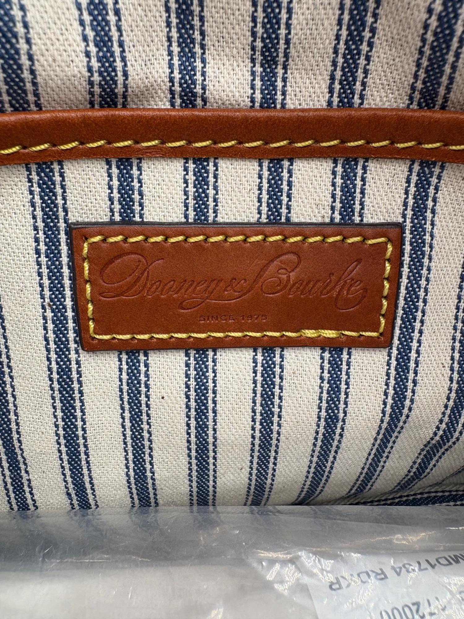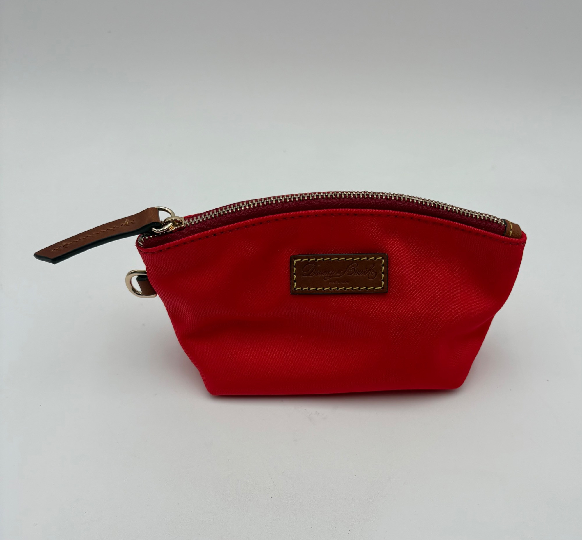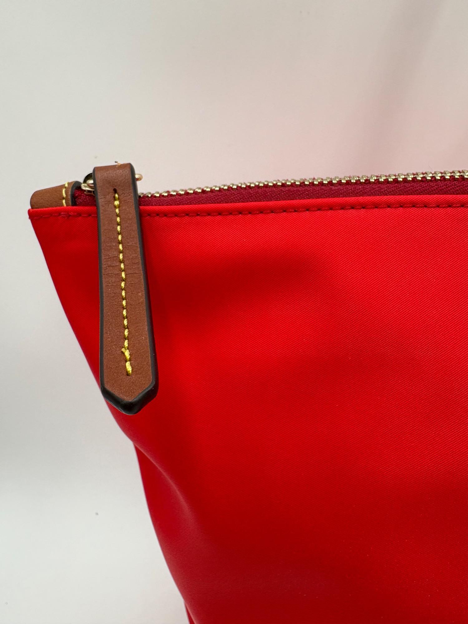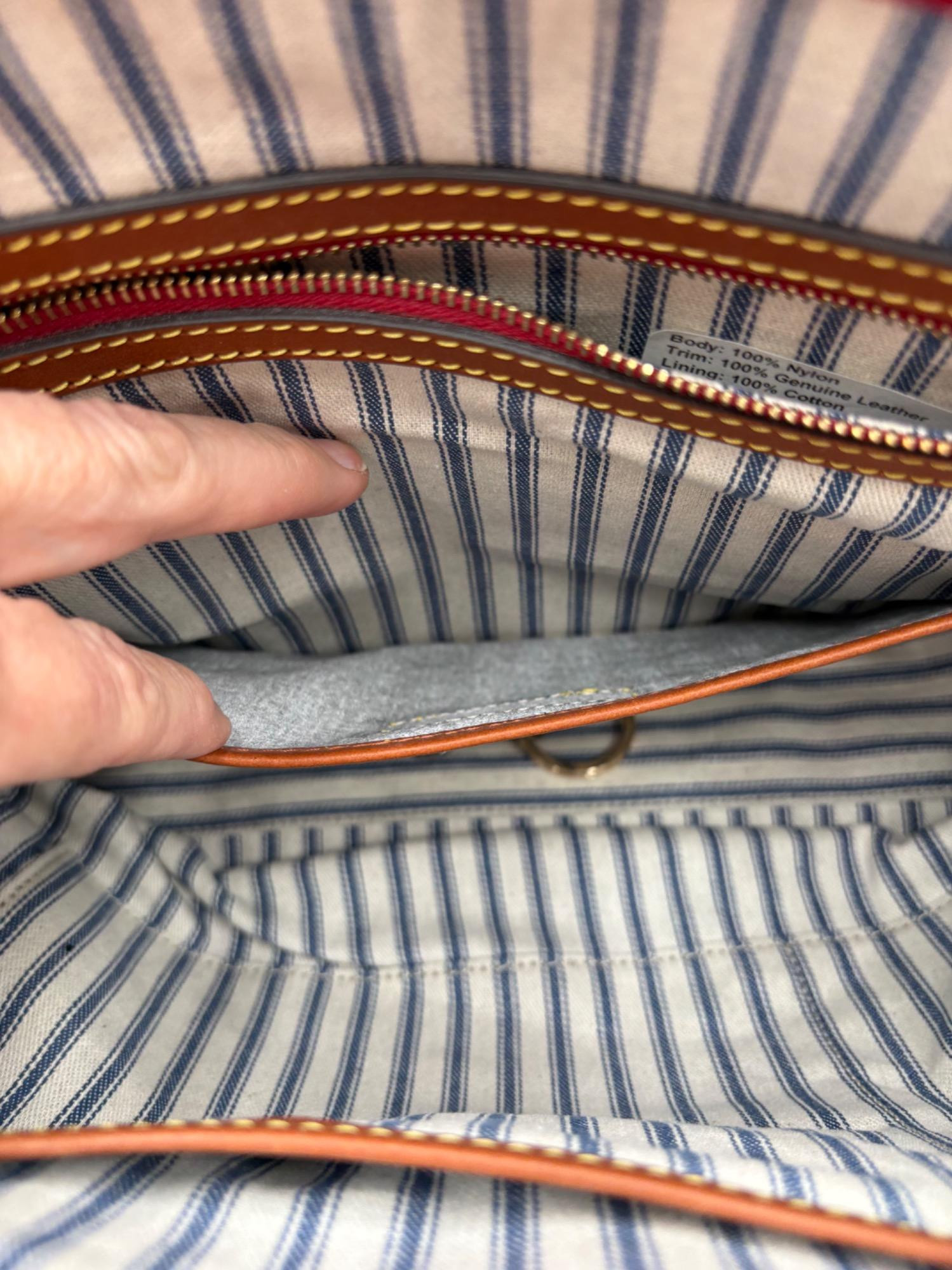 Tote-style handbag and matching small companion bag from Dooney & Bourke. Red bag has a nylon exterior, blue & white cotton lining, and brown leather trim with yellow stitching. It also has one exterior snap close pocket, multiple interior pockets, and a safety strap for included smaller zip-close bag. Dooney & Bourke logo plate on large bag exterior with leather logo labels on the inside of the larger bag and exterior of the smaller bag. Appears to be new - no signs of wear or use noted and warranty registration card is still in zipper pocket. Large bag measures 11.5" H x 11.5" W with 11" drop from top of straps to top center of the bag. Small bag measures 4" H x 5" W at base. .