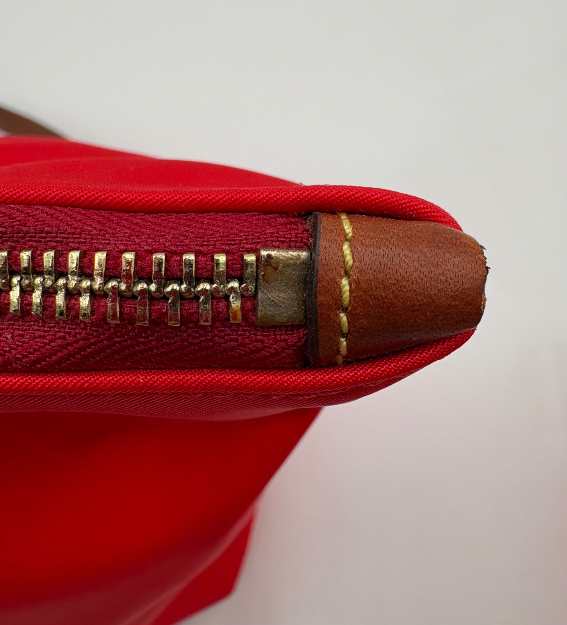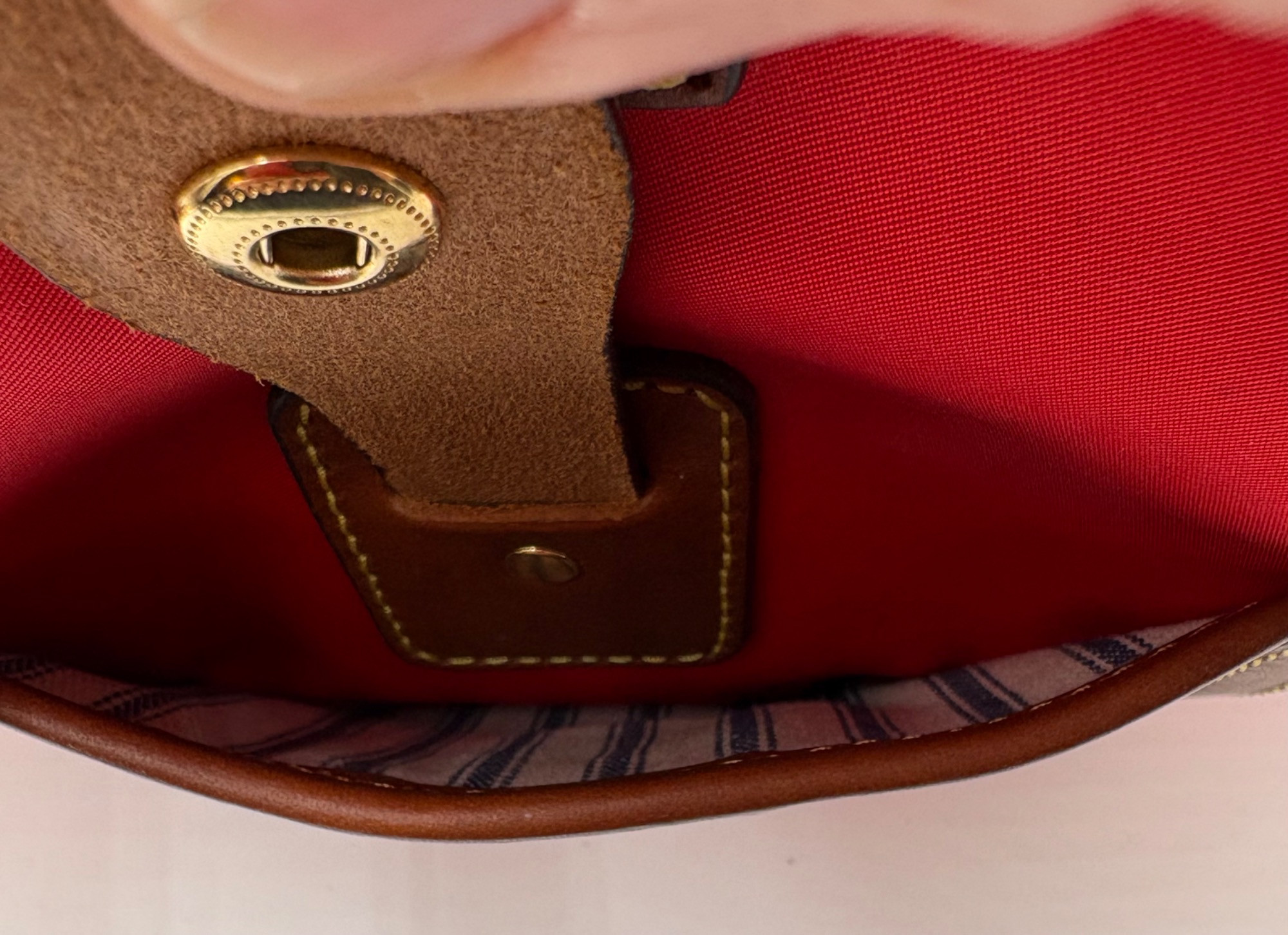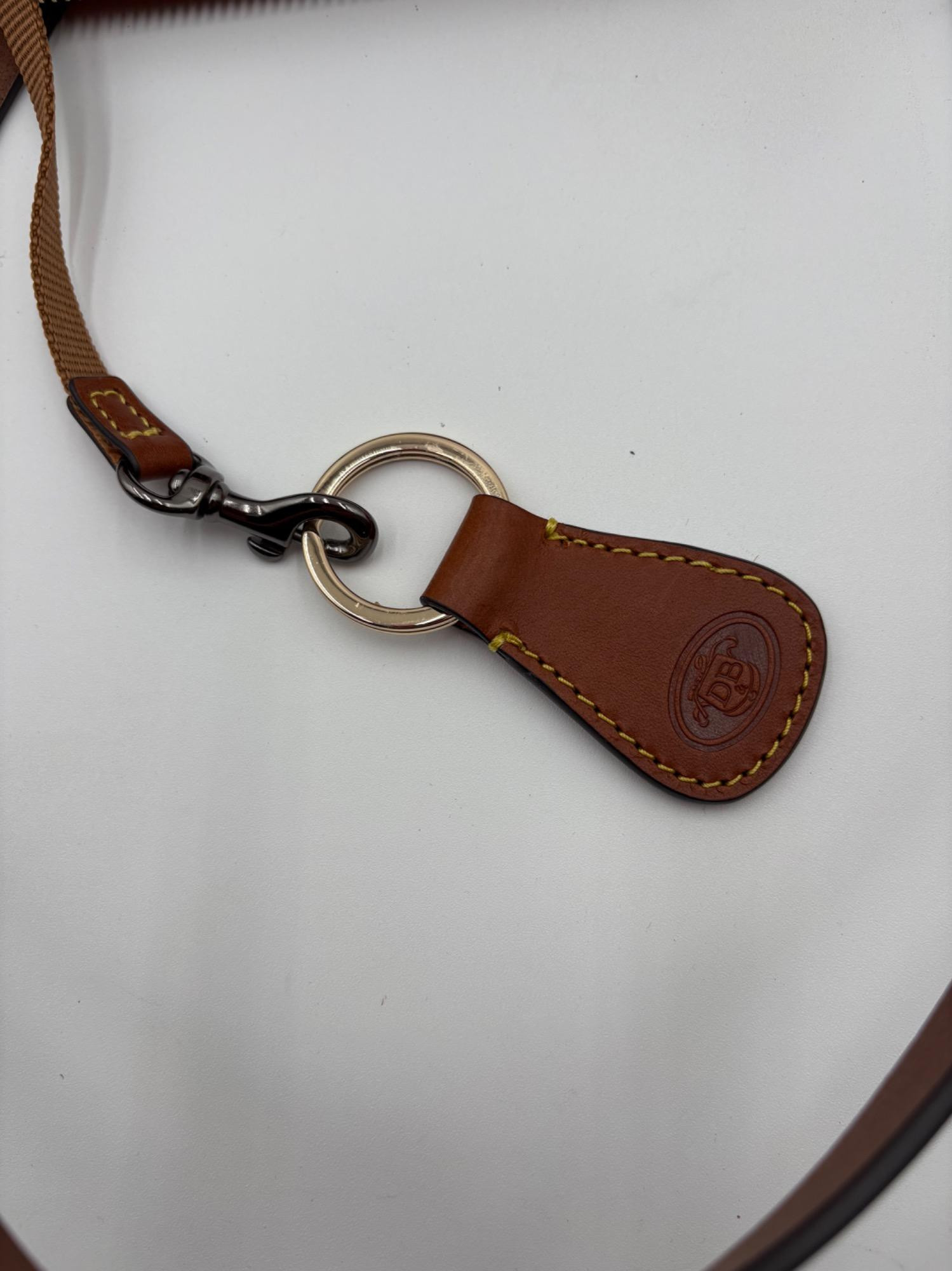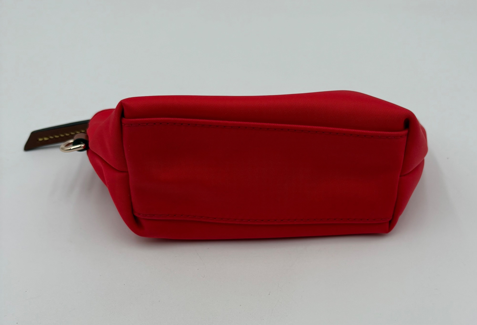 Tote-style handbag and matching small companion bag from Dooney & Bourke. Red bag has a nylon exterior, blue & white cotton lining, and brown leather trim with yellow stitching. It also has one exterior snap close pocket, multiple interior pockets, and a safety strap for included smaller zip-close bag. Dooney & Bourke logo plate on large bag exterior with leather logo labels on the inside of the larger bag and exterior of the smaller bag. Appears to be new - no signs of wear or use noted and warranty registration card is still in zipper pocket. Large bag measures 11.5" H x 11.5" W with 11" drop from top of straps to top center of the bag. Small bag measures 4" H x 5" W at base. .