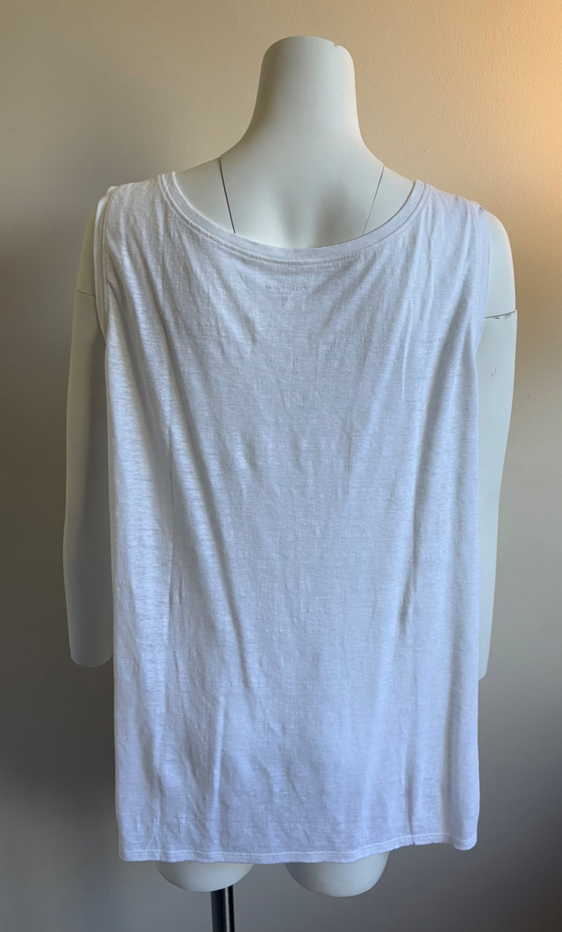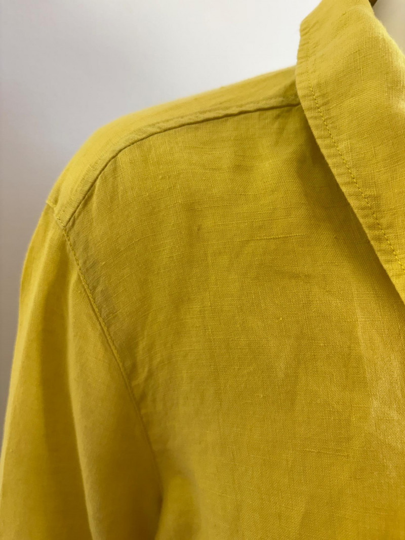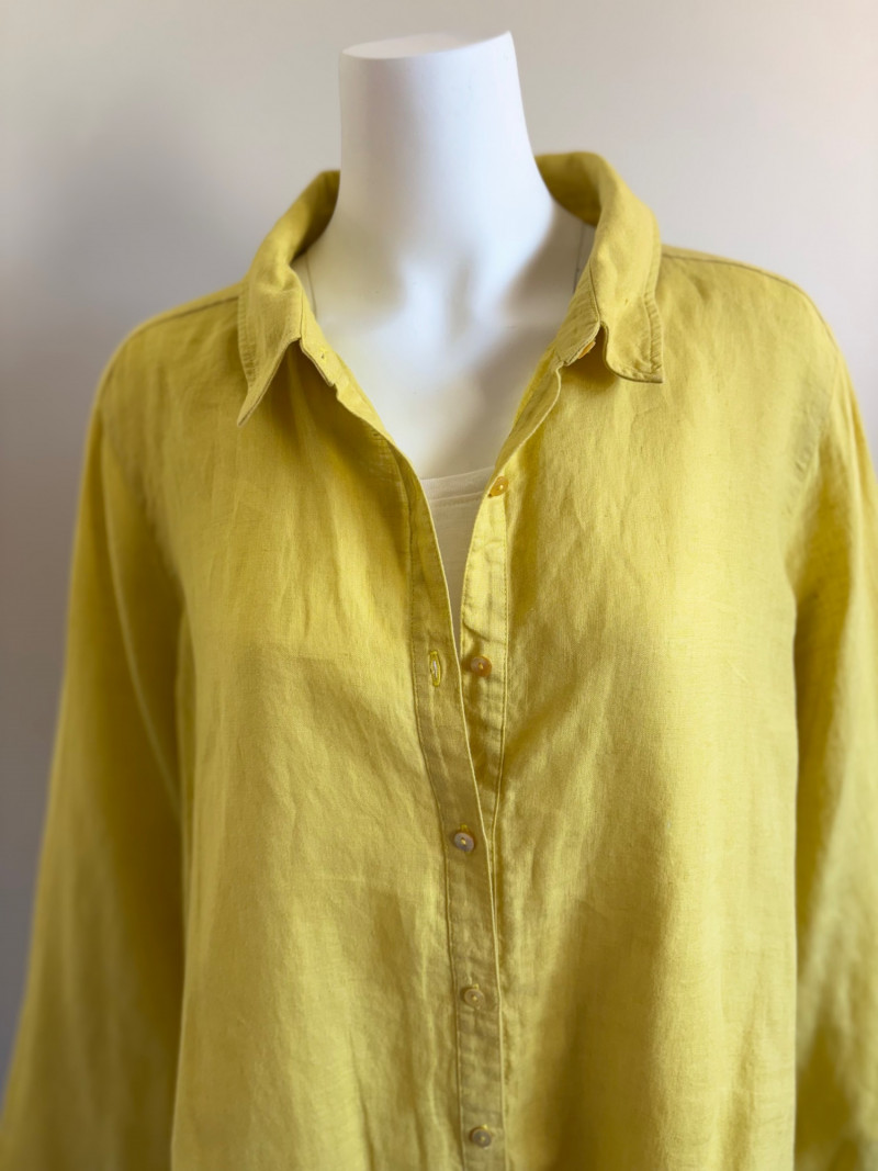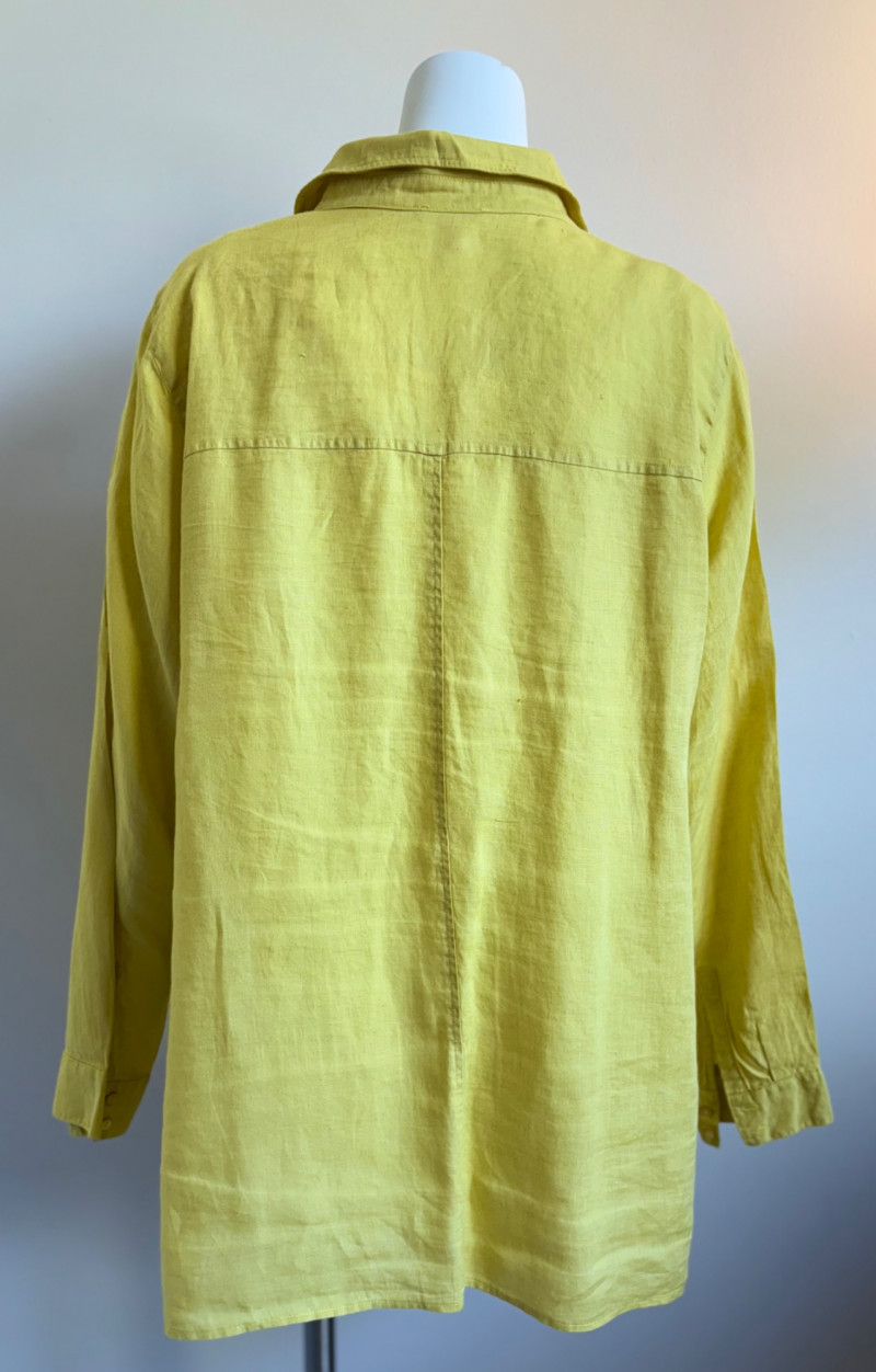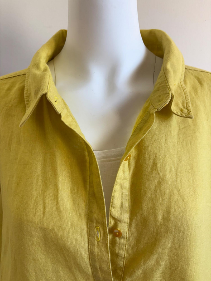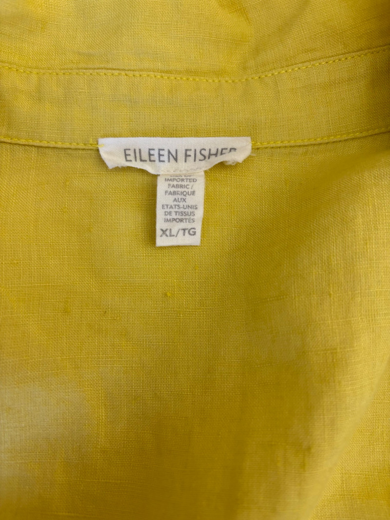 Linen separates from Eileen Fisher. Both 100% linen. Bright acid yellow A-line overshirt with button front closure, button close cuffs, back yoke, and split hem. In excellent condition. Measures 25.5" to pit and 30" from center back neck seam to back hemline. Size tag says XL. White tank has narrow ribbing around neckline and armholes. In excellent condition. Measures 23" pit to pit and 24" from back neckline to bottom back hem. Size tag says 1X.