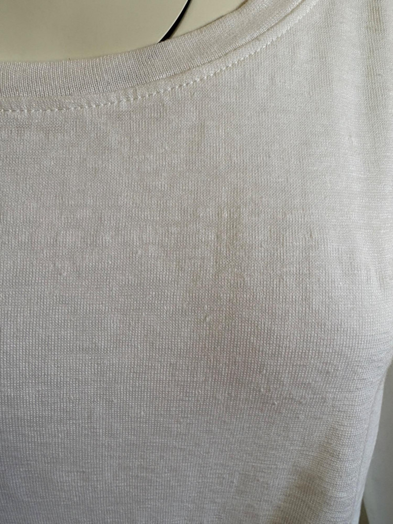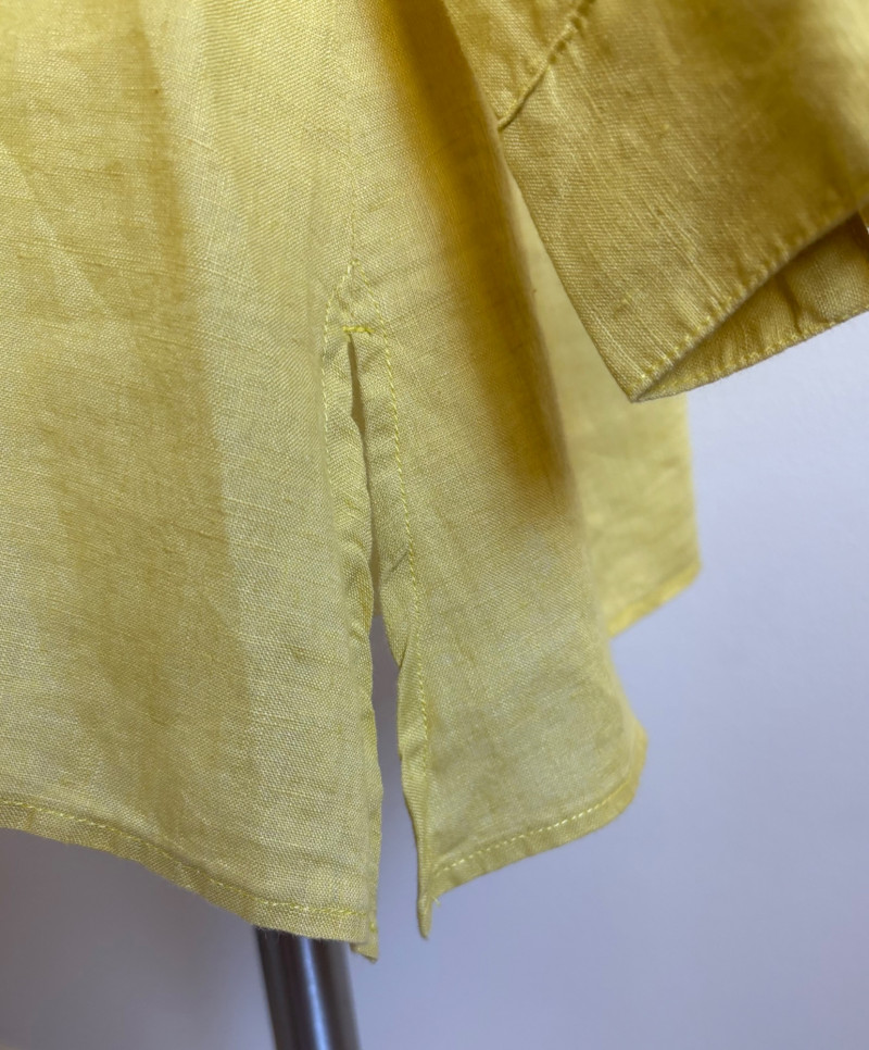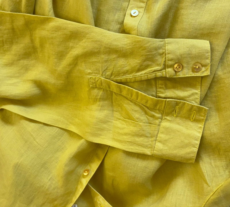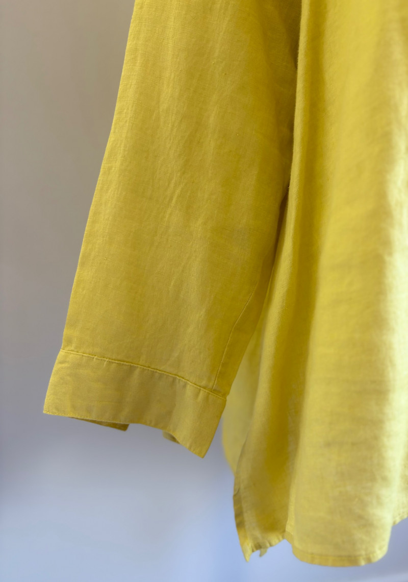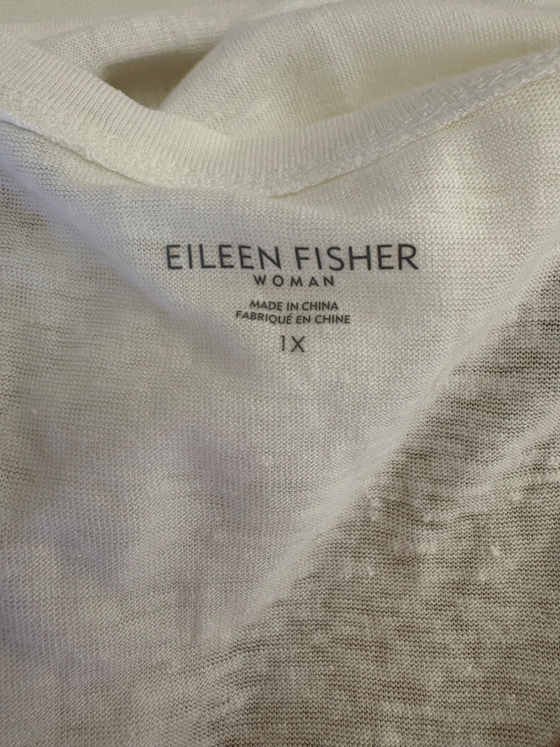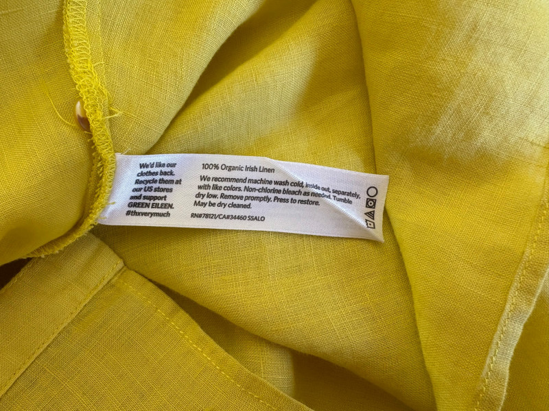 Linen separates from Eileen Fisher. Both 100% linen. Bright acid yellow A-line overshirt with button front closure, button close cuffs, back yoke, and split hem. In excellent condition. Measures 25.5" to pit and 30" from center back neck seam to back hemline. Size tag says XL. White tank has narrow ribbing around neckline and armholes. In excellent condition. Measures 23" pit to pit and 24" from back neckline to bottom back hem. Size tag says 1X.