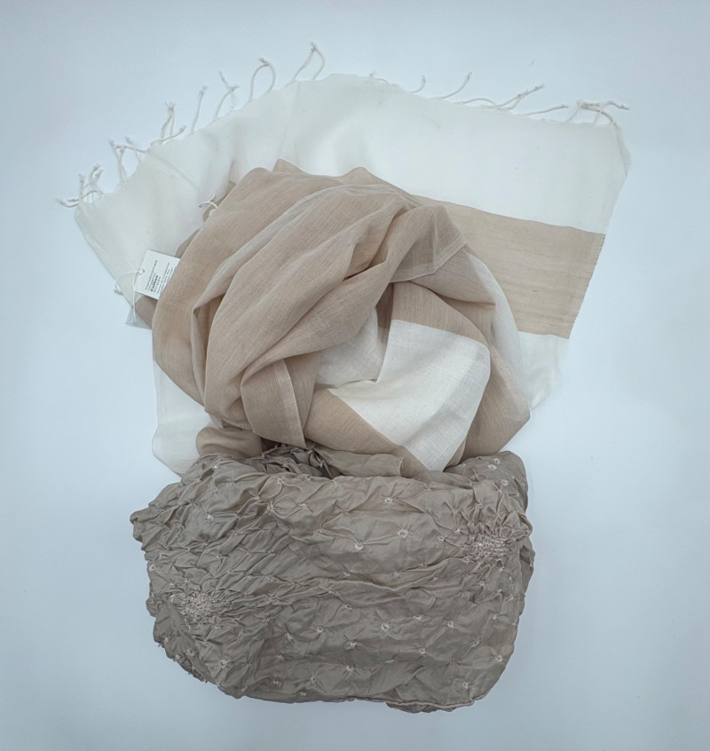 Pair of neutral scarves from Eileen Fisher. Pale beige and light ivory striped scarf with twisted short end fringe. Central block of beige has wide ivory & beige stripes on either side. New with tag. 100% organic cotton. Measures approx. 27" x 82". Neutral beige scarf with a tucked stitch pattern. In excellent condition. No maker or fabric tag, but we believe it is partially or wholly silk by the feel. Measures approx. 18" x 72".