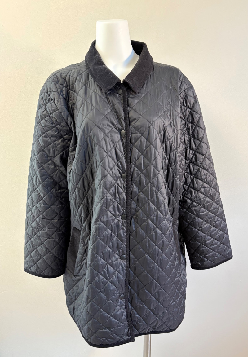 Traditionally-styled black car coat from Eileen Fisher has diamond quilting with black corduroy collar/trim/pocket welts. Snap front closure with welted front pockets. In excellent condition. 100% recycled nylon. Measures 24" pit to pit and 31" from back neck seam to back hemline. Size tag says XL.