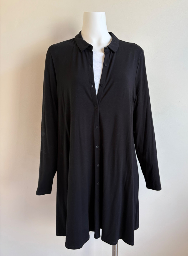 Knit tank & shirt from Eileen Fisher in basic black & white. Scoop neck white shirt has split hem and nubby soft texture. In excellent condition. 100% linen. Measures 22.5" pit to pit and 24" from back neckline to base of hemline. Size tag says XL. Black stretchy shirt/overshirt in smooth soft knit with small collar, button front closure, and back yoke with center pleat. In excellent condition. 95% Viscose with 5% spandex. Measures 22.5" pit to pit and 34" from neckline seam to bottom of back hem. Size tag says XL.