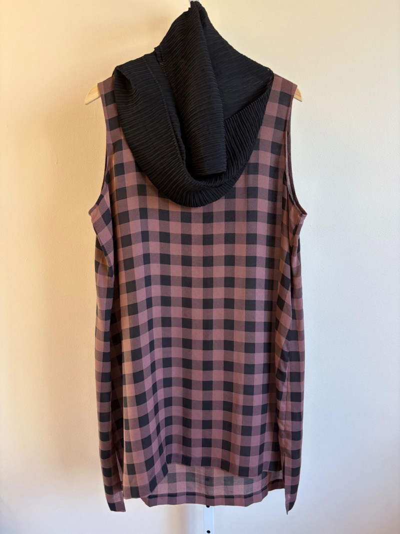 Checked tunic and lovely scarf from Eileen Fisher. Sleeveless tunic with curved neckline in black and pinkish-brown check. Split hem with back approx. 2" longer than front. In excellent condition. 100% silk. Measures 23" pit to pit and 34.5" from scoop back neckline to bottom back hem. Size tag says XL. Pleated rectangular black scarf. In excellent condition. No fabric tag, but feels like a synthetic blend. Measures approx. 16" x 62".