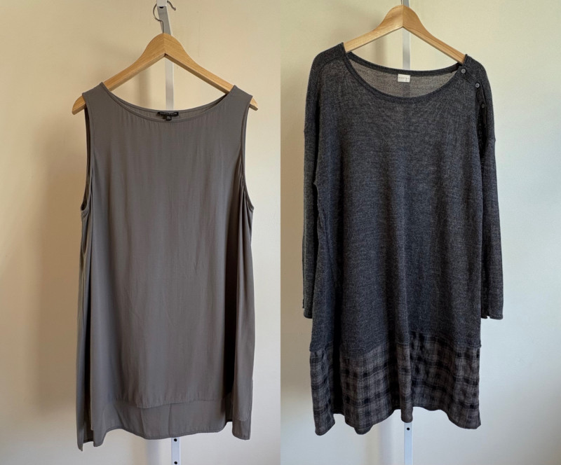 Two grey pieces; one more casual & one more dressy from Eileen Fisher & Poetry. Grey lightweight knit dress from Poetry has straight lines, button shoulder closure, split hem & cuffs, and black & grey plaid horizontal border at hem with a horizontal point on the right. In good condition. Knit top part of dress is 100% alpaca while the plaid border trim is 72% wool with 15% viscose and 13% polyester. Measures 23" pit to pit and 34" from back neckline to bottom back hem. Size tag says 16. Medium grey tunic from Eileen Fisher has rounded neck and split hem with lower hem about 3" longer than the front hem. In excellent condition. 100% silk. Measures 22.5" pit to pit and 32" from center back neckline to back center hemline. Size tag says XL.