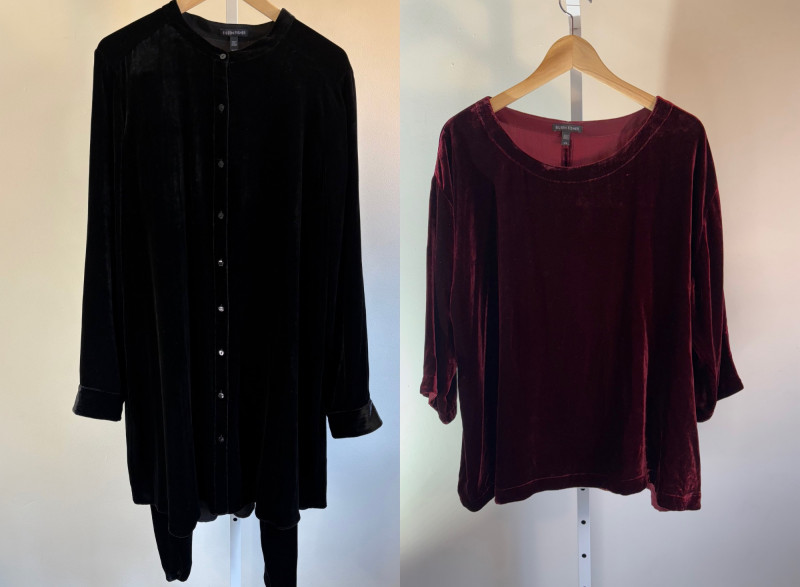 Three dressy but comfortable pieces in velvet blends from Eileen Fisher.* Dressy black velvet duo is perfect for special occasions, dress it up or dress it down with the scarf of your choice. Tunic top has a banded collar with button front closure, 1-button sleeve placket, and 2-button cuff. 82% rayon with 18% silk. In good used condition.* Measures 24" pit to pit by 36" from center back neck seam to bottom back hem. Size tag says XL. Pants have elasticated waistband and set-in lined front pockets. 80% viscose with 20% silk. In good used condition. Measure 19.5" side to side at waist with a 27" inseam. Deep red/burgundy velvet top has curved neckline, dropped shoulder seams, and curved back hem. In good used condition. 82% rayon with 18% silk. Measures 25" pit to pit and 25" from neck edge to bottom hem. Size tag says L/G. *Please note that velvet blends are very hard to photograph because of light reflected in the nap. "Flat" areas in the photo are much less noticeable IRL. However, the pieces do show use - the black ones in particular. Please see last photo.