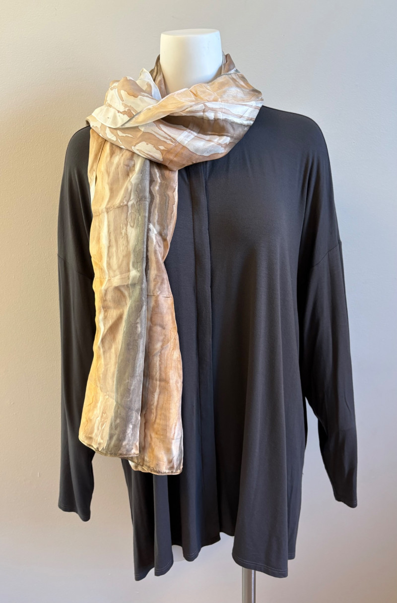 Knit top and silk scarf from Eileen Fisher. Medium gray smooth knit top has long sleeves, button front closure with hidden placket, small collar, and split hem. In excellent condition. 95% viscose with 5% spandex. Measures 26.5" pit to pit and 29" from back neckline seam to bottom hem. Size tag says XL. Neutral tone scarf in cream, beige, and brown ink wash pattern. In great condition. 100% silk. Measures approximately 21" X 75".