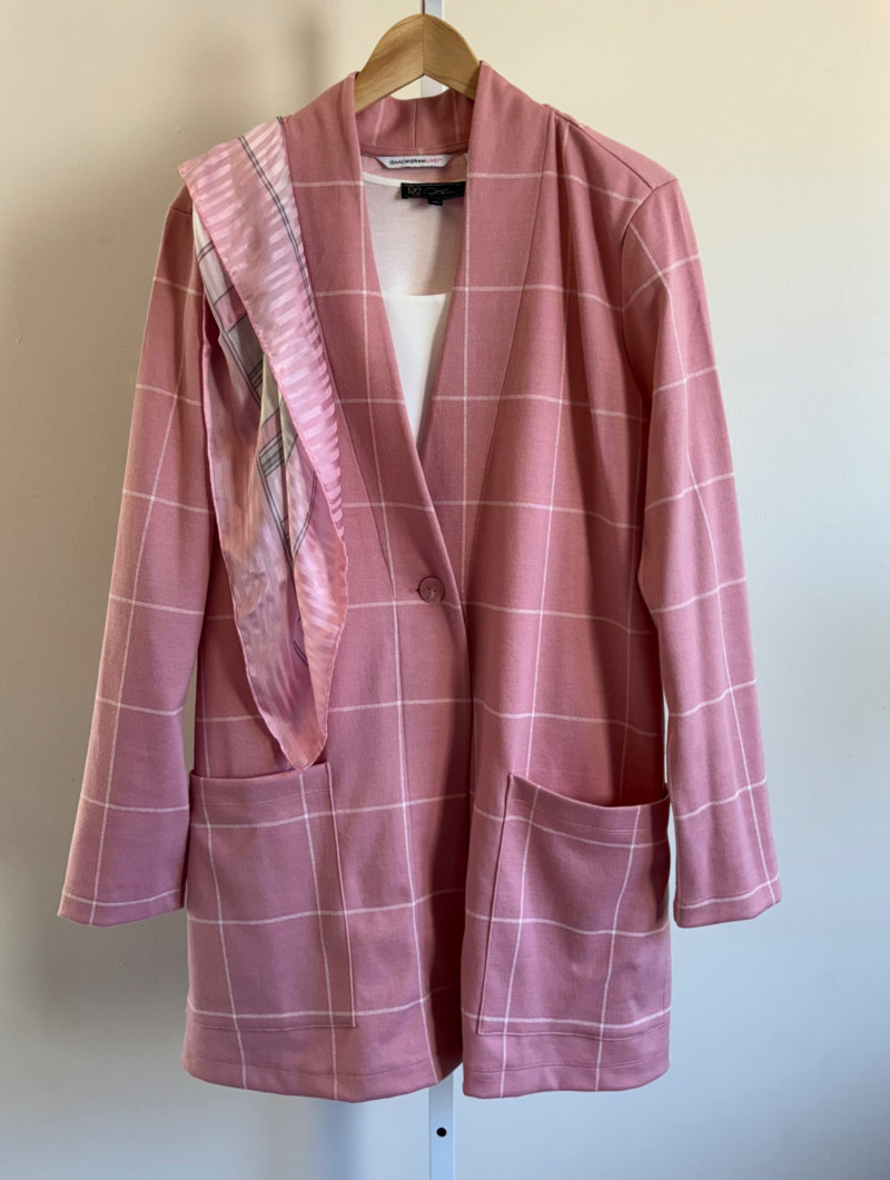 Pink & white plaid collarless jacket in heavy knit from Isaac Mizrahi. Front patch pockets with single button closure. Soft to the touch and heavy enough to hold its shape. In good condition. 74% polyester with 23% cotton and 3% spandex. Measures 25.5" pit to pit and 31" from center back neck seam to back hemline. Size tag says XL. White shell from Diane Gilman. Sleeveless double-front panel to prevent see-through with stepped hem. Back section is stretch for more accommodating fit. Front is 100% polyester, back is polyester spandex blend. In excellent condition. Measures 24" to pit and 25.5" from center back neckline to bottom of back hemline. Size tag 1X. Scarf in pink, gray, and white matches the outfit beautifully and adds a bit of panache. No maker or fabric tag. Scarf measures approximately 32“ x 32“ and is in good used condition with one noticeable discoloration that may launder out - see last photo.